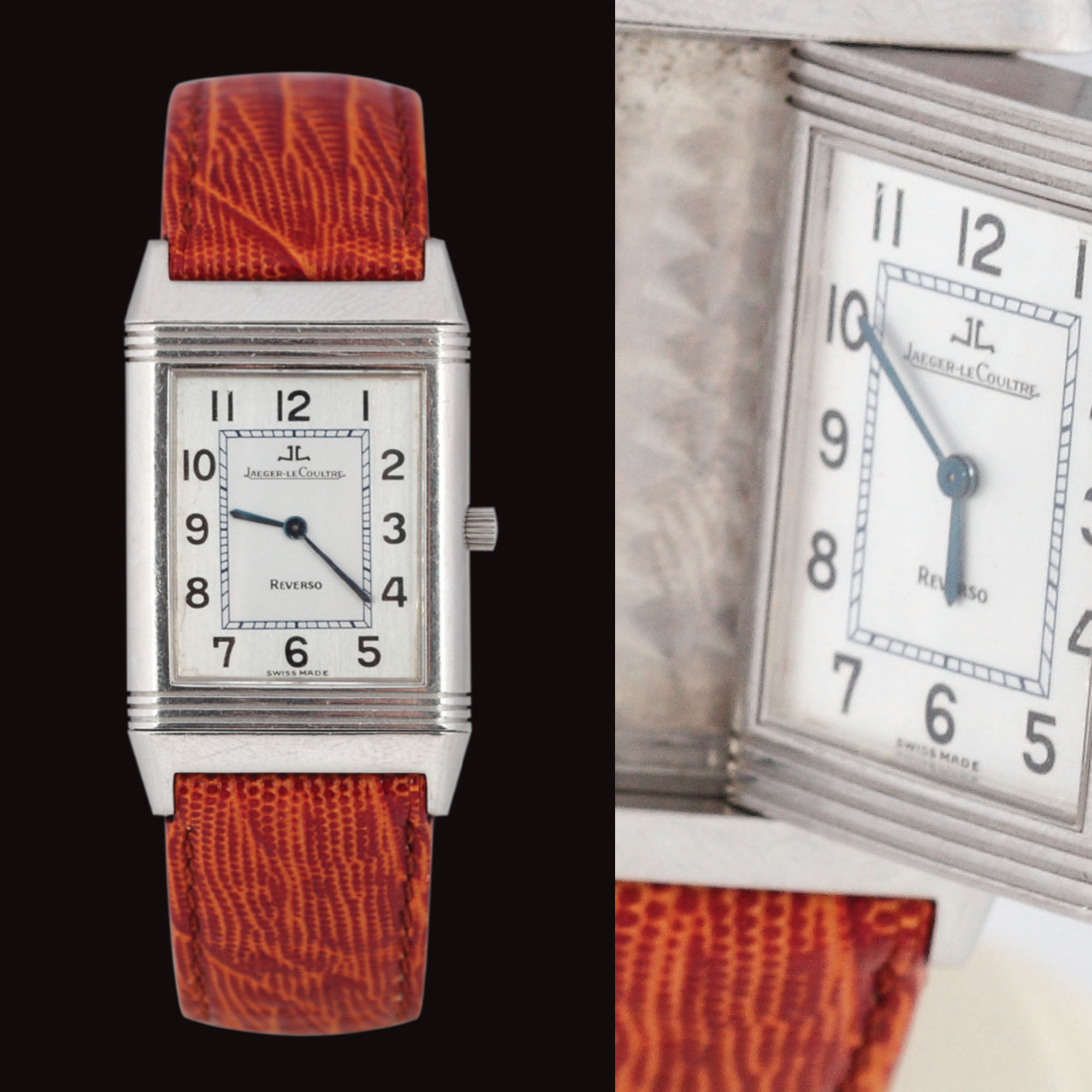 Ceas de mână Jaeger-LeCoultre, model Reverso, în carcasă din oțel cu posibilitatea răsucirii fețelor ceasului, mecanism quartz, partea ascunsă rezervată pentru dedicații gravate.