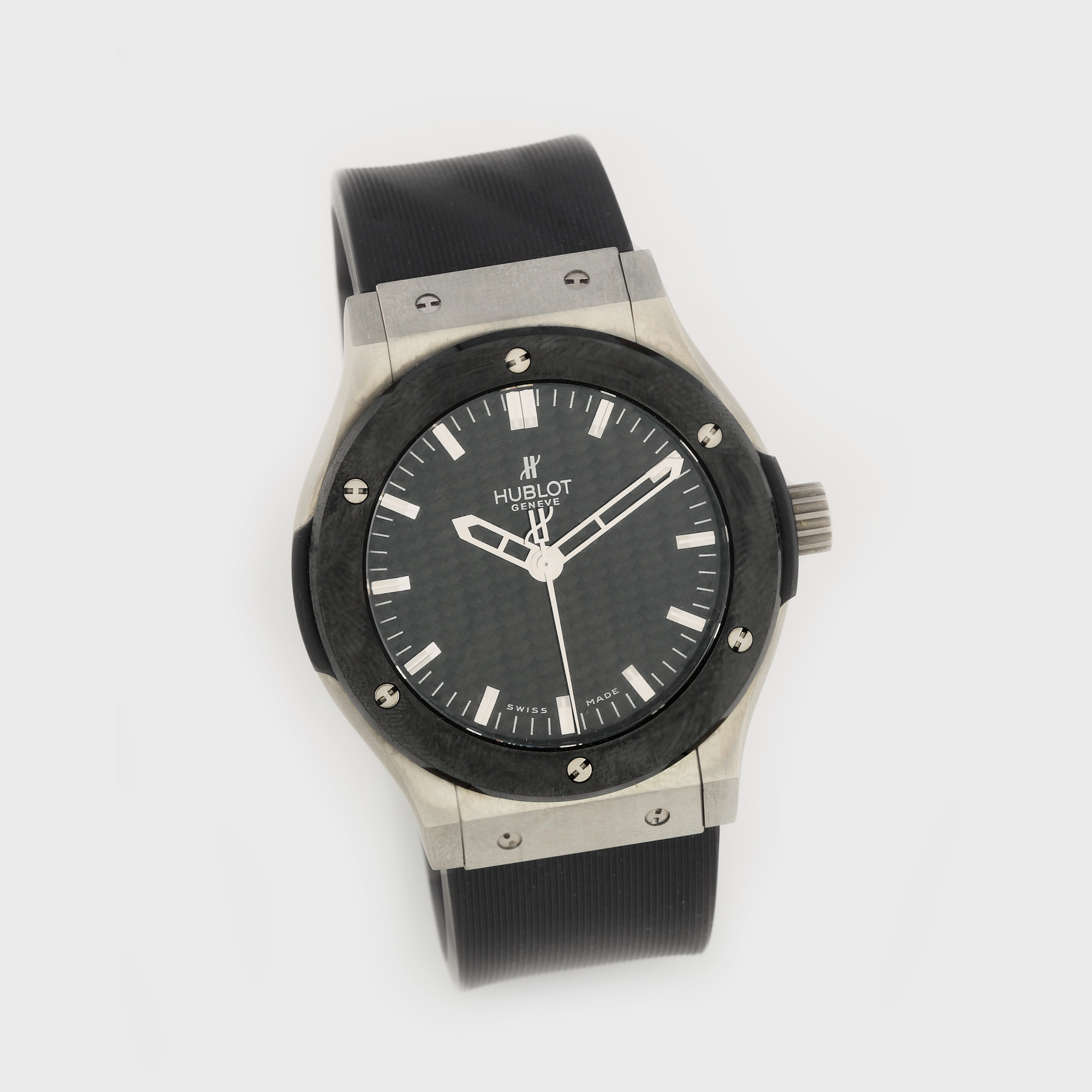 Ceas de mână bărbătesc Hublot Classic Fusion, cadran carbon, bezel din ceramică, carcasă titaniu și zirconiu. Mecanism automatic, curea din silicon și închizătoare tip deployant. Preț de listă: aprox. € 13.000.