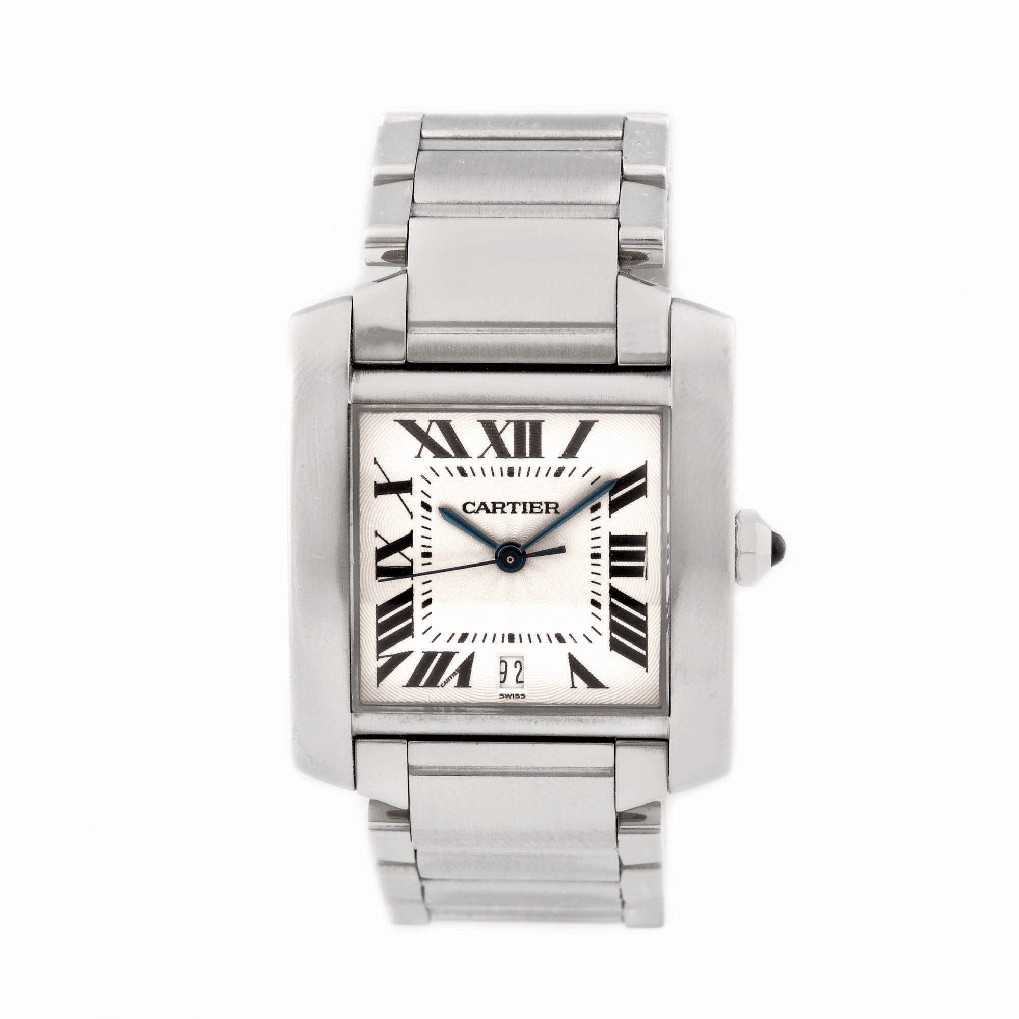 Ceas Cartier Tank Française, de mână, bărbătesc, mecanism automatic, referință: 2302, cadran argintiu, cifre romane și dată la ora 6.