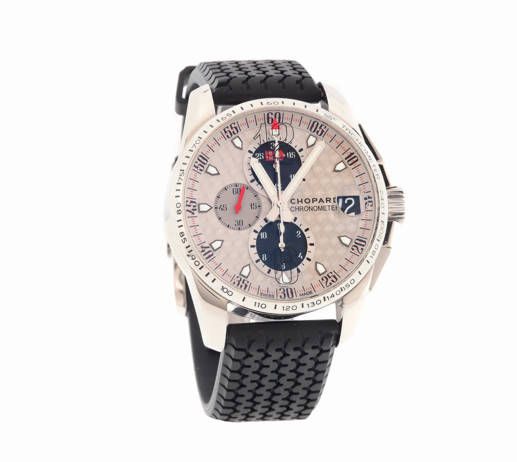 Ceas Chopard Mille Miglia Gran Tourismo GT XL, de mână, bărbătesc. Referință 8530, mecanism automatic chronograph, vitrat. Cadran argintiu cu dată la ora 3. Curea din silicon și închizătoare de tip deployant. Ceasul, fiind ediție limitată, s-a fabricat în 2010 bucăți. Preț de listă 10.000 €.