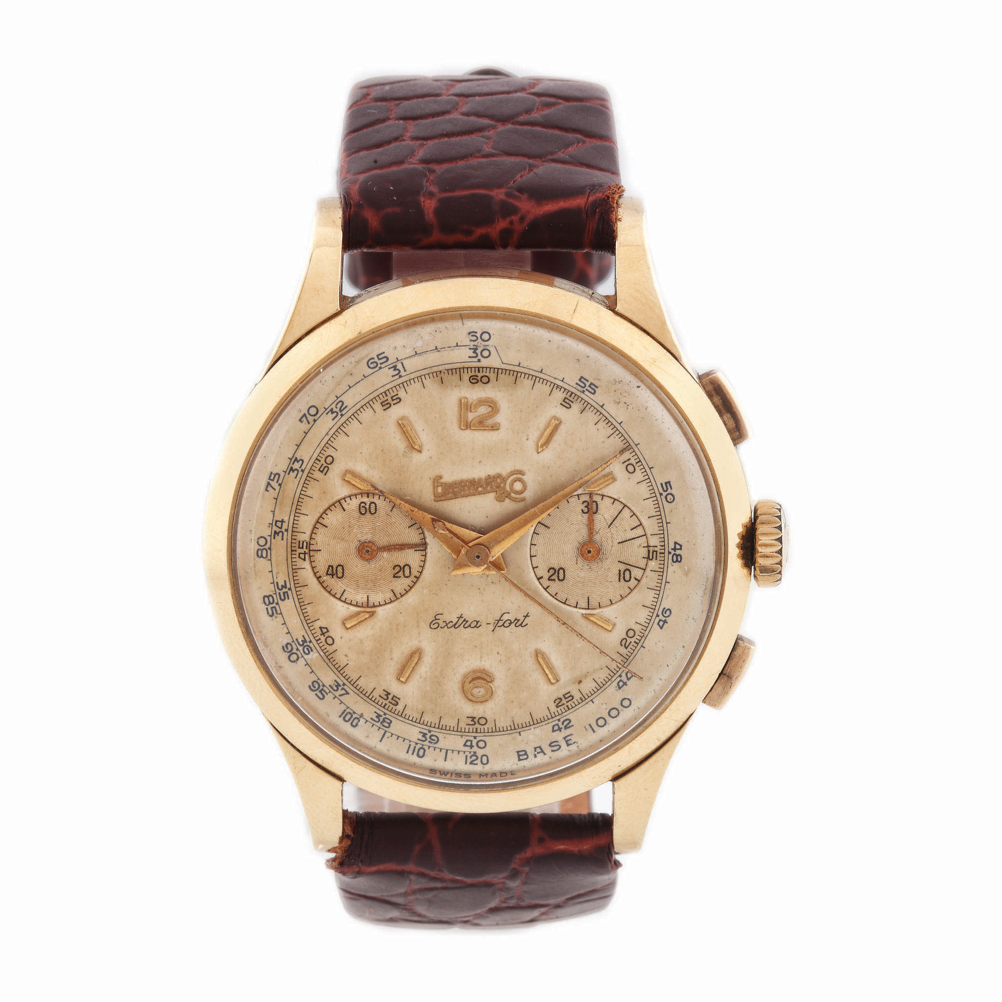 Ceas Eberhard Extra-Fort, de mână, bărbătesc, din aur. Referință 14003-322, mecanism cu armare manuală, chronograph cu două registre. Cadran champagne și curea din piele de culoare maro.