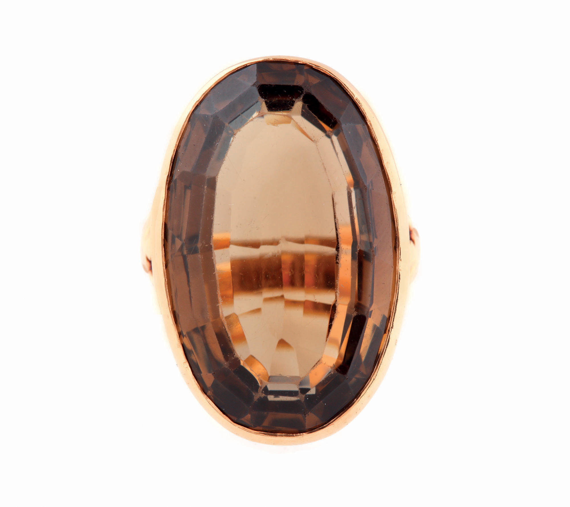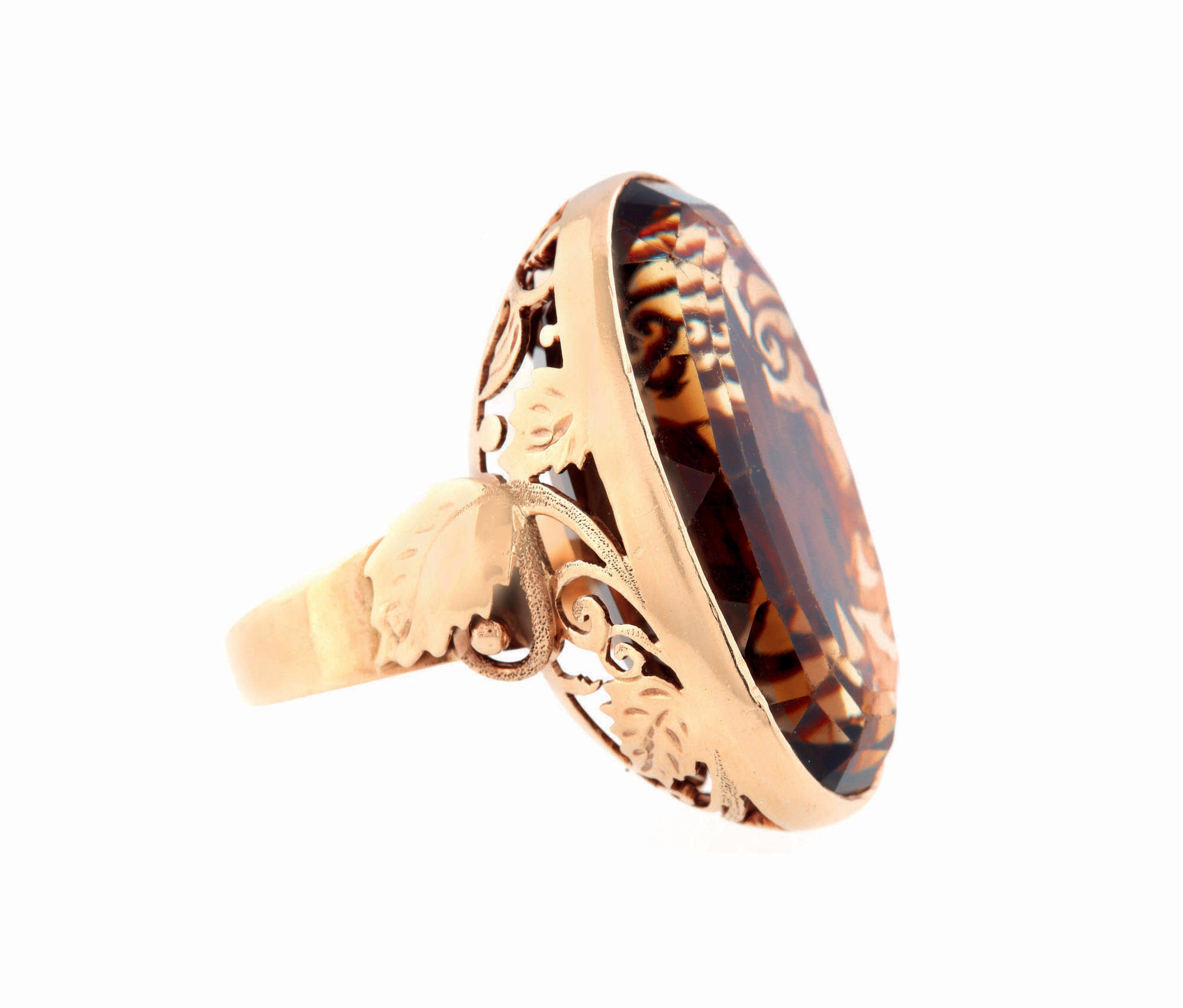 93. Inel din aur, ornat cu cuarţ fumuriu şi delicate traforaţii vegetale
