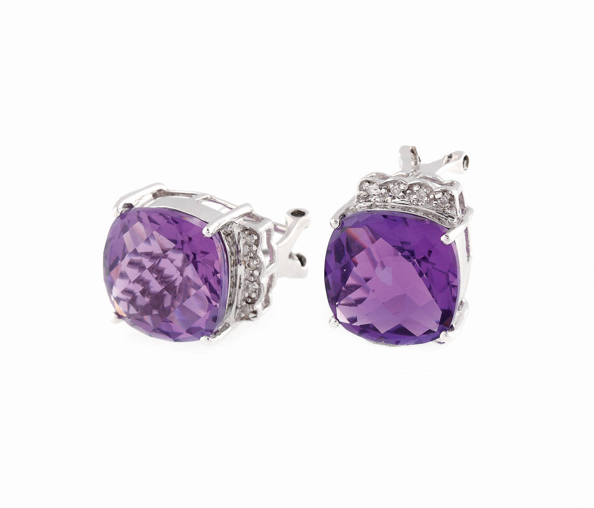 2 ametiste checker cut cca. 16 ct., culoare violet, claritate eye-clean şi 16 diamante rotunde briliant cca. 0,08 ct., culoare I-J, claritate SI-I1