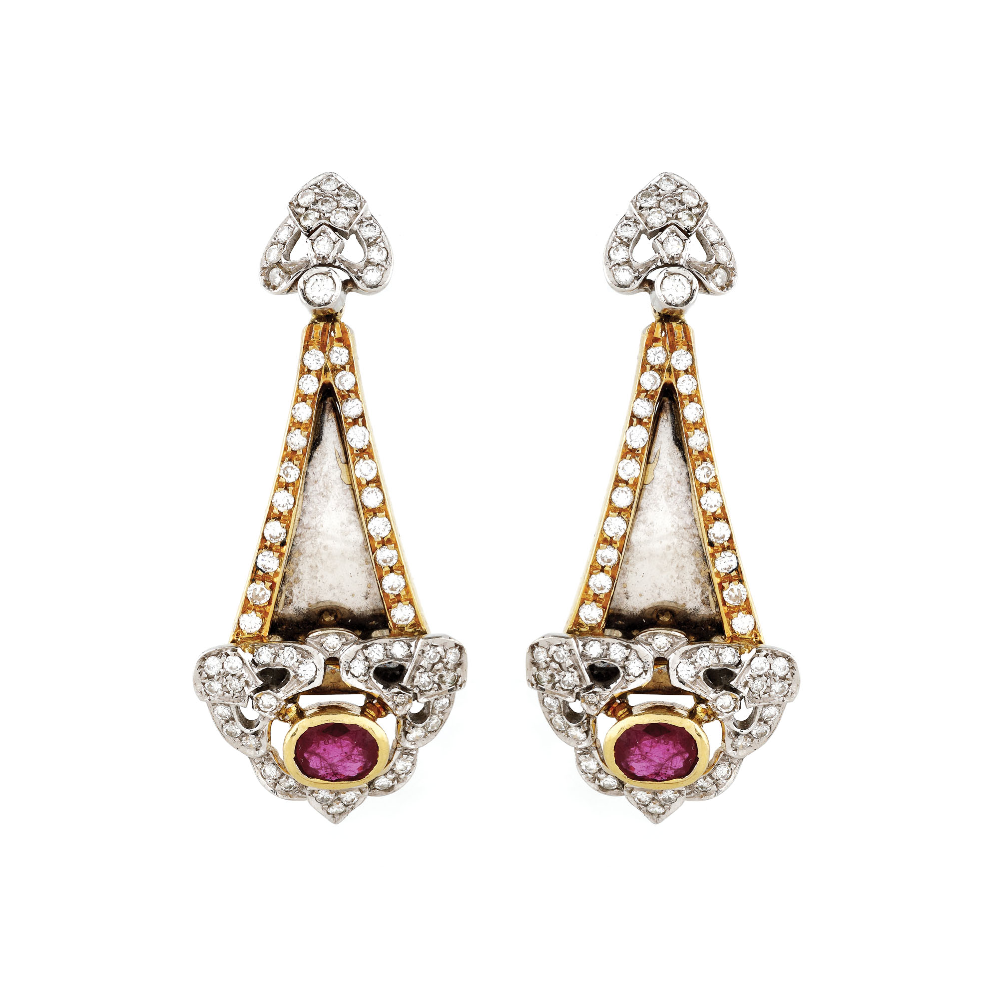 74. Festivă pereche de cercei din aur în două culori, decorată cu rubine și diamante