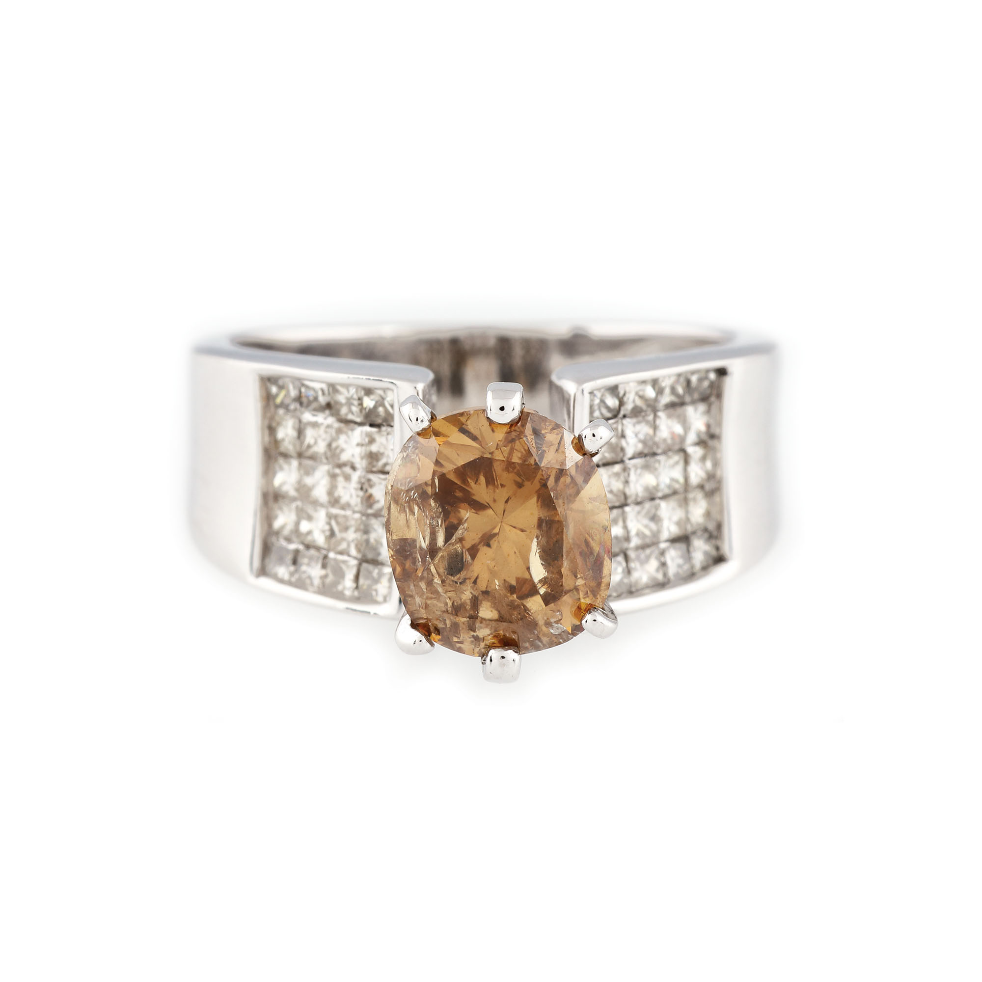 1 diamant oval fațetat, culoare brun, culoare I2, cca. 2,55 ct., prezintă două cavități pe pavilion, 40 diamante princess cut invisible setting, culoare J-K, claritate VS-SI, cca. 0,8 ct.