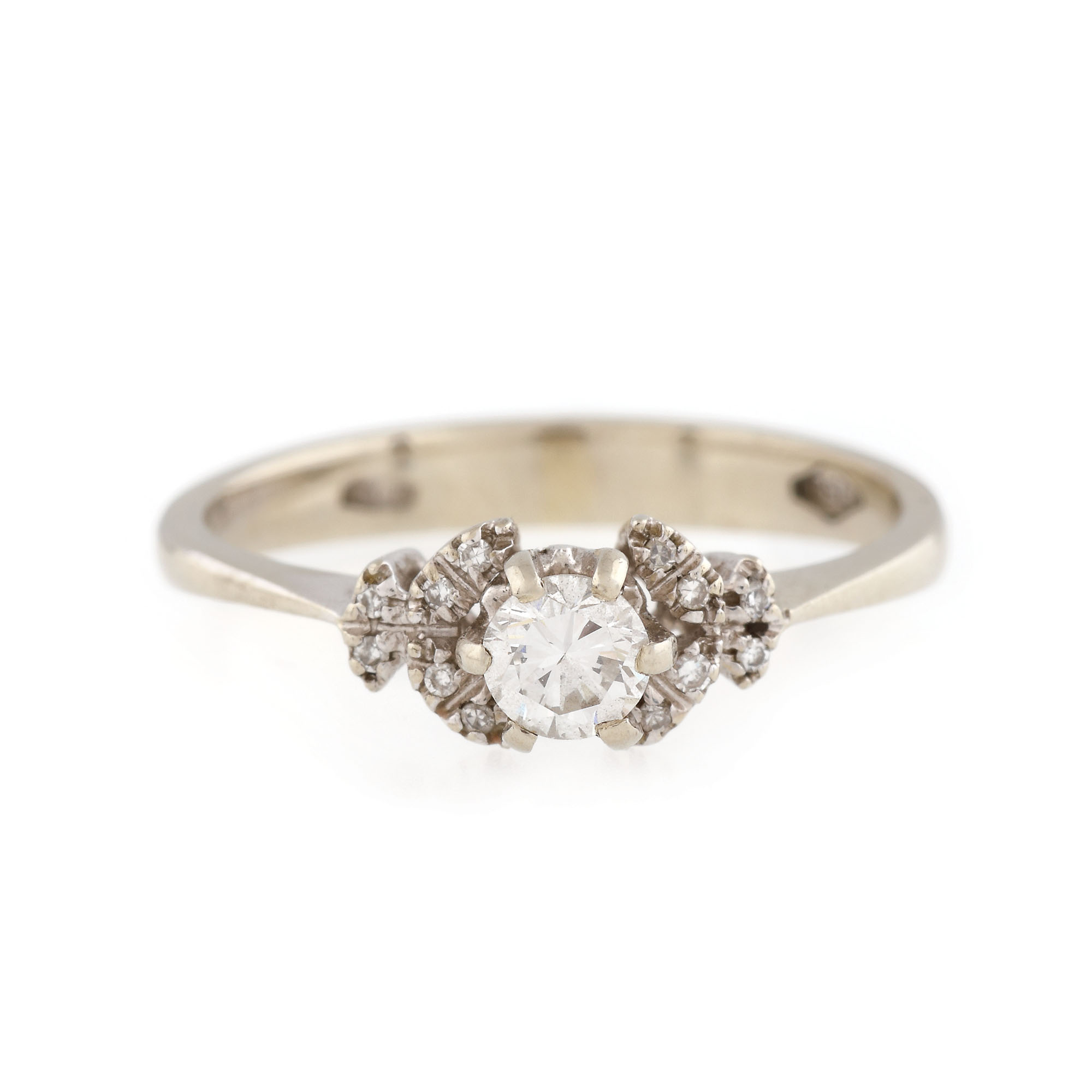 1 diamant rotund briliant, culoare I-J, clartitate VS, cca. 0,24 ct. și 12 diamante single cut, culoare H-J, claritate VS, cca. 0,03 ct.
