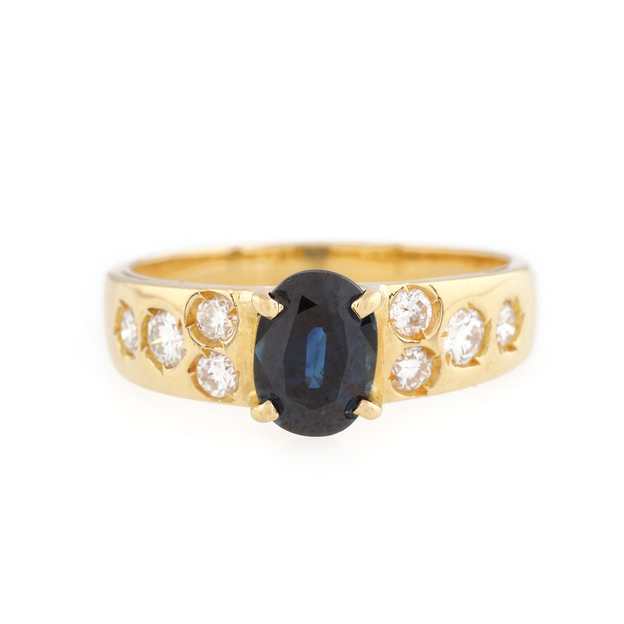 1 safir oval fațetat, culoare albastru-verzui, claritate eye-clean, cca. 1,15 ct. și 8 diamante rotunde briliant, culoare I-J, claritate VS-SI1, cca. 0,36 ct.