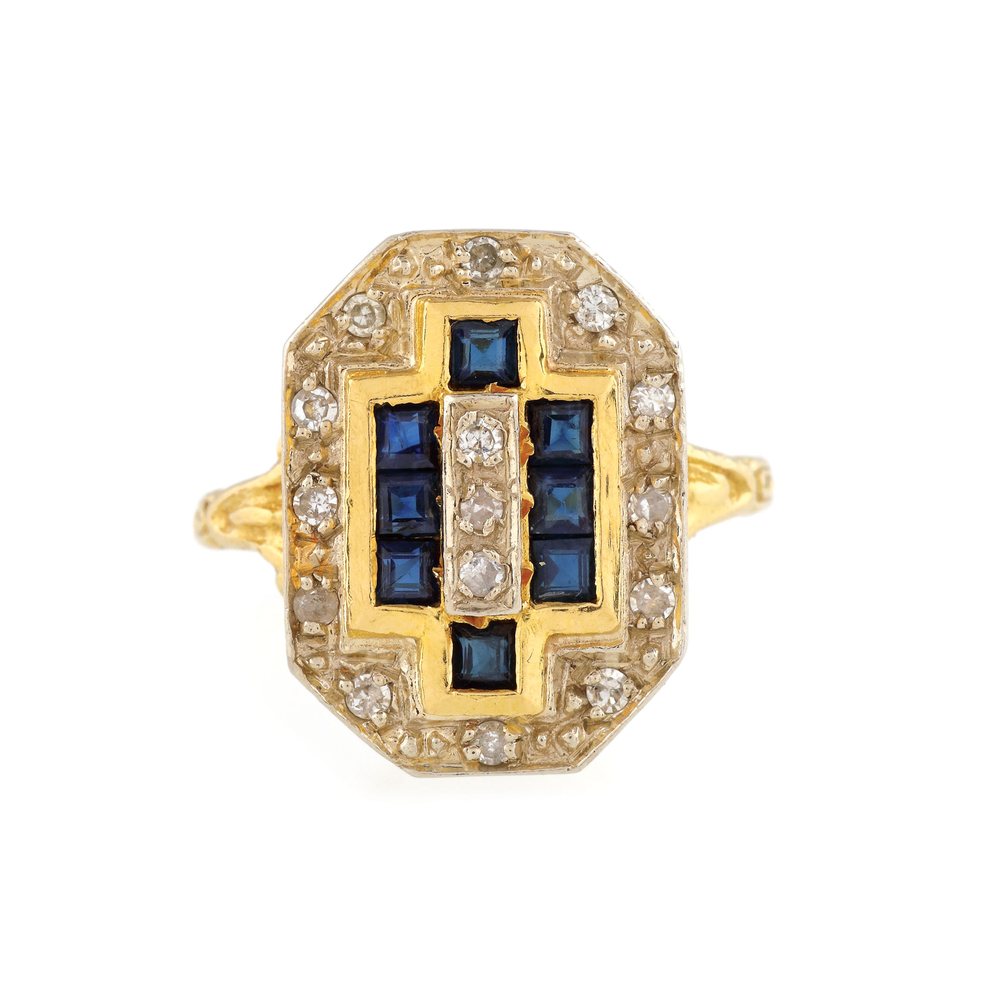 62. Inel din aur, în manieră Art Deco, decorat cu diamante și safire