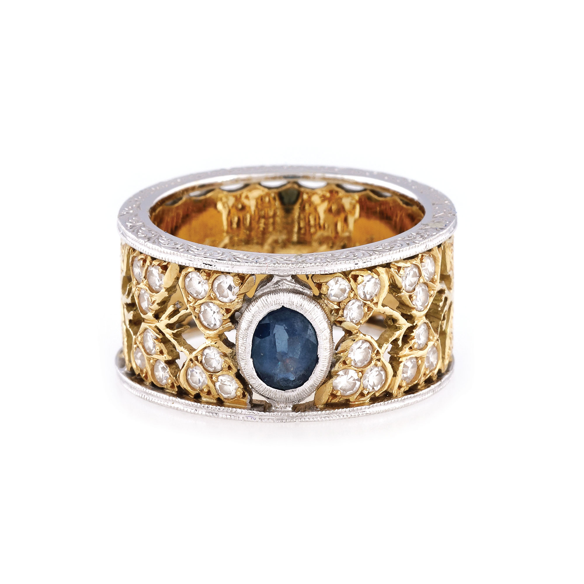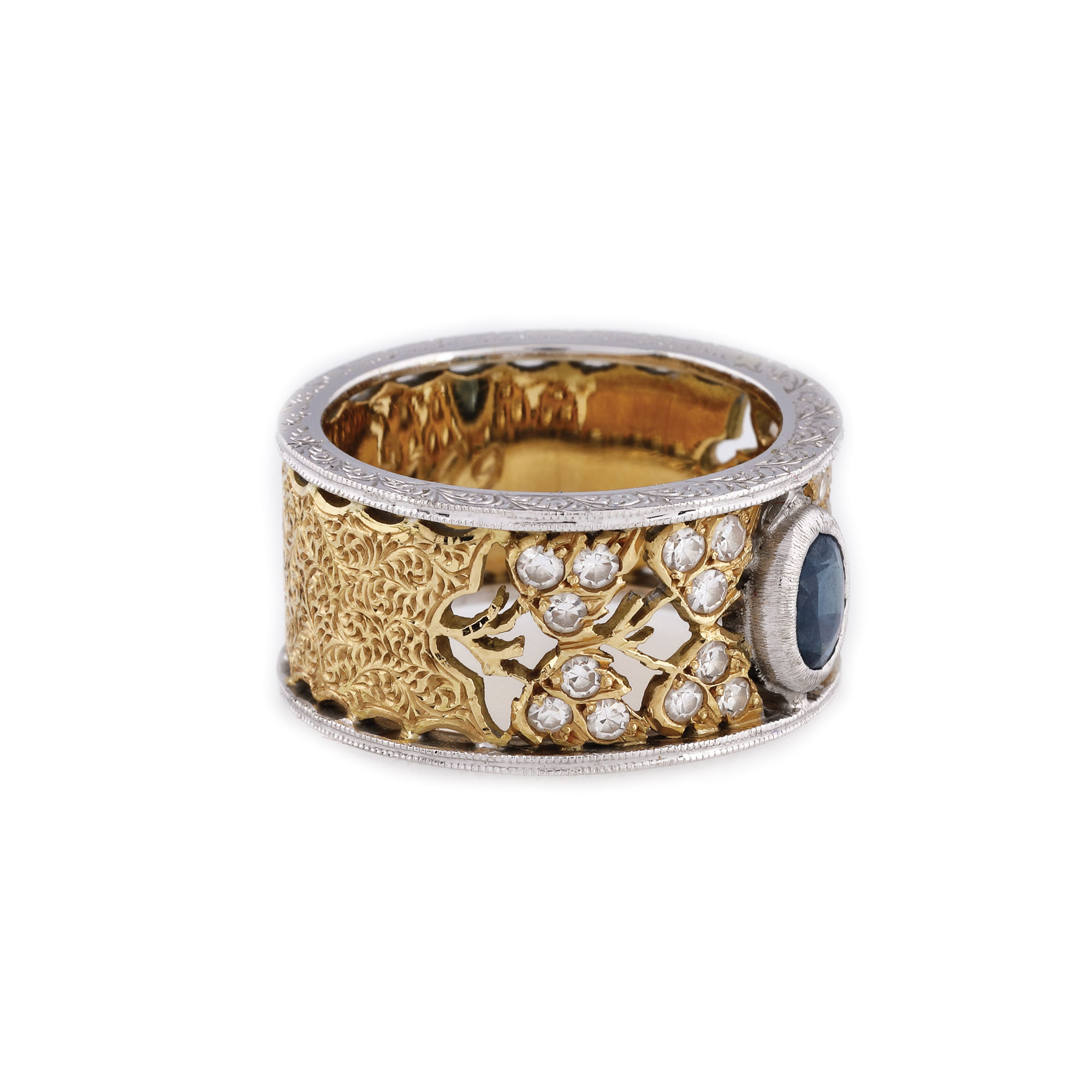 73. Inel în manieră Buccellati, din aur alb și galben, decorat cu safir central și diamante, executat manual