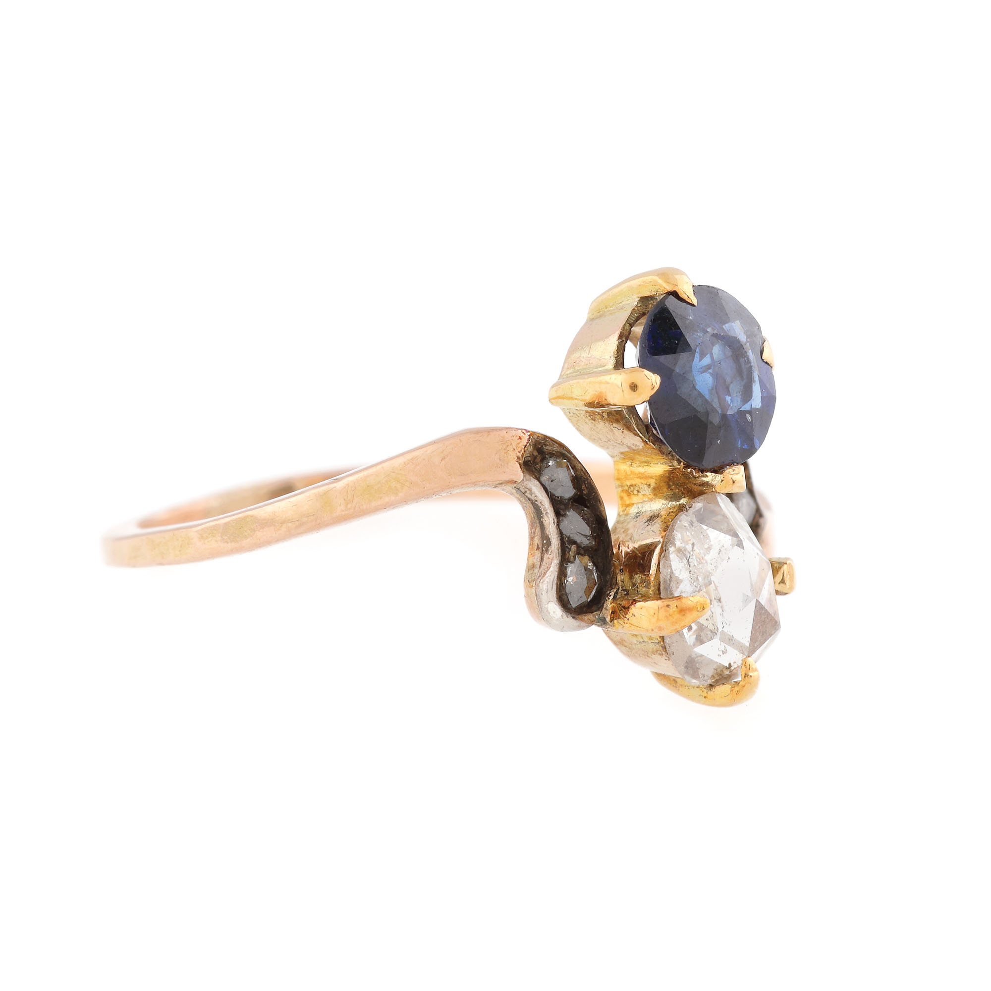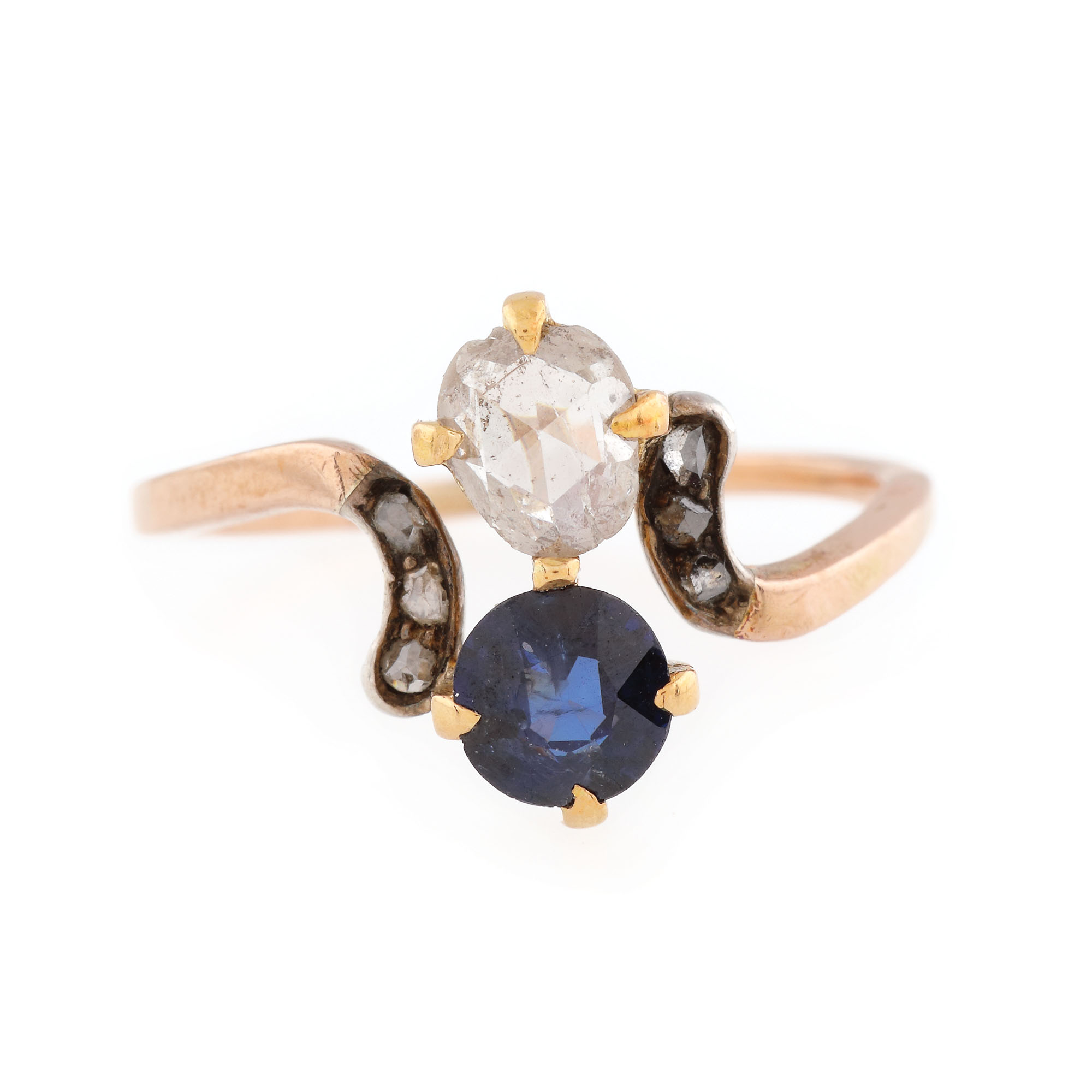 57. "Jour et nuit" - inel din aur roșu și argint, decorat cu diamante și safir
