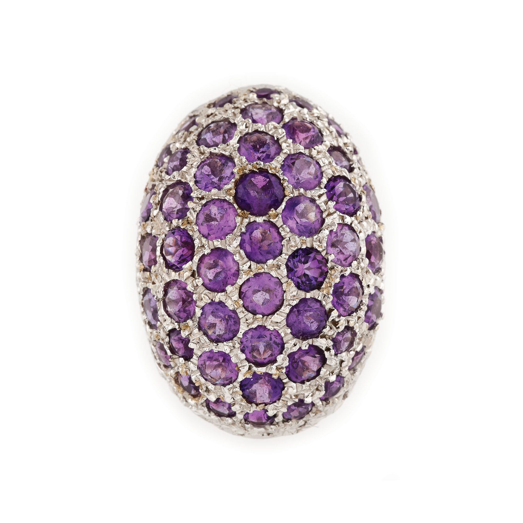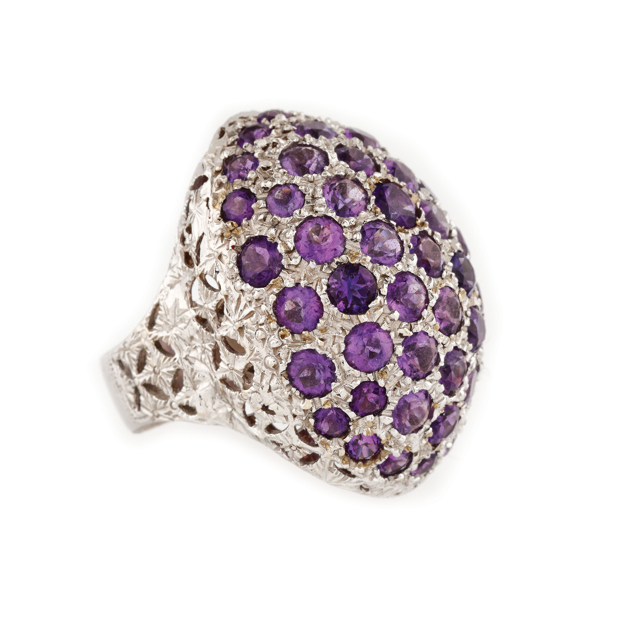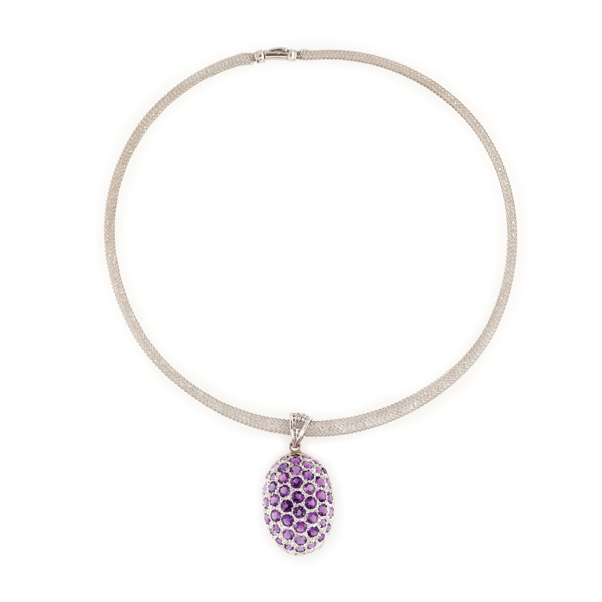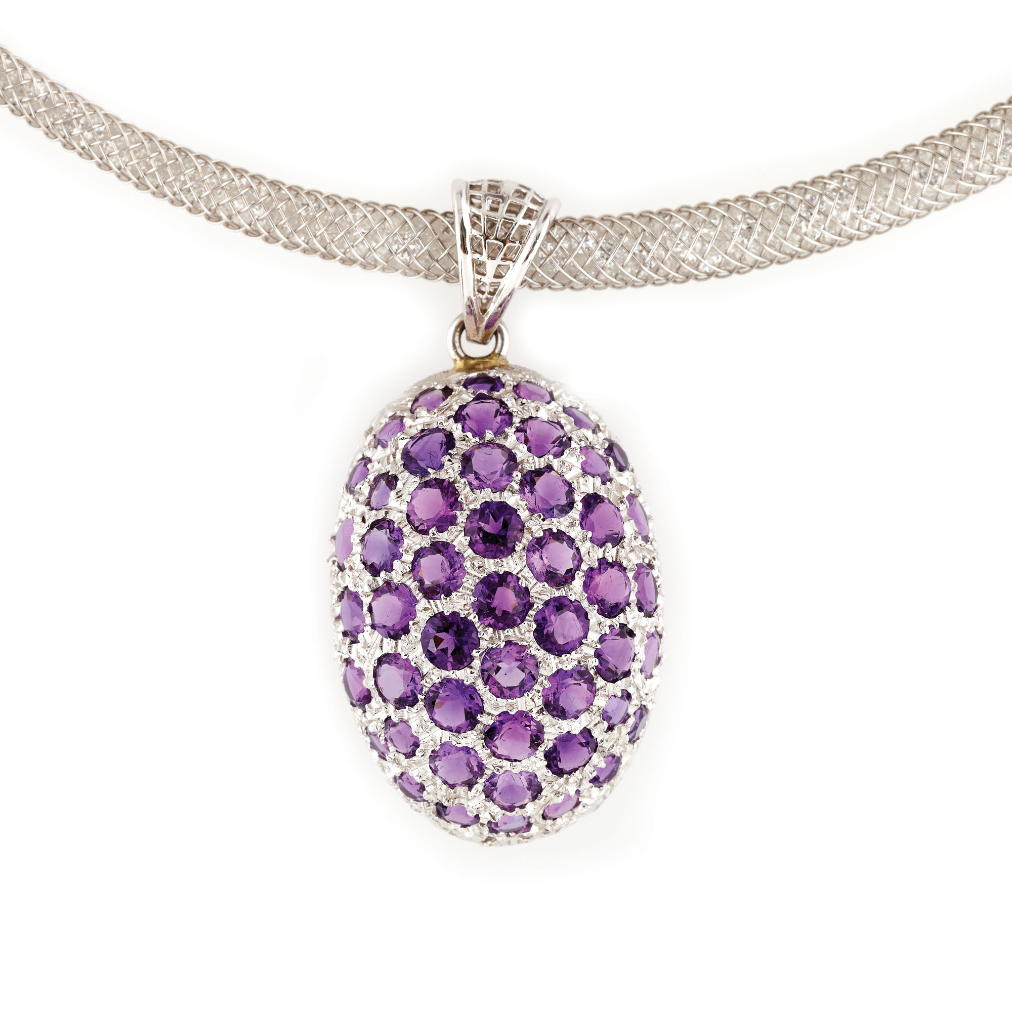 47. Set din aur alb, format din colier cu pandantiv și inel, decorat cu ametiste și pietre ornamentale