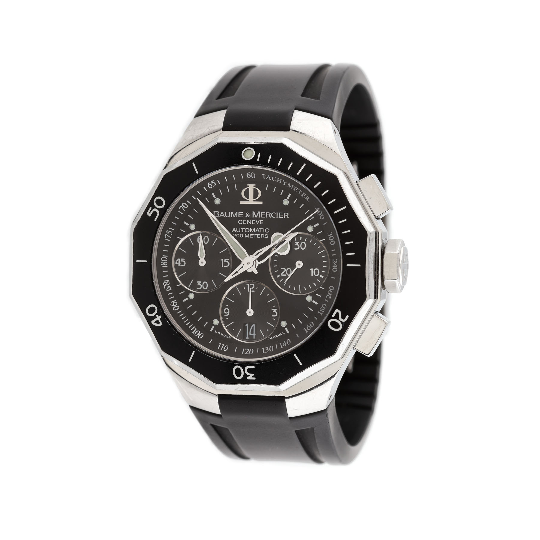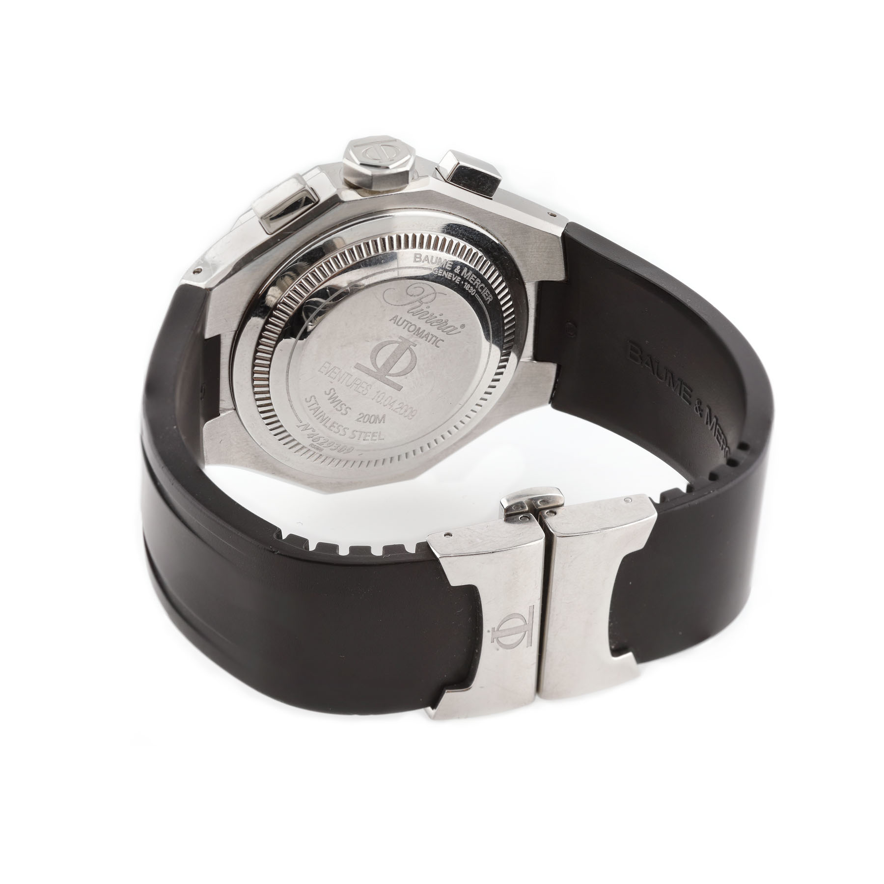 Ceas Baume & Mercier Riviera, de mână, unisex, referință MOA08723, mecanism automatic, cronograf. Cadran de culoare negru, trei registre, dată în dreptul orei 6. Curea din silicon, de culoare negru și închizătoare originală.