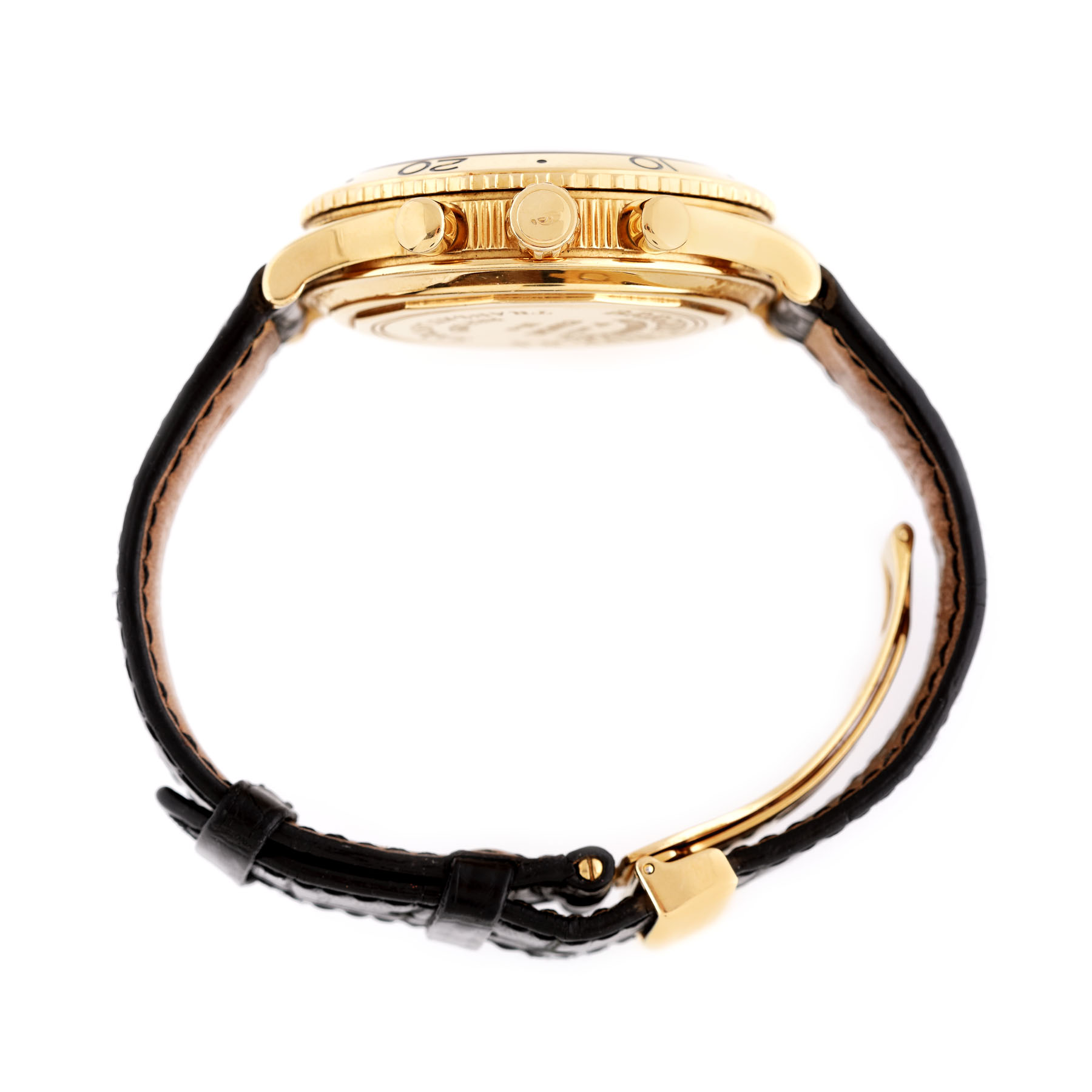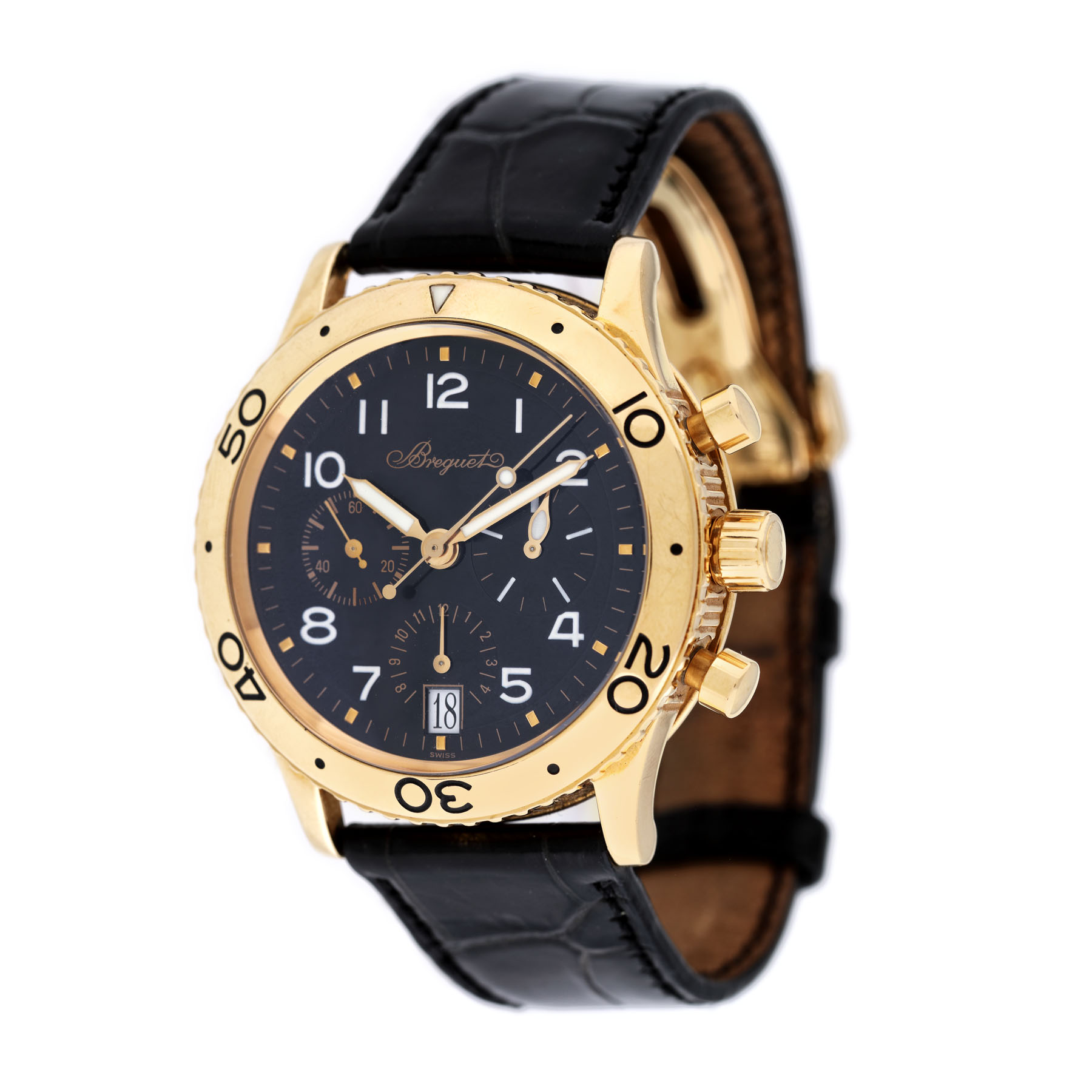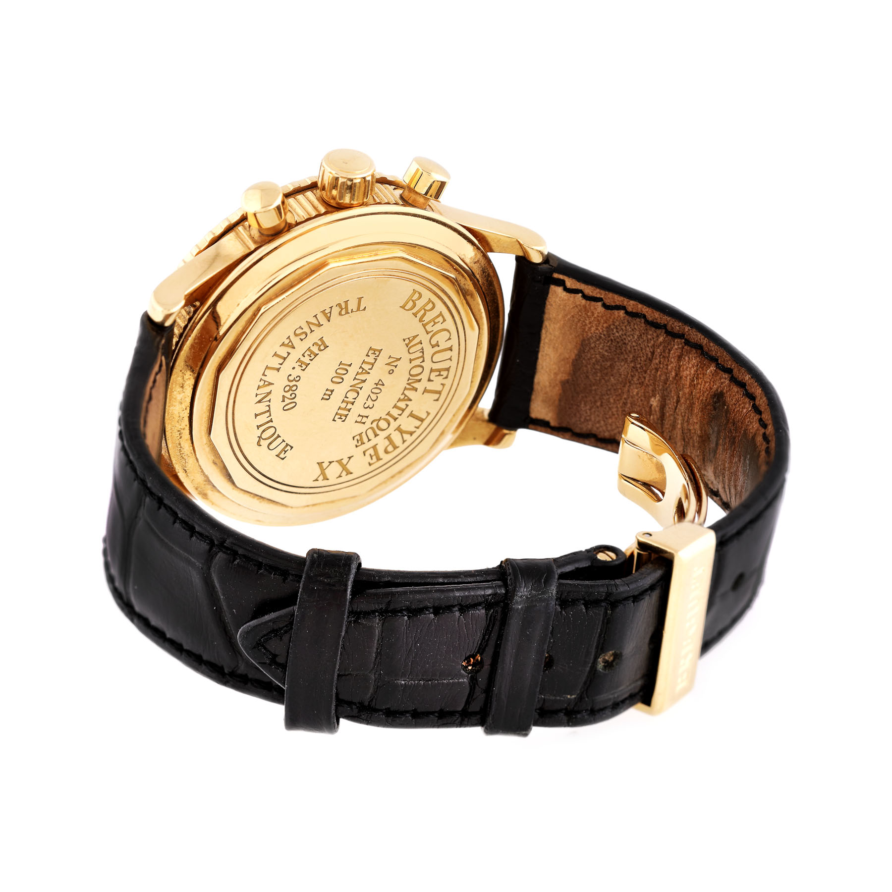 Ceas Breguet Breguet Pilot Series Type XX Transatlantique, din aur, de mână, unisex, referință 3820, mecanism automatic cronograf. Cadran negru cu cifre arabe, trei registre, indicatori luminiscenți, dată la ora 6. Bezel din aur, rotativ bidirecțional, gravat cu numerale arabe. Curea neagră, din piele de crocodil și cataramă din aur, cu sistem închidere deployant.
