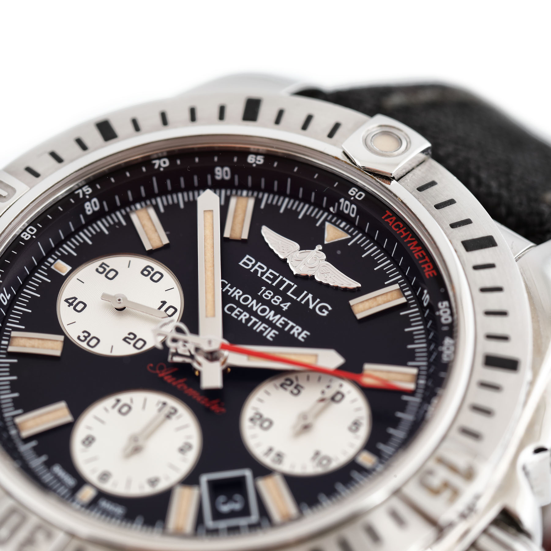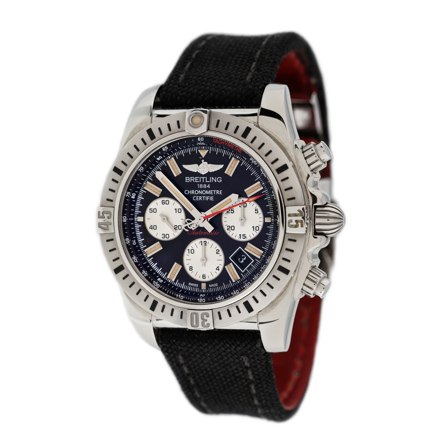 Ceas Breitling Chronomat 44 Airborne, referință AB0115, mecanism automatic cronograf, cadran negru cu trei registre și dată între orele 4 și 5. Rezervă de timp de 7 h. Bezel rotativ unidirecțional, gravat. Curea neagră din material textil.