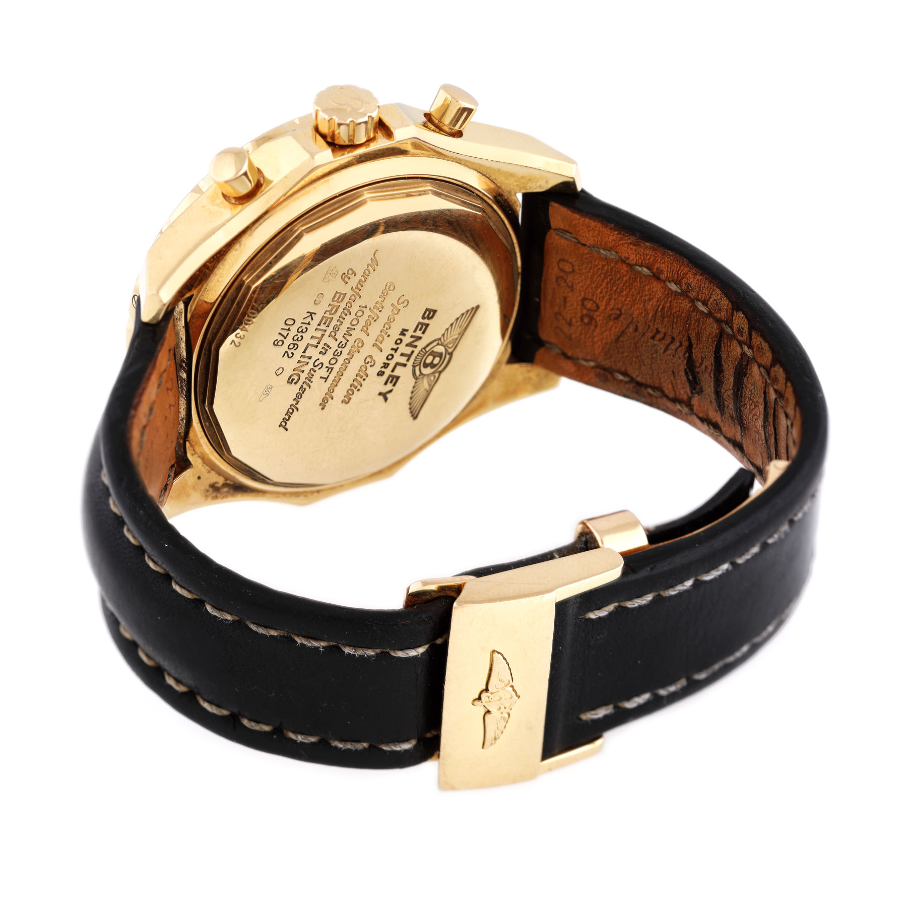 Ceas Breitling, realizat pentru Bentley Motors, din aur, de mână. bărbătesc, cu referință K13362 și mecanism automatic cronograf. Cadran negru, cu trei registre și fereastră cu ziua săptămânii și dată în dreptul orei 3. Bezel rotativ bidirecțional și carcasă din aur. Curea neagră din piele, cu cataramă din aur și închidere tip deployant.