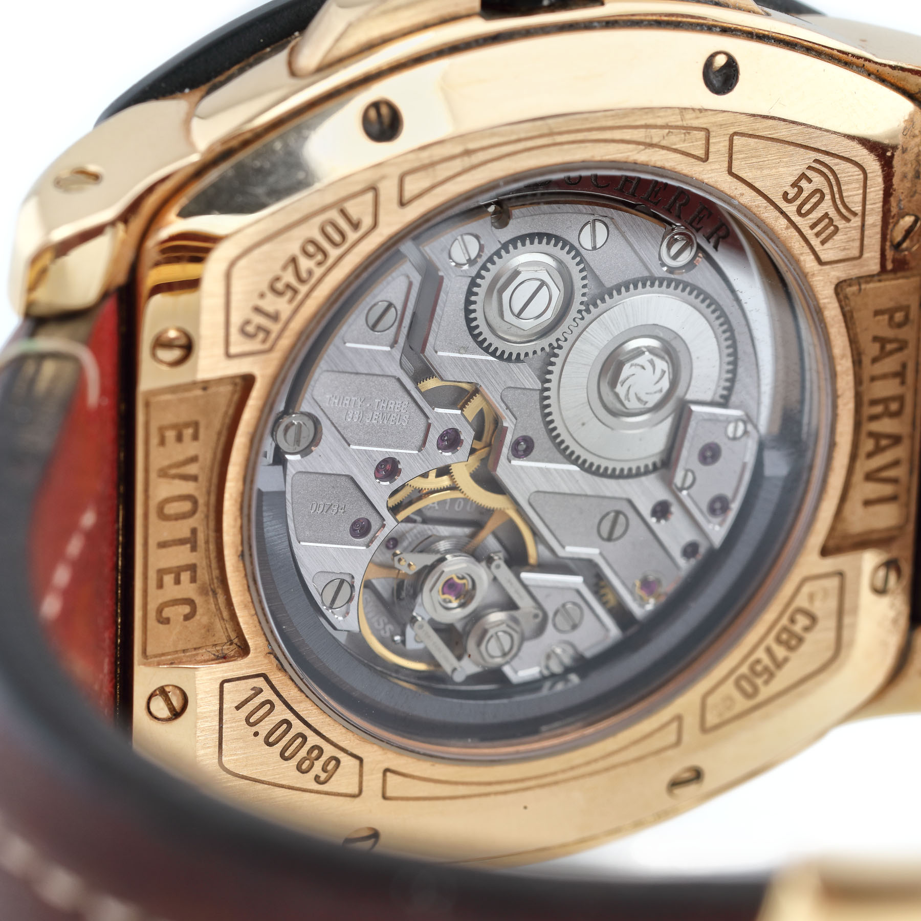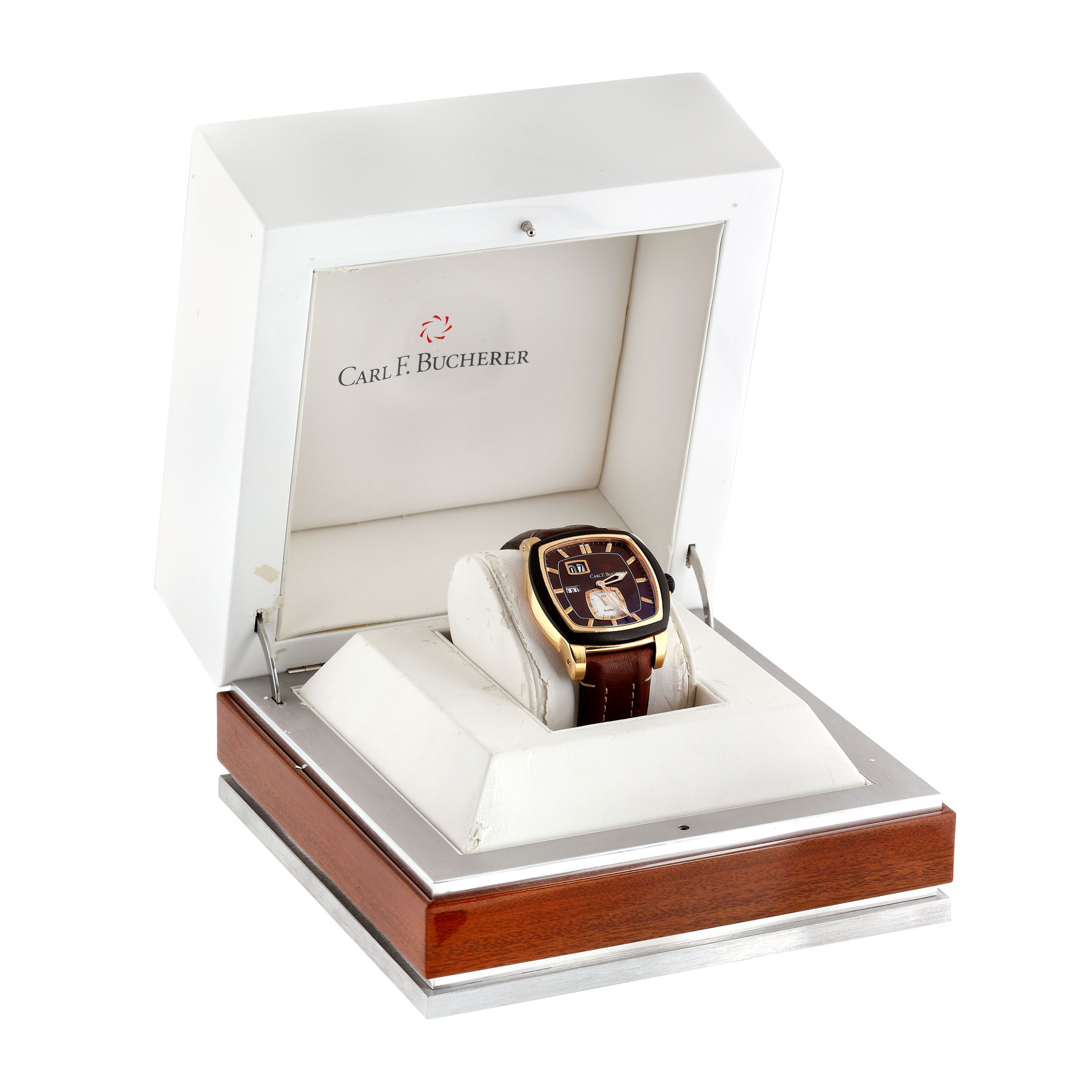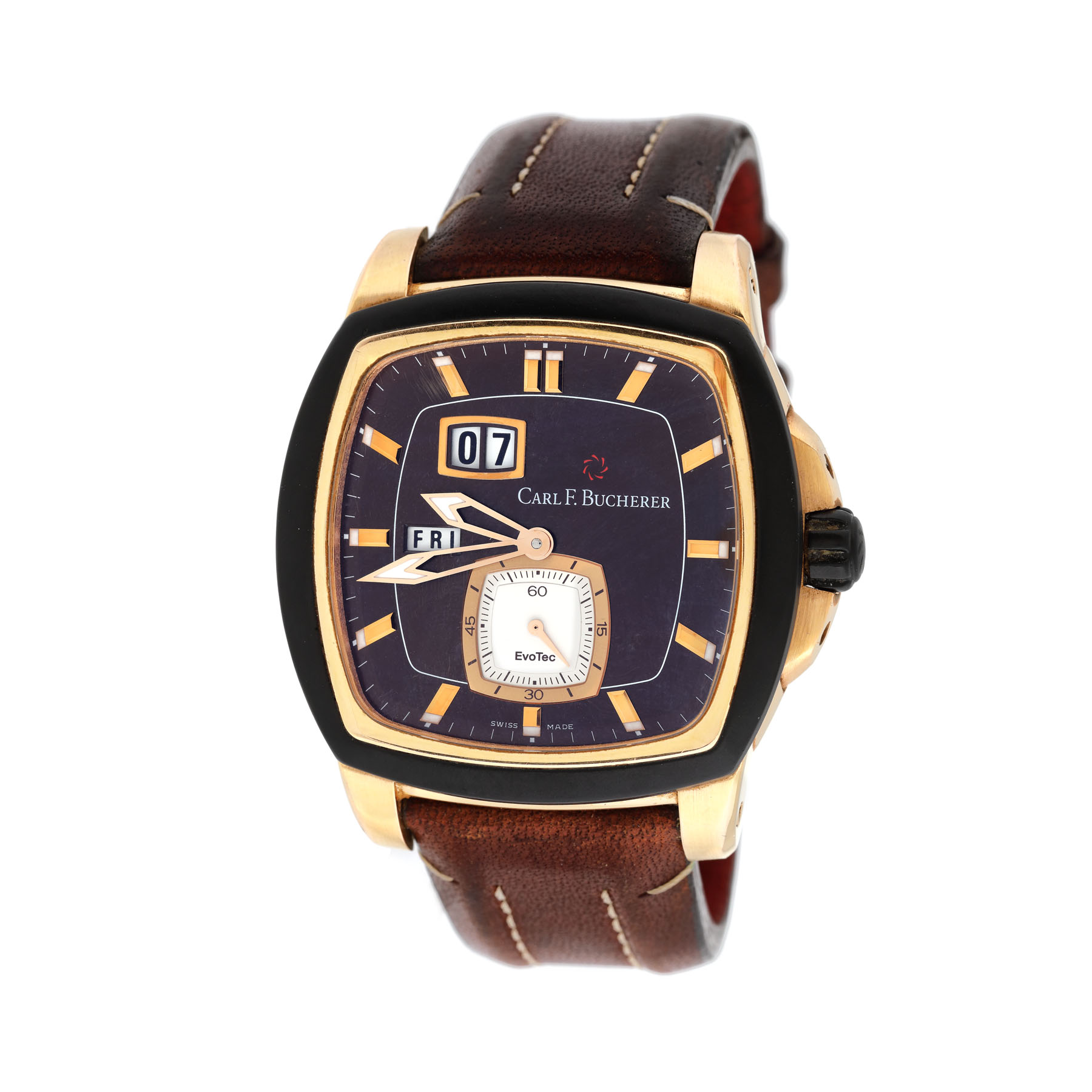 Ceas Carl F. Bucherer Patravi EvoTec Day-Date din aur roz, de mână, bărbătesc, având referință 00.10625.15.93.01, calibru CFB A1001, mecanism automatic vitrat anterior și rezervă de timp de 55 h. Cadran de culoare brun, cu dial pentru secundar, ziua săptămânii în dreptul orei 9 și dată în dreptul orei 11. Curea de culoare brun, din piele de vițel, cu cataramă din aur roz de 18 k. Ceasul vine însoțit de cutia originală.