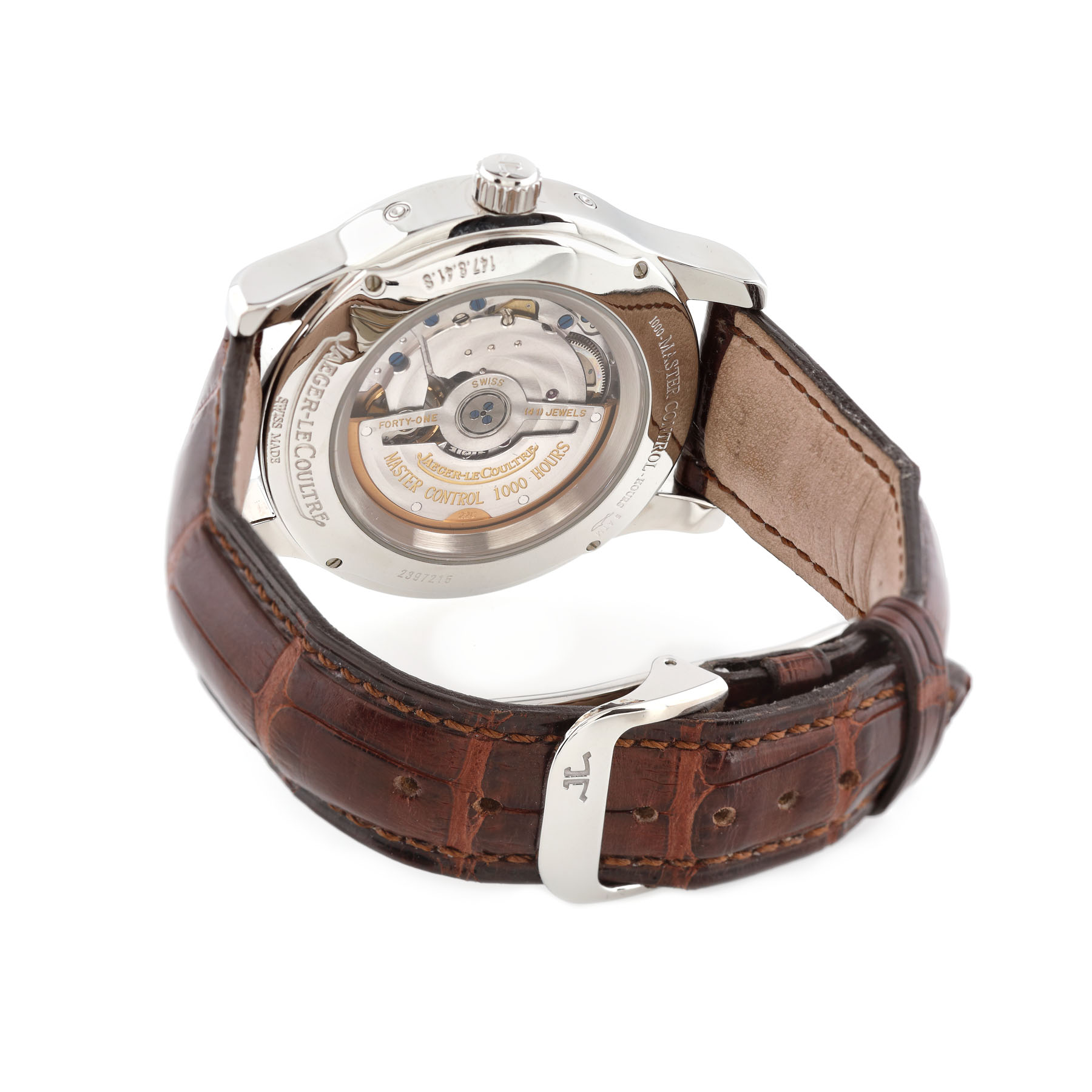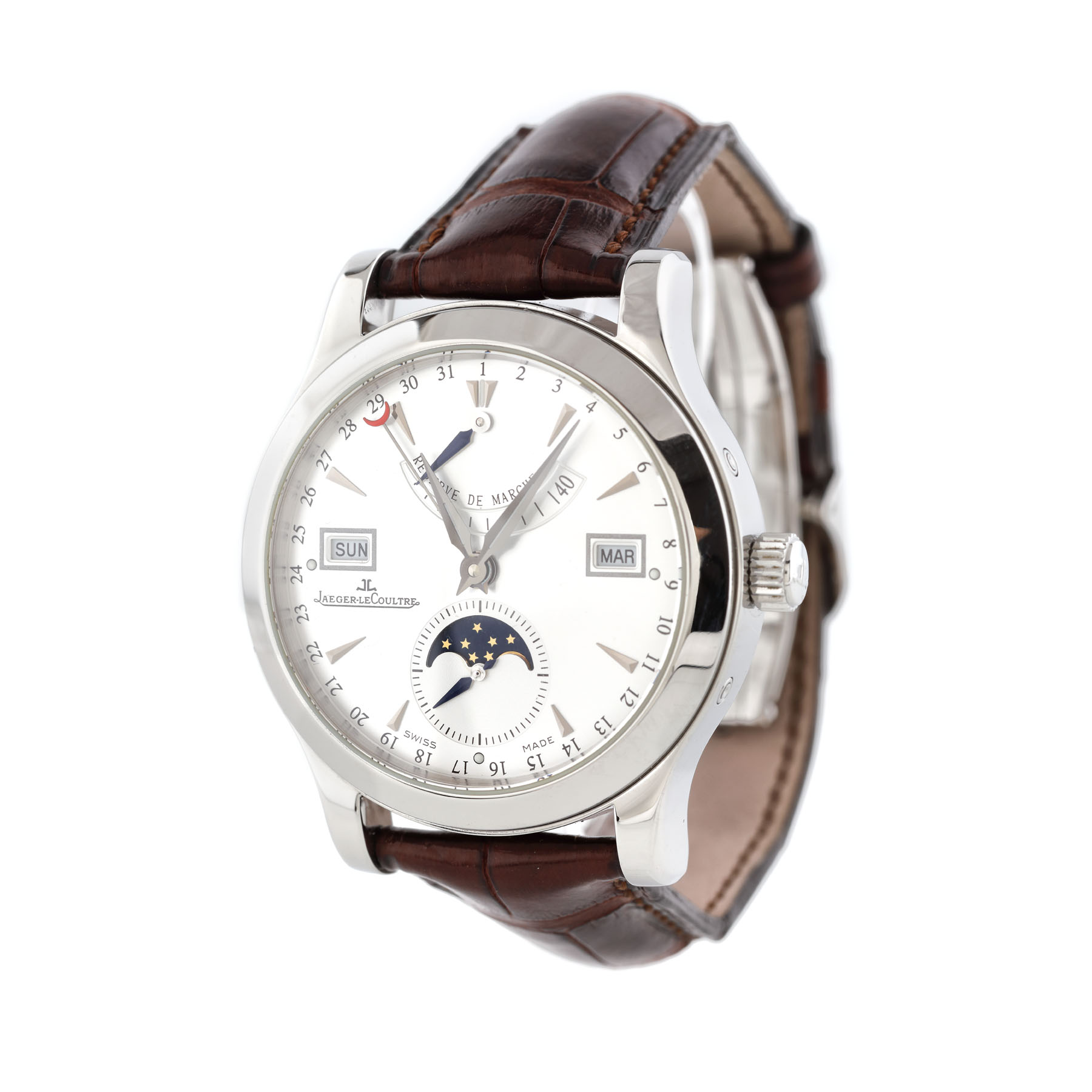 Ceas Jaeger-LeCoultre Master Calendar, din oțel, de mână, bărbătesc, referință 147.8.41.S, mecanism automatic, cu rezervă de timp 40 h. Cadran silver, dată în dreptul orei 3, fazele lunii în dreptul orei 6 și ziua săptâmnii în dreptul orei 9. Curea din piele de crocodil, de culoare maro și închizătoare originală, tip deployant. Ceasul vine însoțit de manualul de utilizare și cutia originală.