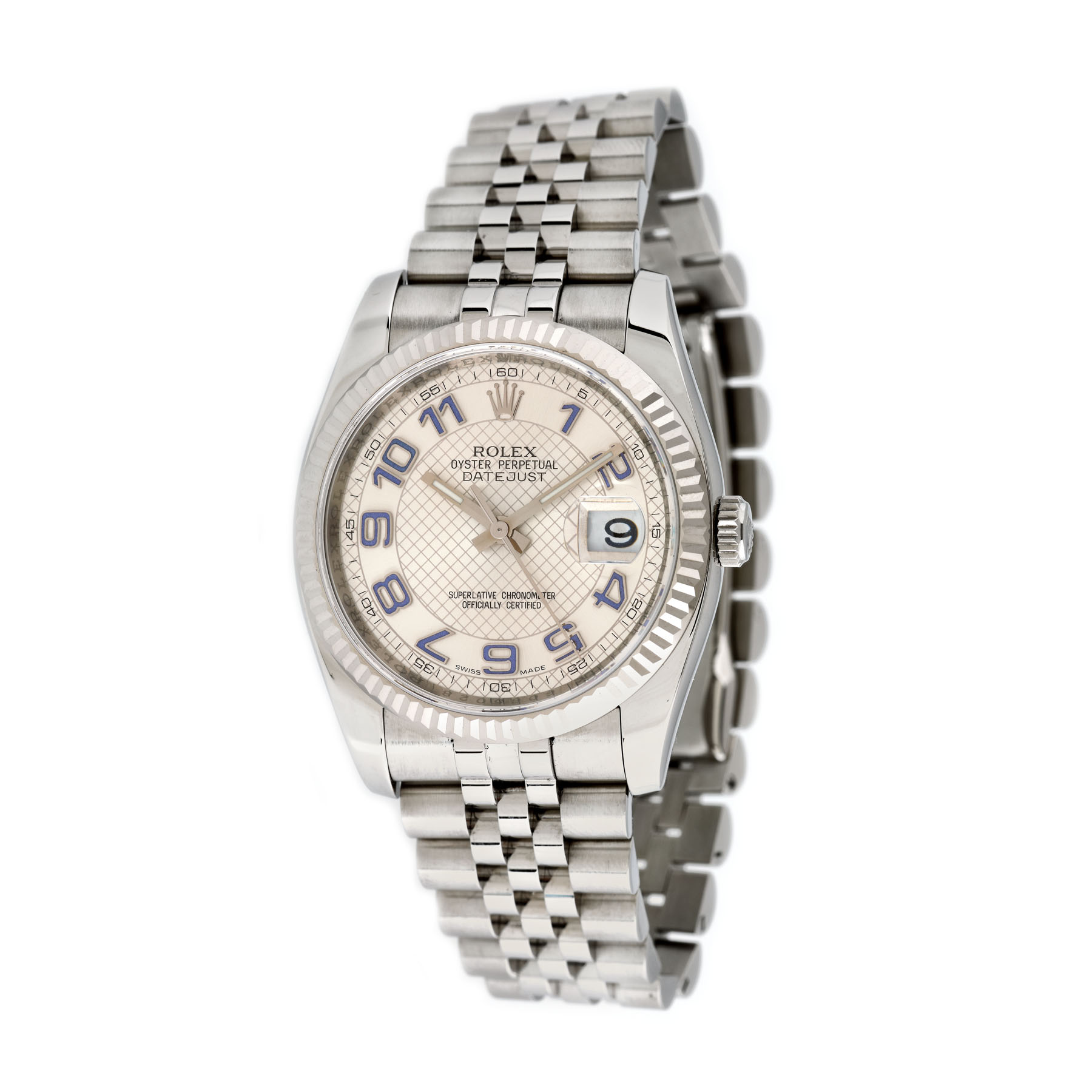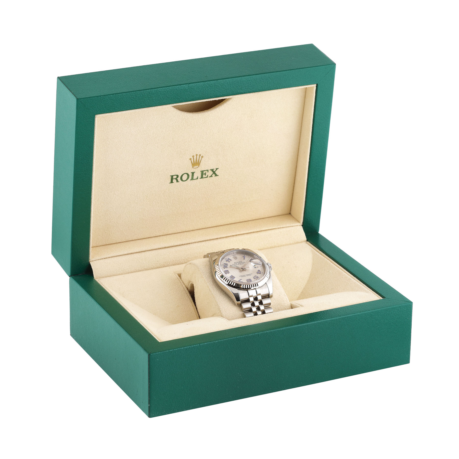 Ceas Rolex DateJust, din oțel, de mână, bărbătesc, cu referință 116234, și mecanism automatic. Cadran silver, cu cifre arabe de culoare mov și dată cu lupă în dreptul orei 3. Brățară tip jubilee, cu cataramă tip deployant. Ceasul este nou, având foliile de protecție originale atașate pe verso.