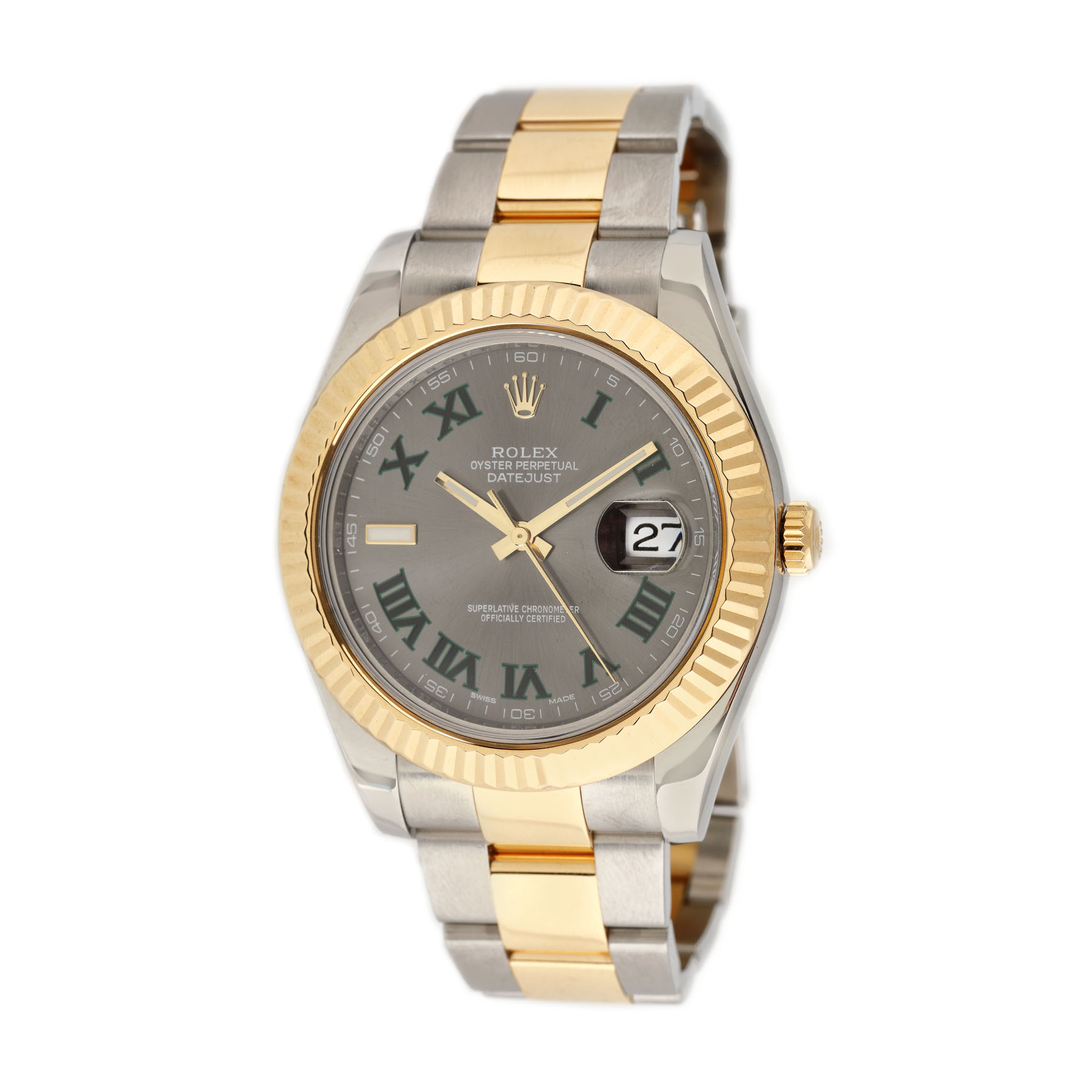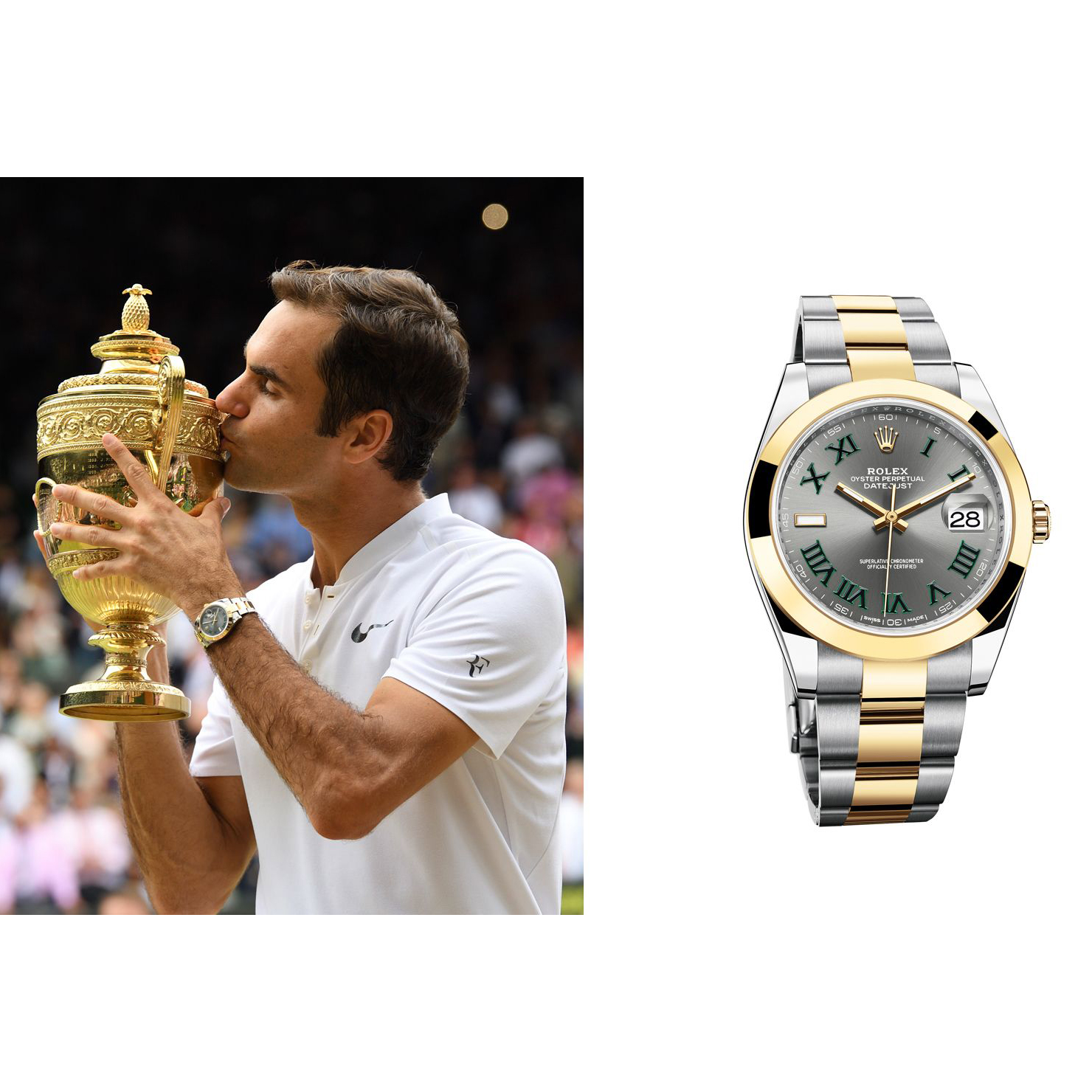 Ceas Rolex Oyster Perpetual DateJust, de mână, bărbătesc, referință 116333, mecanism automatic. Cadran gri-sidefiu, cu numerale romane de culoare verde și dată cu lupă la ora 3. Modelul a fost purtat de tenismenul Roger Federer la câștigarea celui de-al 8-lea titlu Wimbledon, în anul 2017.