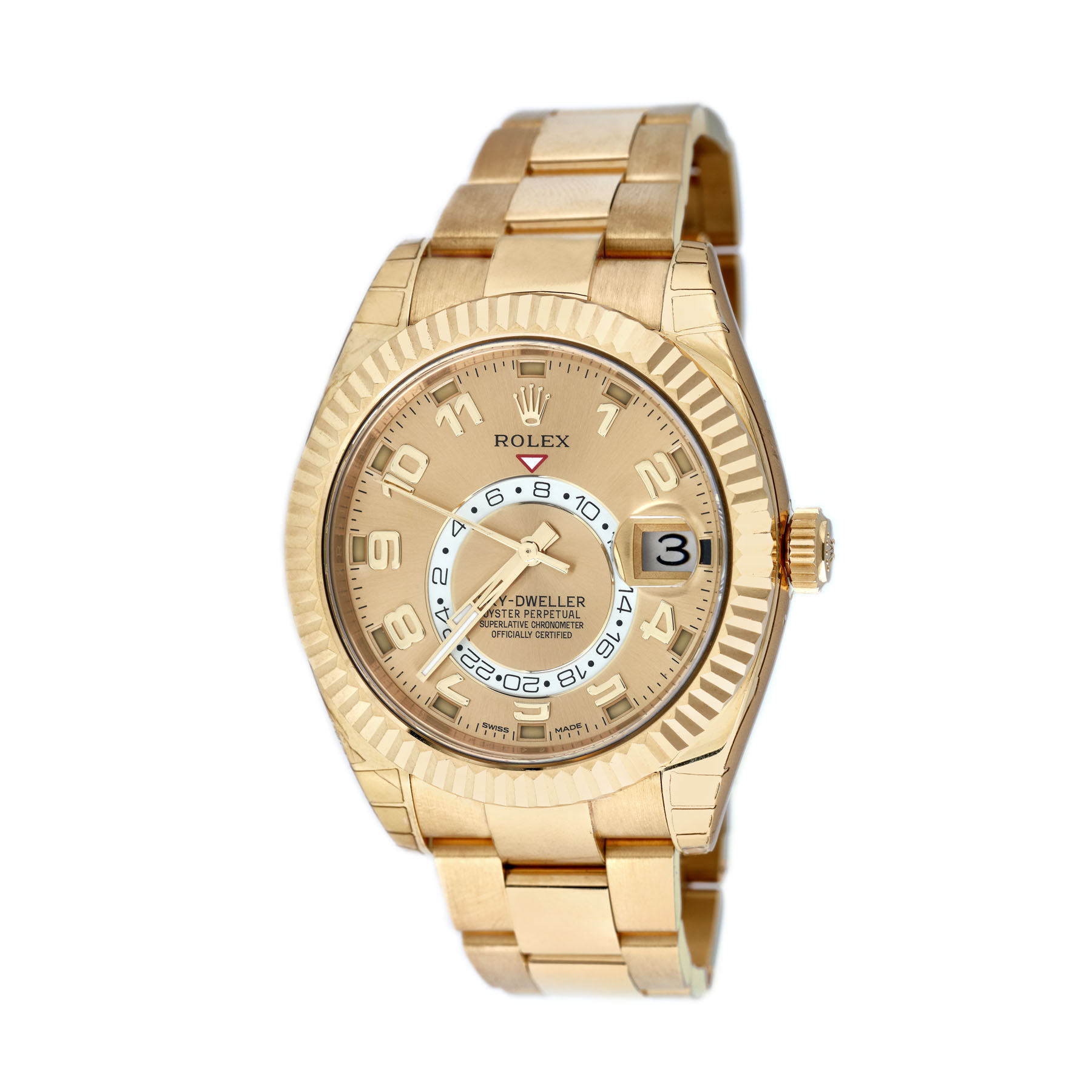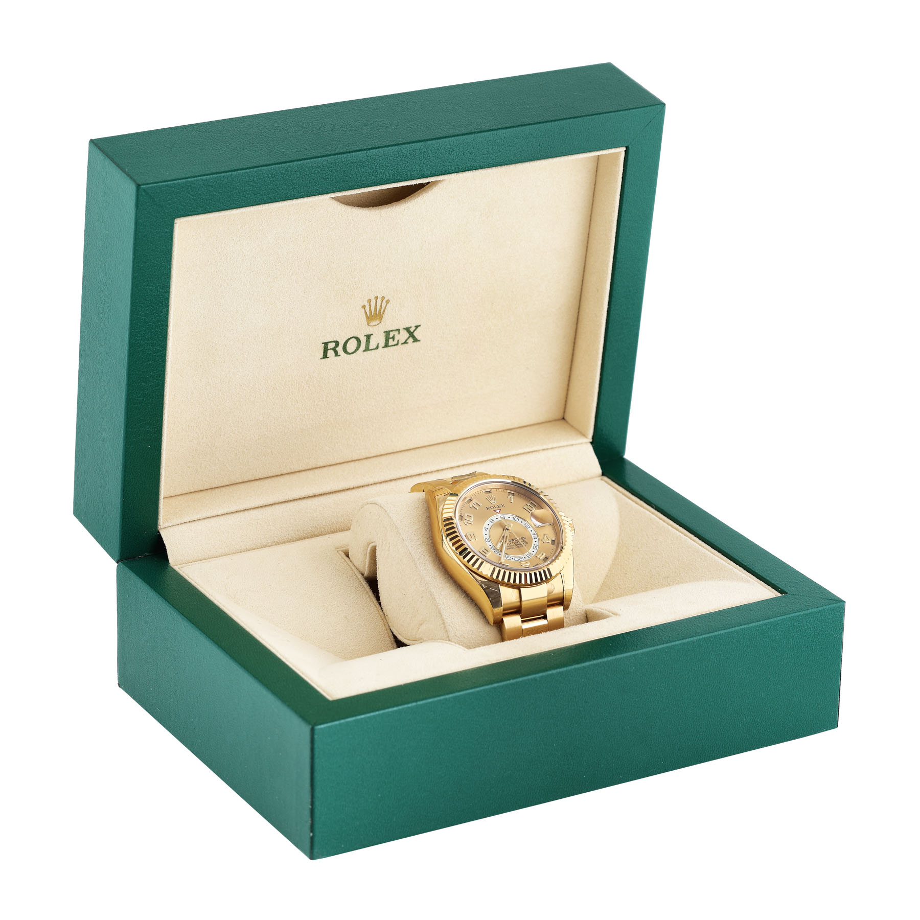 Ceas Rolex Oyster Perpetual Sky-Dweller din aur, de mână, unisex, referință 326938, calibru 9001, mecanism automatic, cu calendar anual, rezervă de timp de 72 h. Cadranul auriu champagne prezintă cifre arabe din aur, disc pentru afișarea unui al doilea fus orar și dată cu lupă la ora 3. Bezel din aur, rotativ, bidirecțional și curea oyster din aur, cu sistem de închidere deployant. Ceasul este nou, având foliile de protecție originale atașate pe verso, vine însoțit de cutia originală. Acest model este unul dintre cele mai noi apărute din gama propusă de Rolex. Mecanismul încorporat în modelul Sky-Dweller fiind cel mai complicat în producție, având calendar complet și dual time zone.