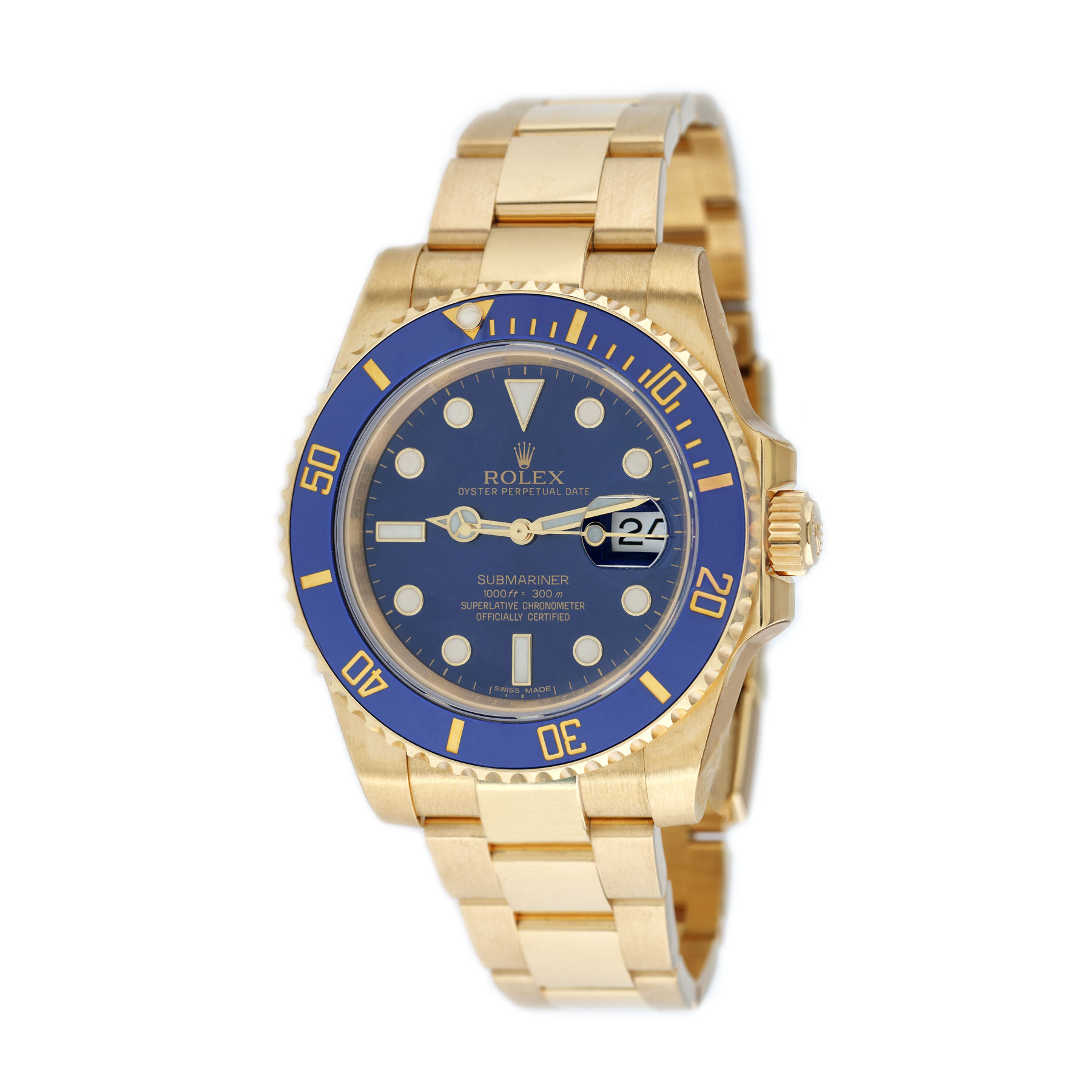 Ceas Rolex Oyster Perpetual Submariner Date din aur, de mână. unisex, cu referință 116618LB, mecanism automatic, calibru 3135 și rezervă de timp de 50 h. Cadran de culoare albastru marin, cu indicatori luminiscenți și dată cu lupă în dreptul orie 3. Bezel ceramic de culoare albastru, rotativ unidirecțional. Ceasul este nou, având foliile de protecție originale atașate pe verso, vine însoțit de actele de proveniență și cutia originală.