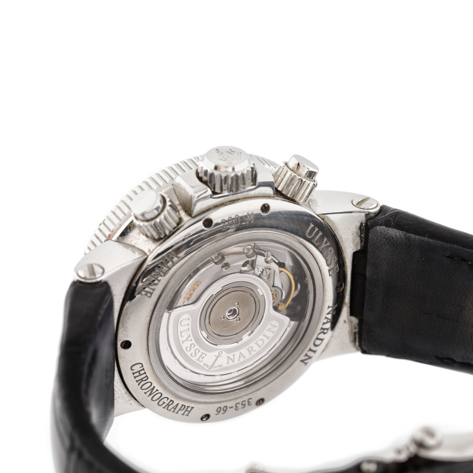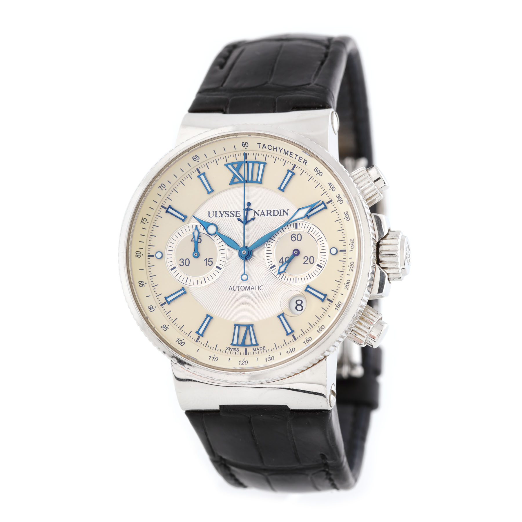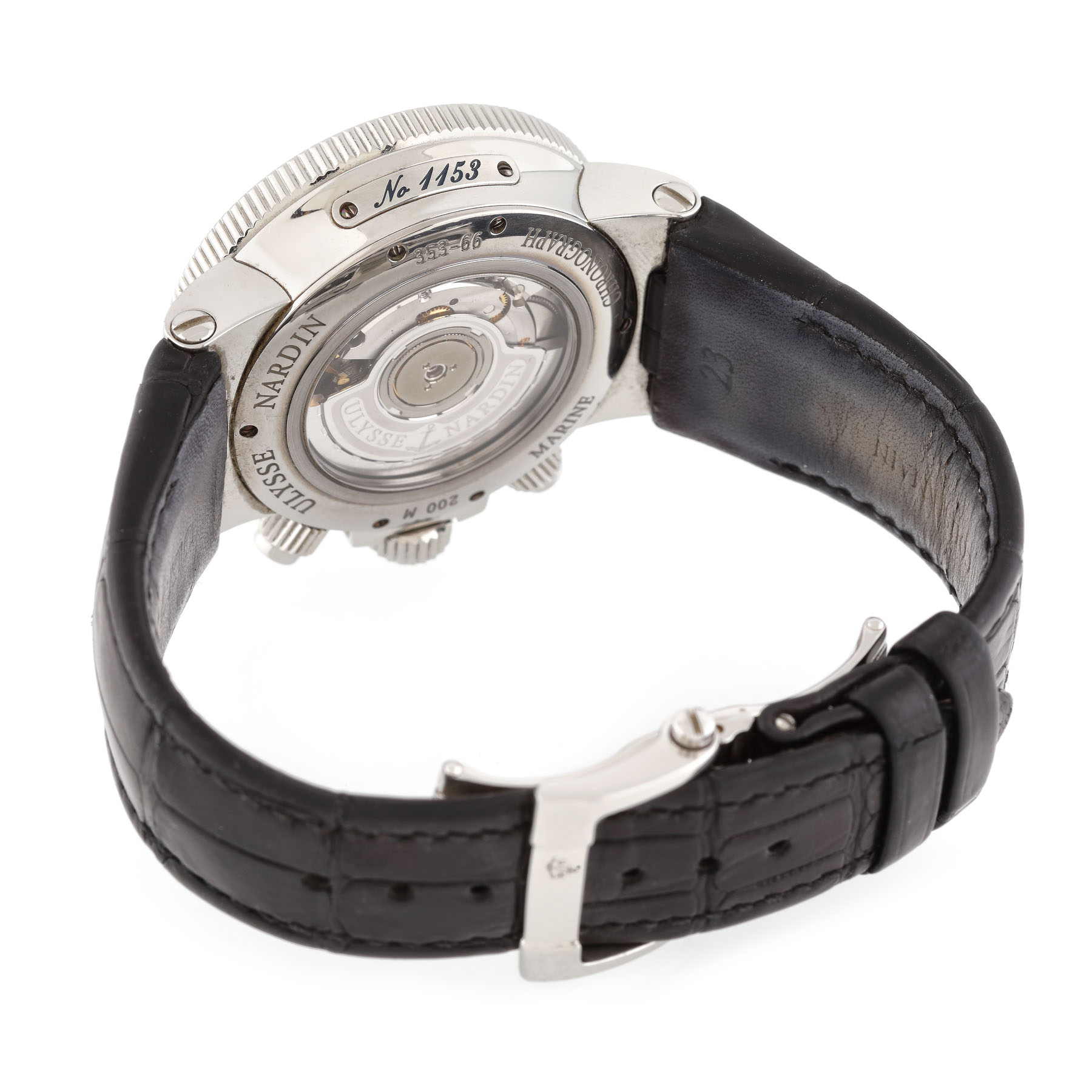 Ceas Ulysse Nardin Maxi Marine Chronograph, de mână, bărbătesc, cu referință 353-66, calibru UN-35, mecanism automatic cronograf, vitrat anterior. Cadranul argintiu și ivoriu, decorat central în tehnica guilloche cuprinde două registre cronograf, numerale romane și dată cu lupă între orele 4 și 5. Curea din piele de crocodil de culoare negru, cu sistem de închidere deployant.
