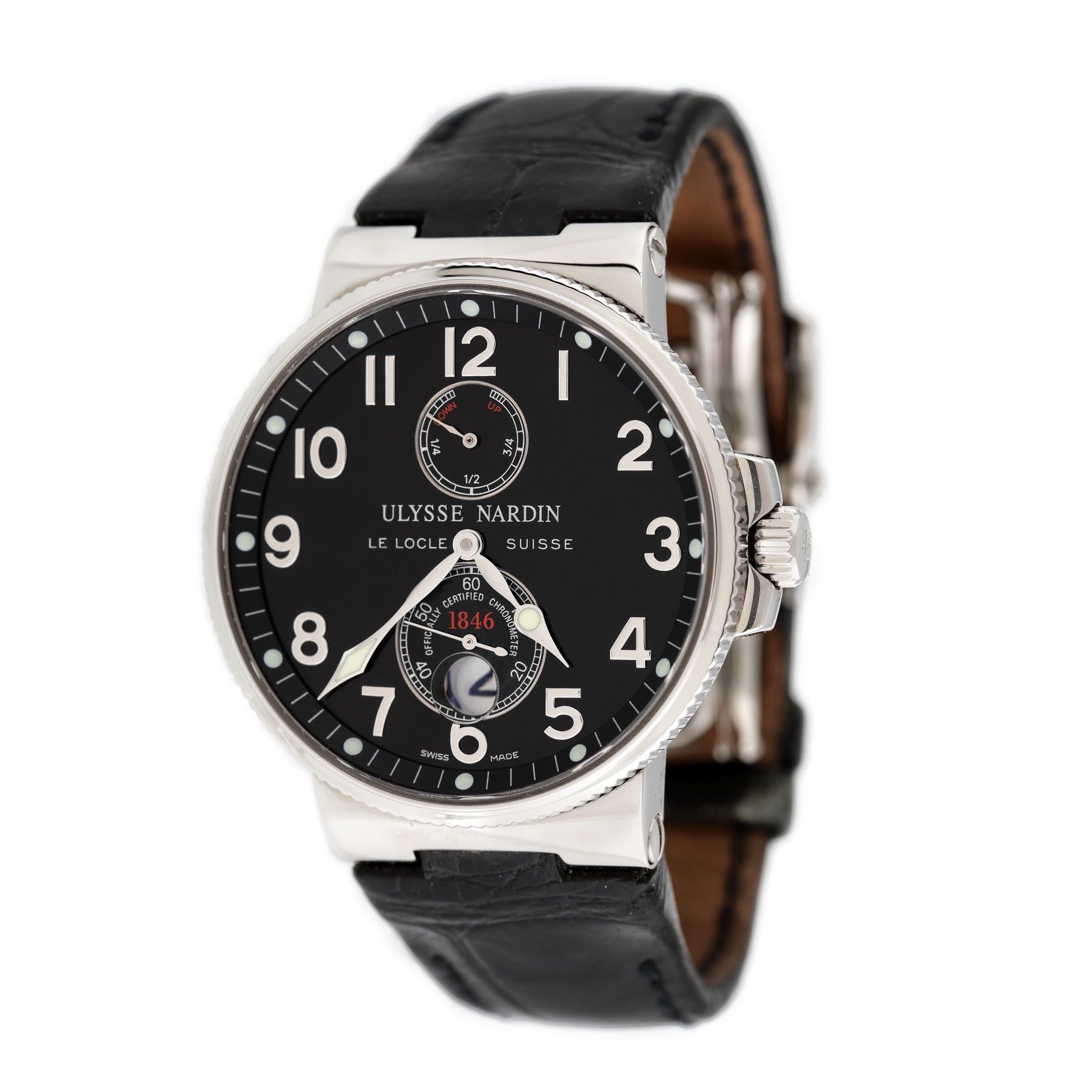 Ceas Ulysse Nardin Maxi Marine, de mână, bărbătesc, cu referință 263-66 și mecanism automatic. Cadran negru, cu cifre arabe argintii, cu marcaje luminiscente și două registre: rezervă de timp în dreptul orei 12; dial pentru secundar și dată cu lupă în dreptul orei 6. Curea din piele, de culoare negru.