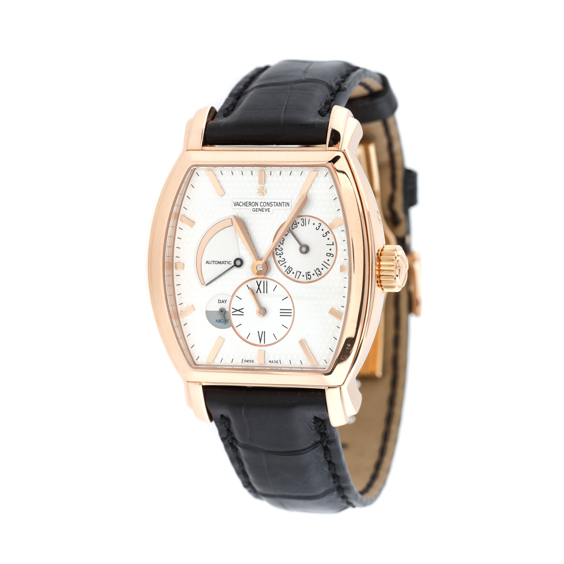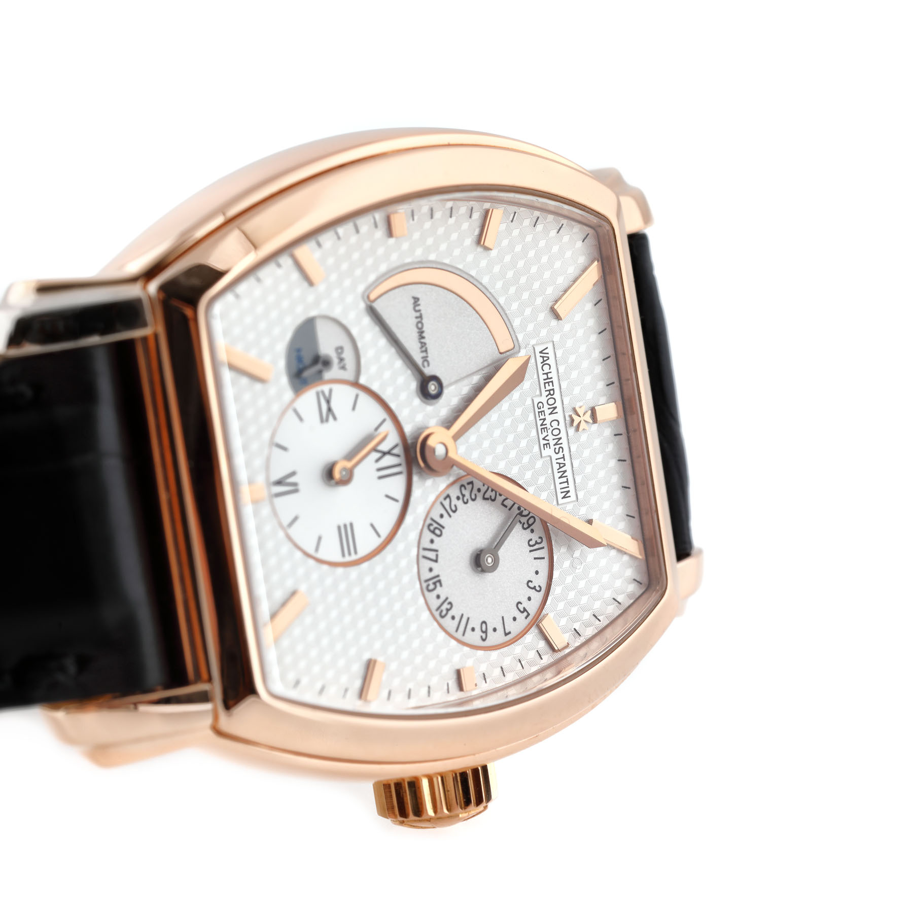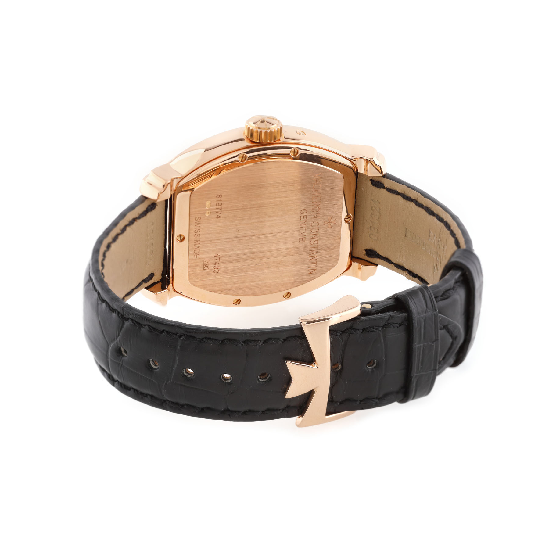 Ceas Vacheron Constantin, din aur roz, de mână, de damă, referință 47400, mecanism automatic. Cadran de culoare crem, dată între orele 2-3. Curea din piele de aligator, de culoare maro și închizătoare originală, din aur roz, tip deployant. Ceasul vine însoțit de actele de proveniență, manualul și cutia originală.
