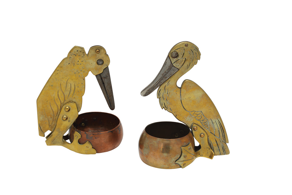 Pereche de piese- set pentru fumat- cu vase circulare la bază, surmontate de figuri zoomorfe (pelican şi corb), cu ciocurile fixate în şarniere, ce prin ridicare acţionează ghilotine pentru tăierea capetelor de trabuc.