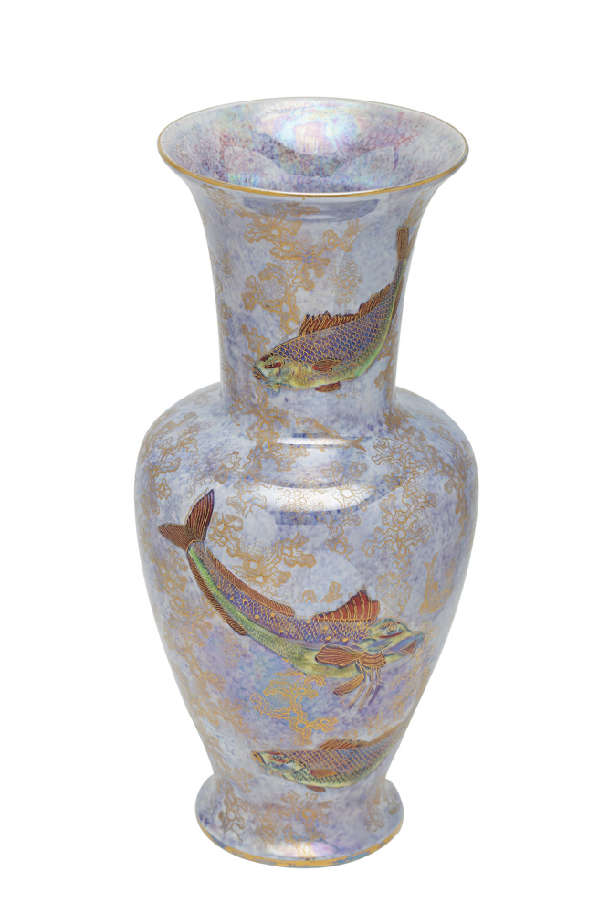 Vas piriform, cu gât înalt și buză evazată, decorat pe întreaga suprafaţă cu motiv abstractizat. Vasul este pictat cu aur coloidal şi cu peşti, trataţi policrom, în manieră naturalistă. Decorul pictat subliniază glazura albastră, metalizată şi craclată tip “blue glaze”, caracteristică anilor 1920 pentru “Wilton Ware”, perioadă în care designul şi decorul vaselor erau proiectate de ceramistul Horace Wain.