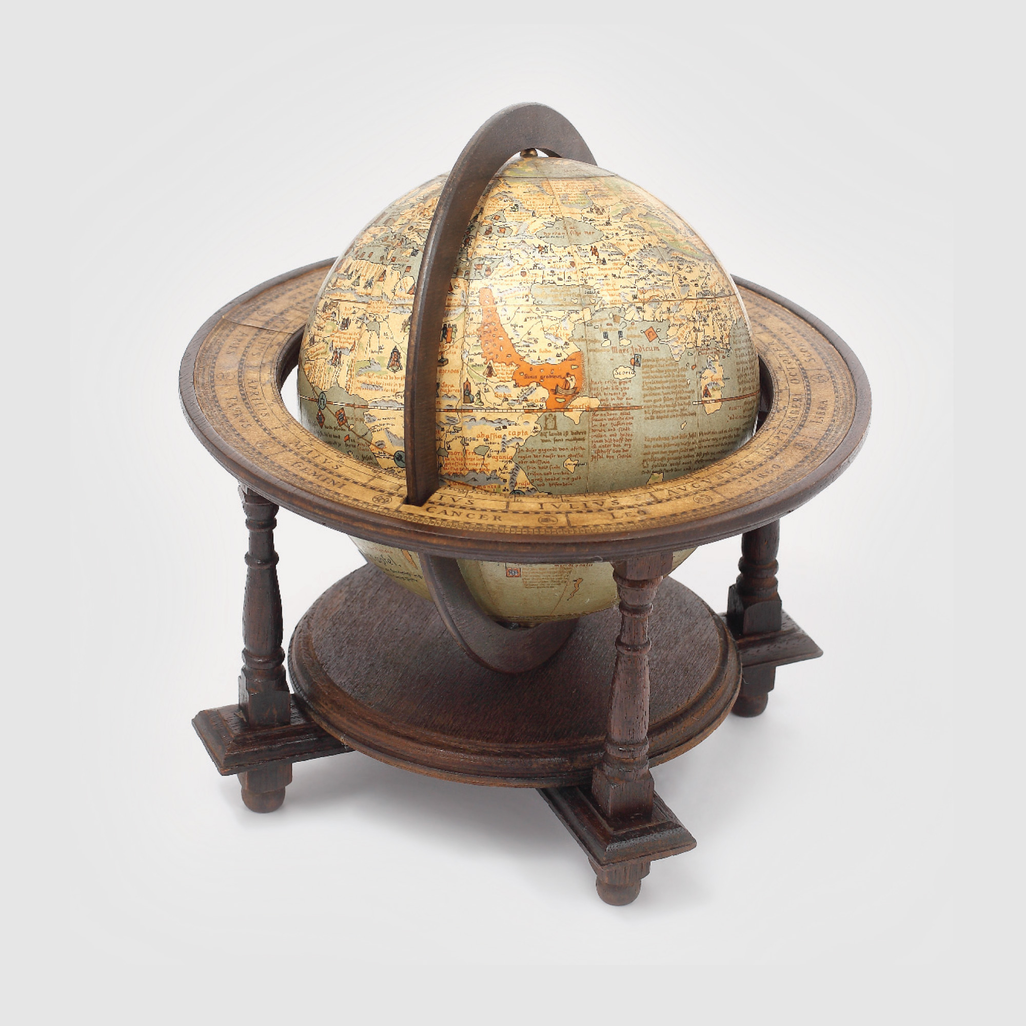 Globul este realizat din carton întărit cu răşină, pe un postament din lemn. Piesa, produsă în 1967 în Germania (ed. Flemmings), în serie mică, reproduce un glob realizat în 1492 de către cartograful Martin Behaim, în anul primei călătorii a lui Cristofor Columb. Este o imagine fidelă a cunoştinţelor geografice ale europenilor la sfârşitul secolului XV: cele două Americi nu sunt prezente, iar India ocupă cea mai mare parte a emisferei estice. Remarcabile sunt şi notările care indică popoare fantastice sau din antichitate, care nu mai existau în momentul realizării originalului. Sunt reproduse şi longitudinile pe rama circulară a suportului, dar şi unele semne ale zodiacului.