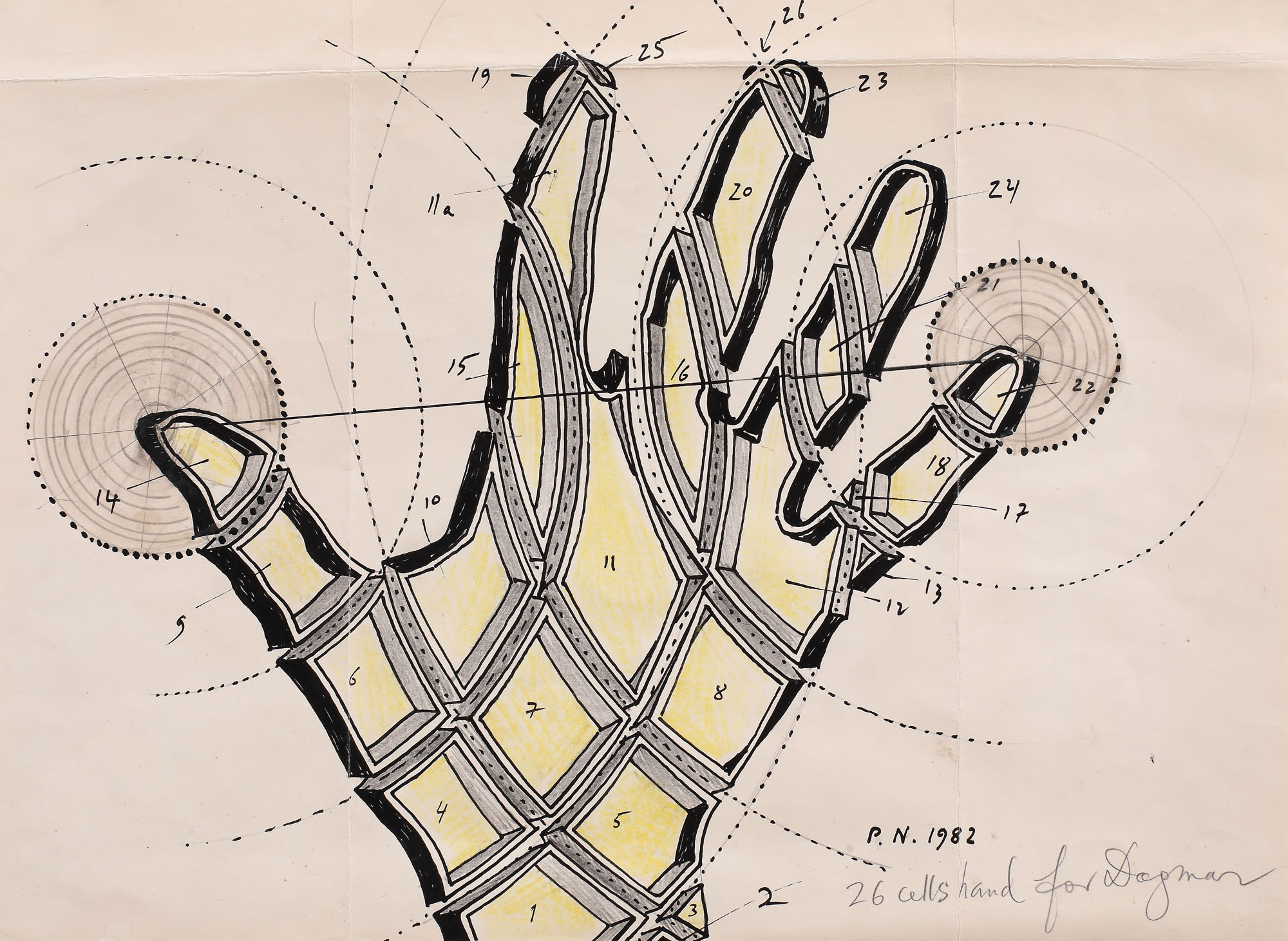 semnat și datat dreapta jos, cu negru, "P.N., 1982"; intitulat dreapta jos, în creion, "26 cells hand for Dogman"
