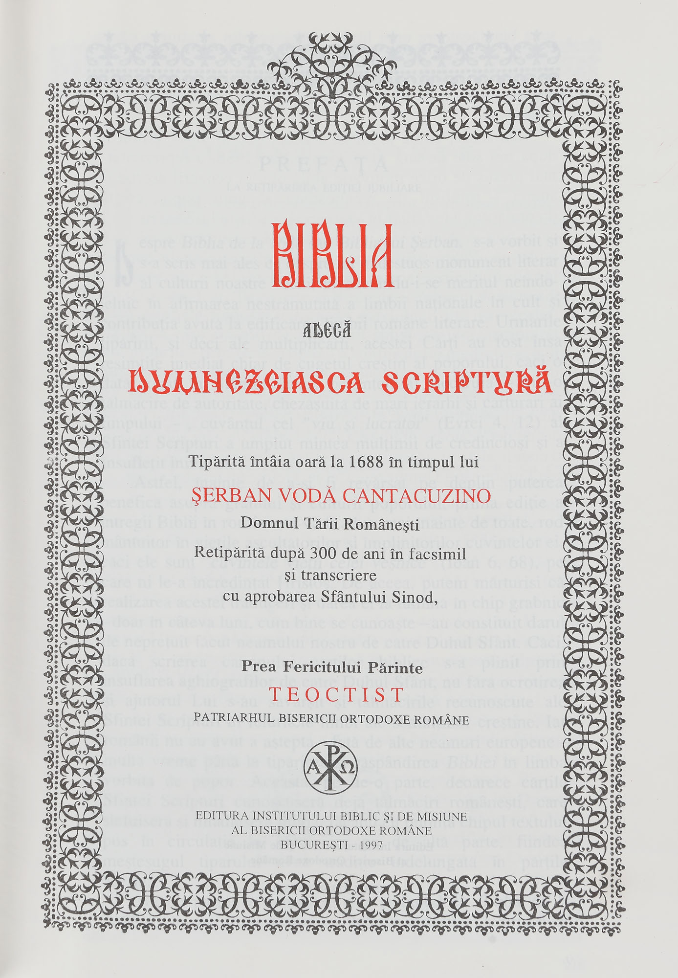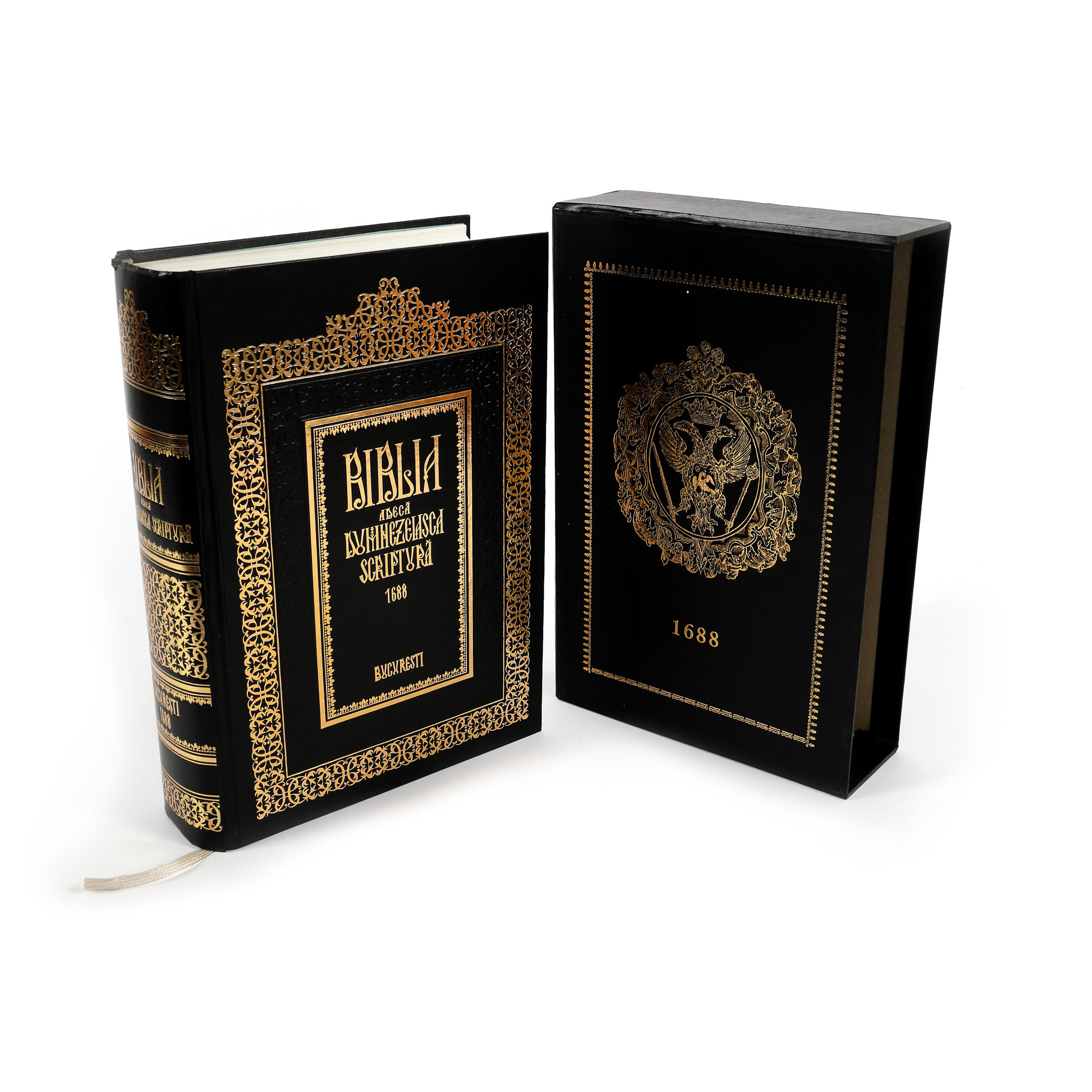 148. Biblia lui Șerban Cantacuzino, retipărită sub îngrijirea Patriarhului Teoctist, 1997, cu etui, donație a doamnei Otilia Sava, fost secretar de stat în Ministerul Apărării