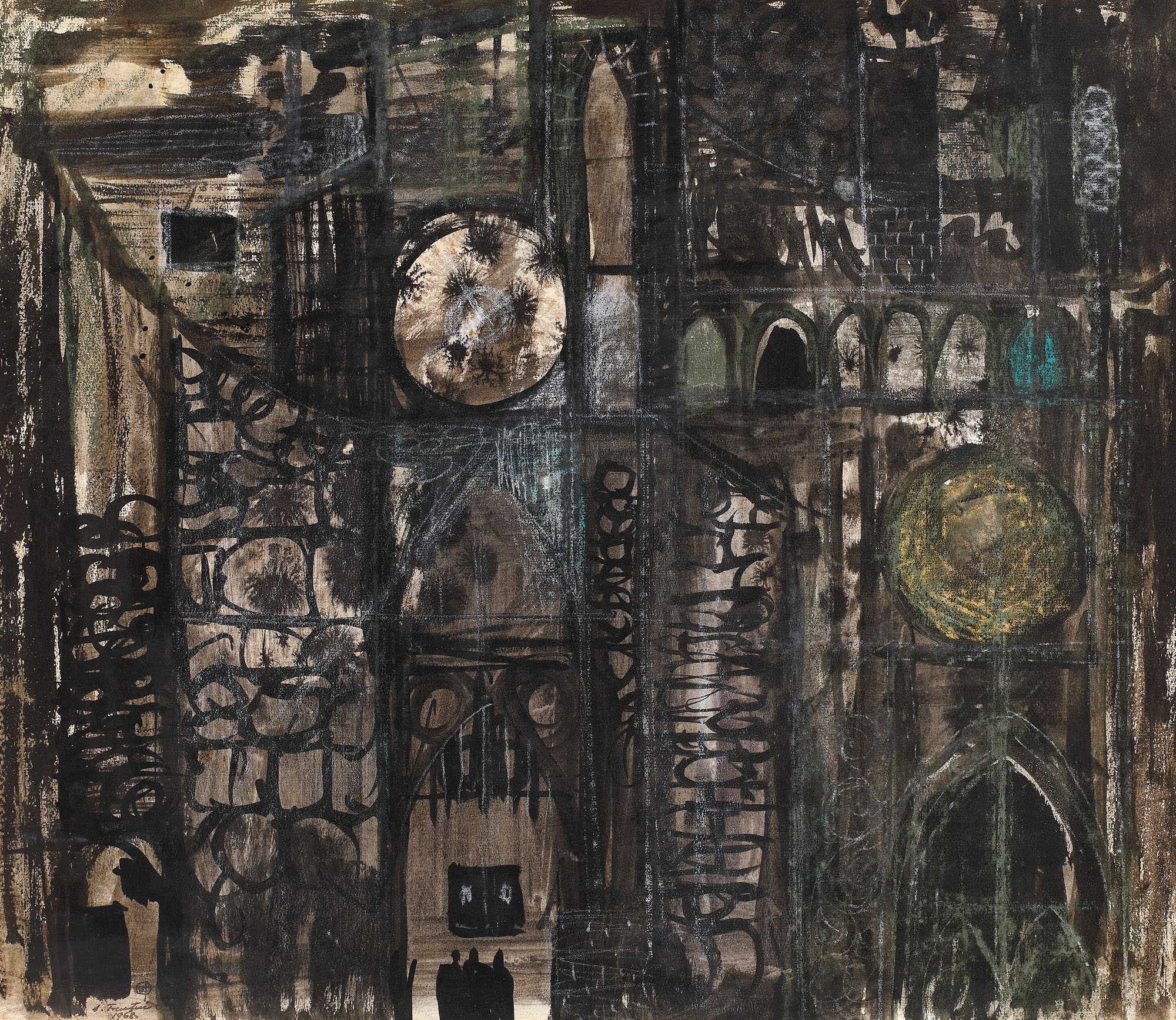 acuarelă, tuș, cărbune și creioane colorate pe hârtie