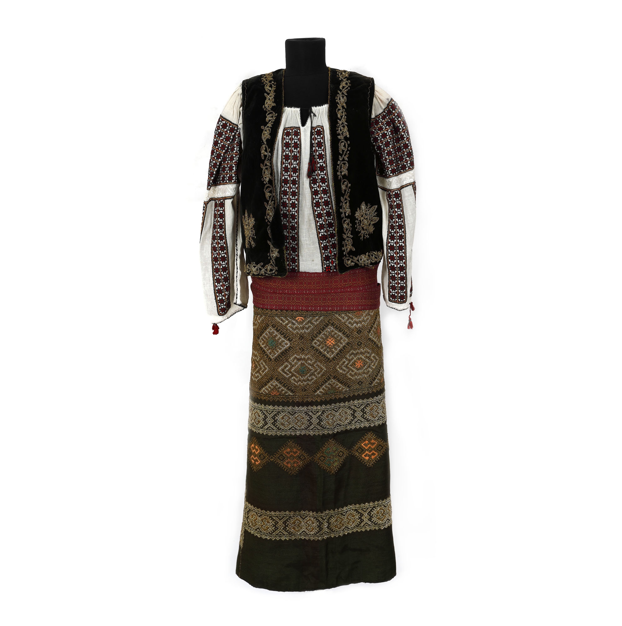 145. Costum popular alcătuit din ie, ilic, fotă și brâu, reprezentativ pentru zona Argeș, donație a psihologului Viorica Sandu [a doua jumătate a sec. XX]