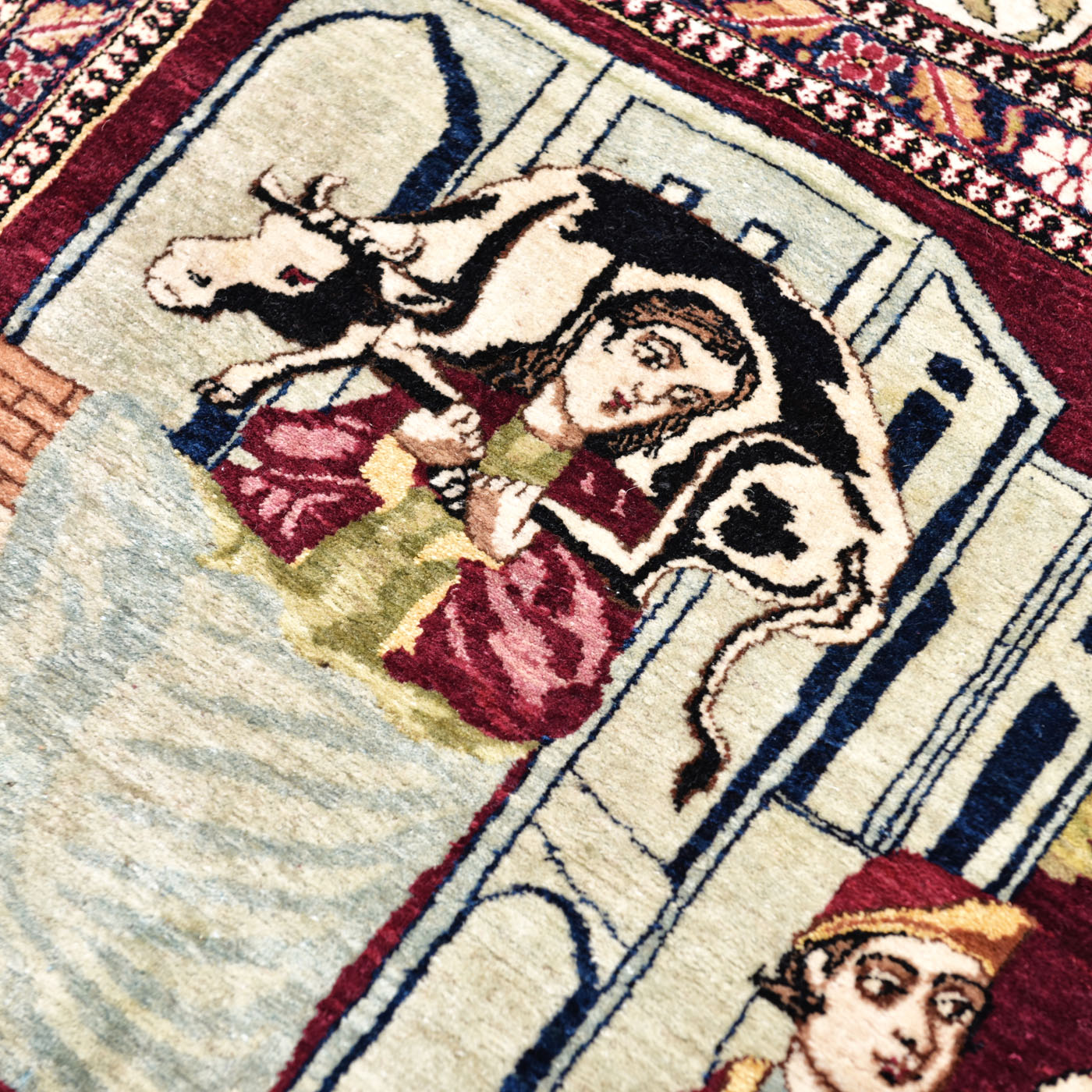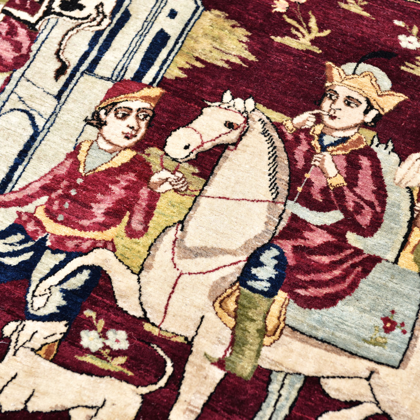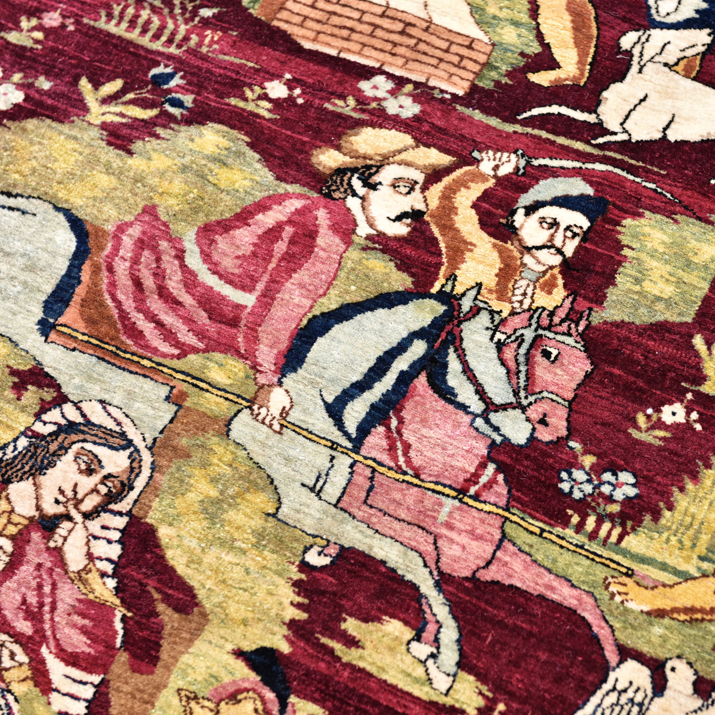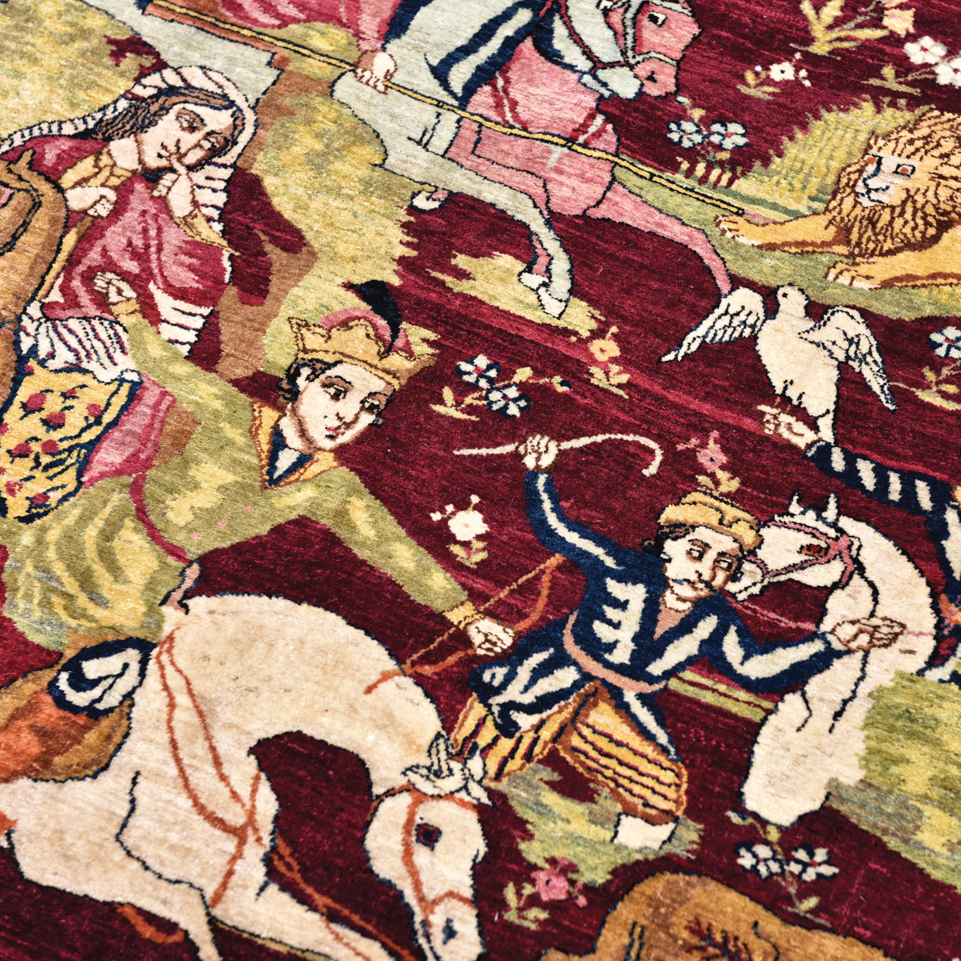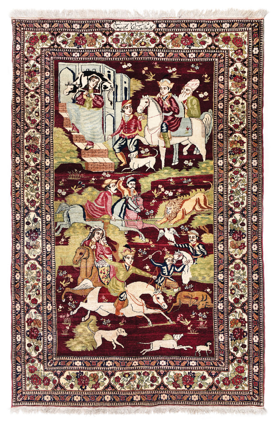 62. Covor Isfahan din lână, ilustrând o scenă de vânătoare din poemul ”Khamsa” de Nizami Ganjavi, purtând semnătura maestrului Abdolkarim Esfahani, Iran, sfârșitul sec. XIX