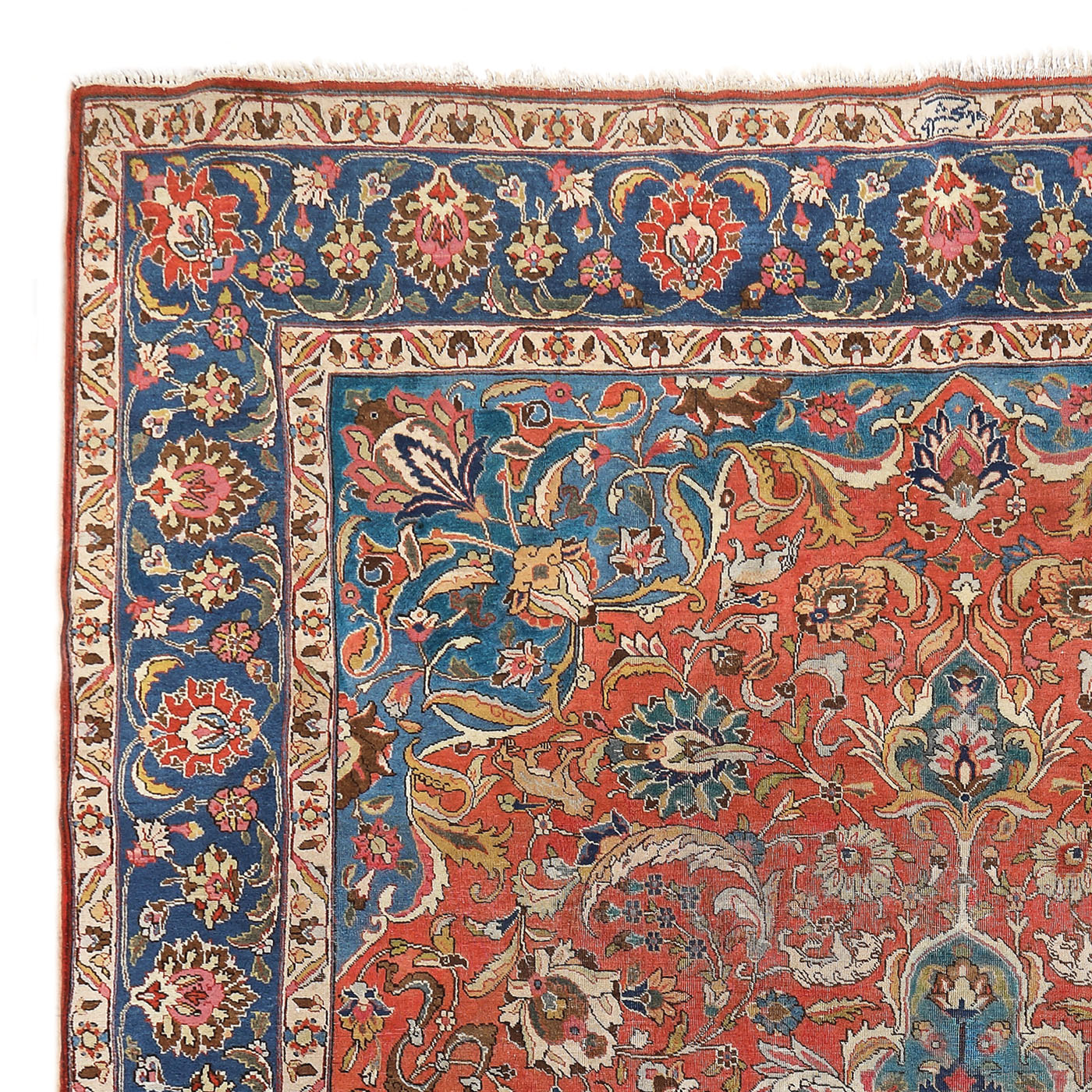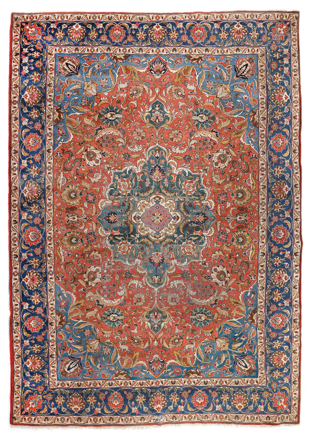44. Covor Tabriz din lână, semnat, decorat cu palmete, lotuși stilizați, animale și alte motive de inspirație safafidă, Iran, cca. 1910-1920, piesă rară de colecție