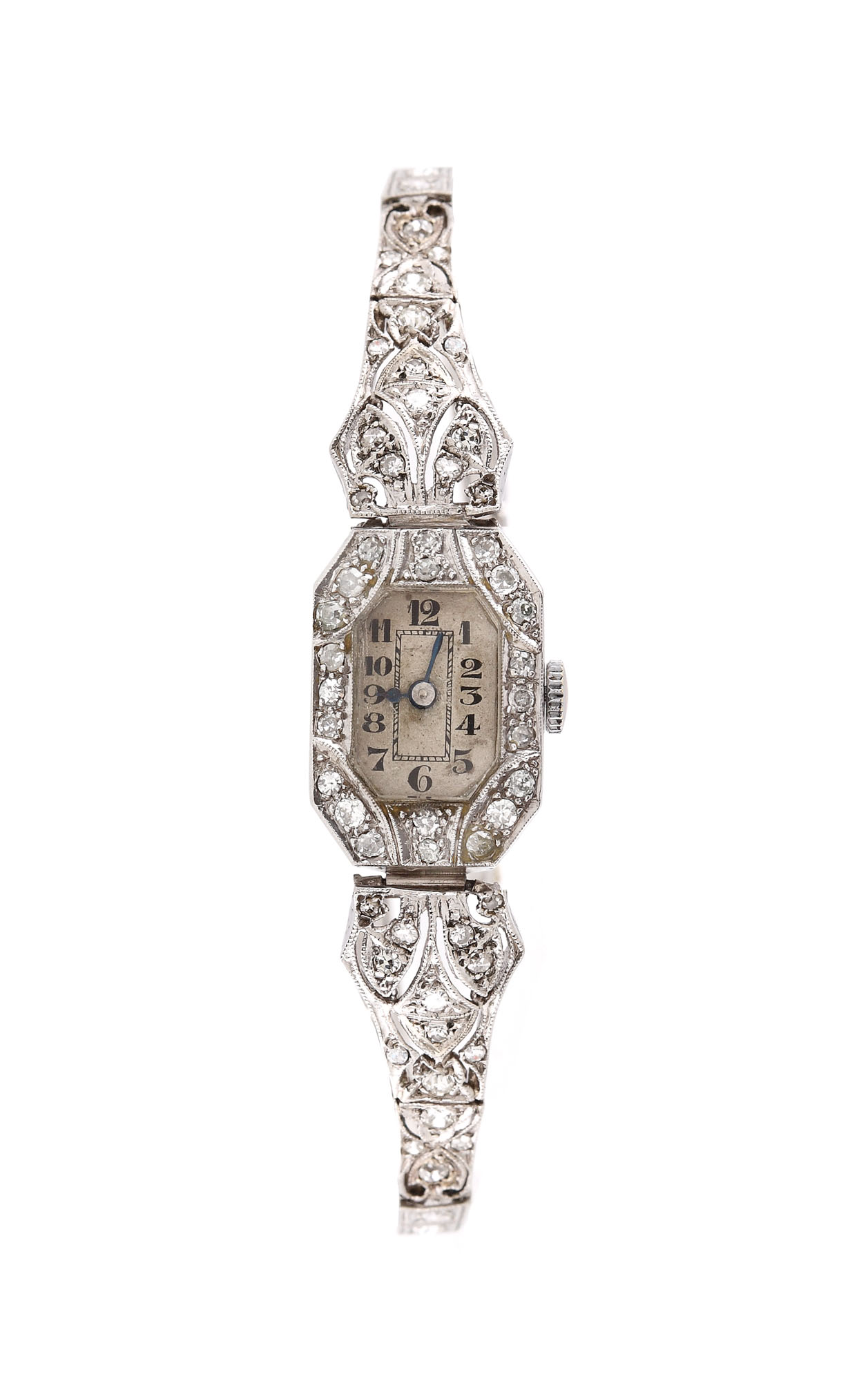 44. Elegant ceas de mână, de damă, din platină, decorat cu diamante