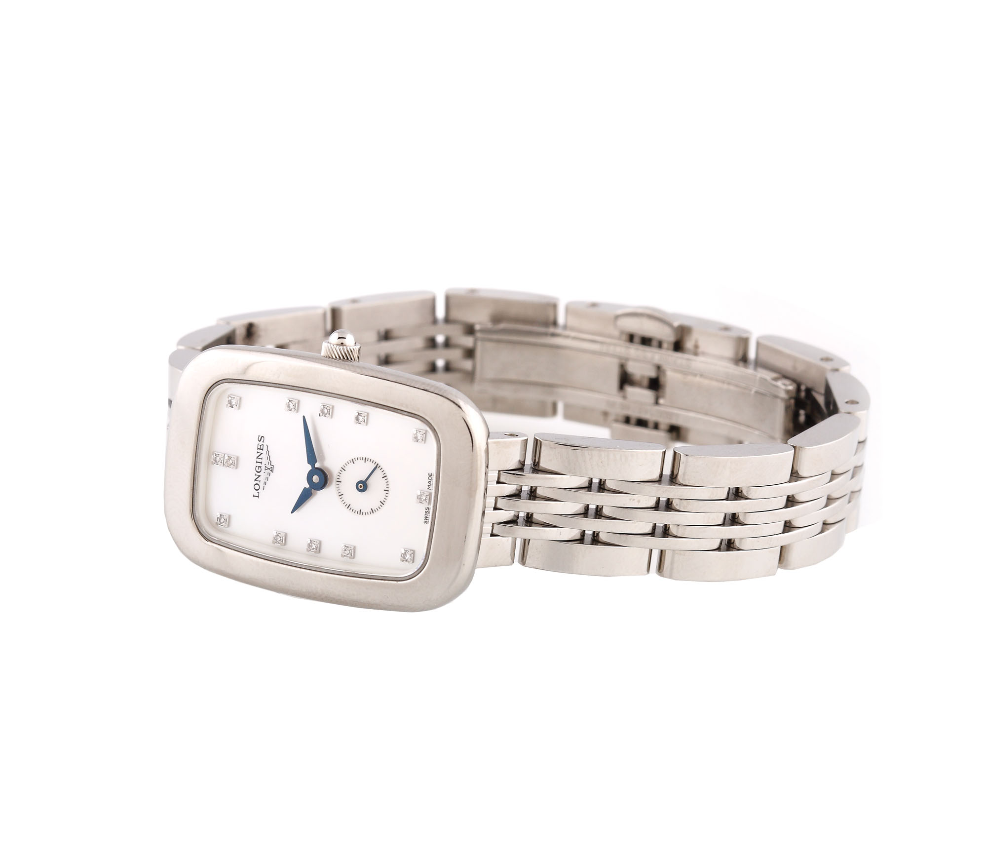Ceas de mână de damă Longines Equestrian, mecanism quartz, referință L6.141.4. Cadran din sidef, secundar la ora 6 și diamante la ore.