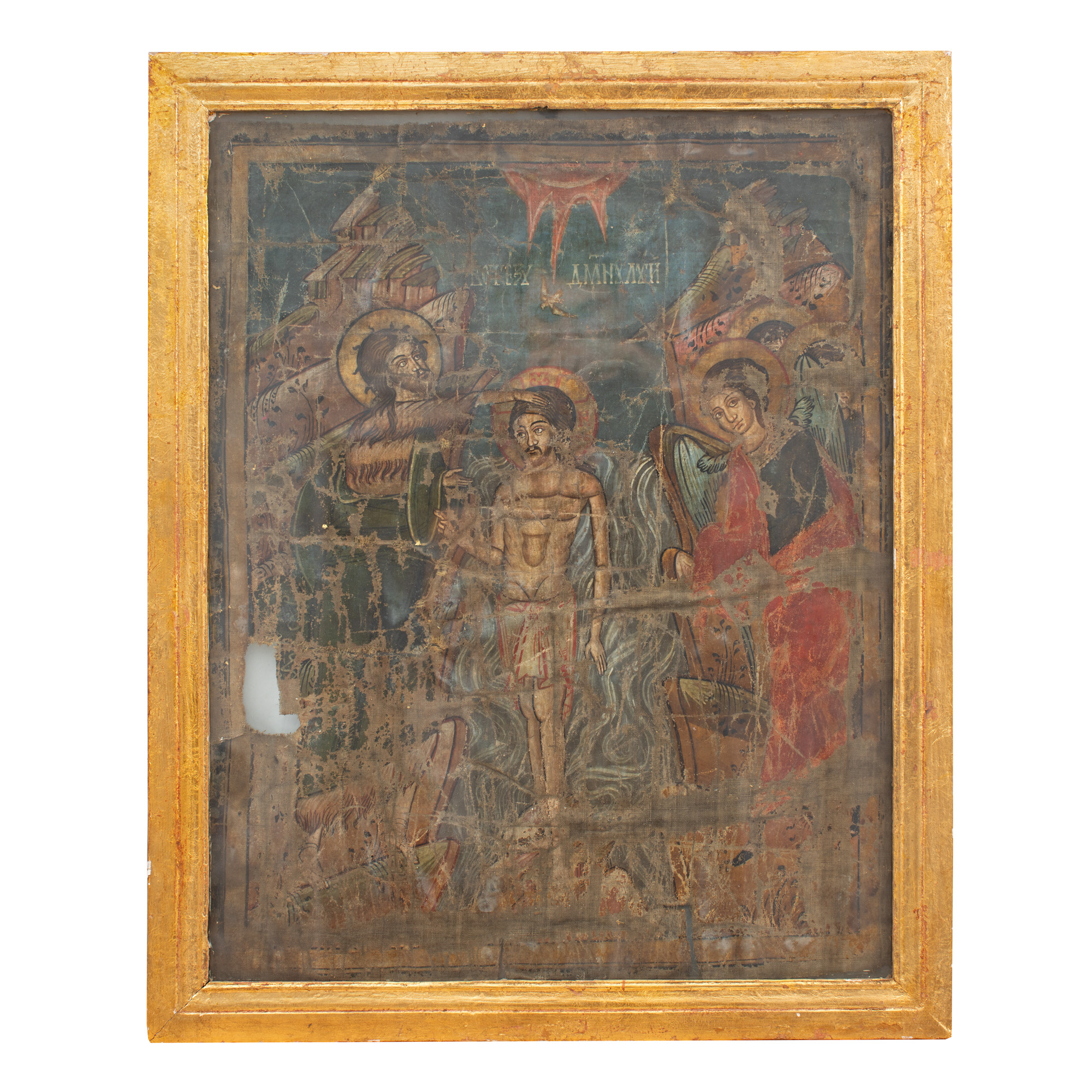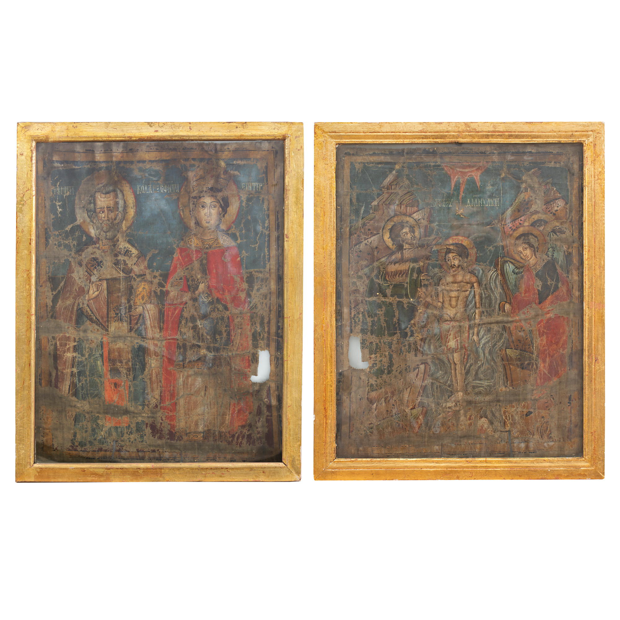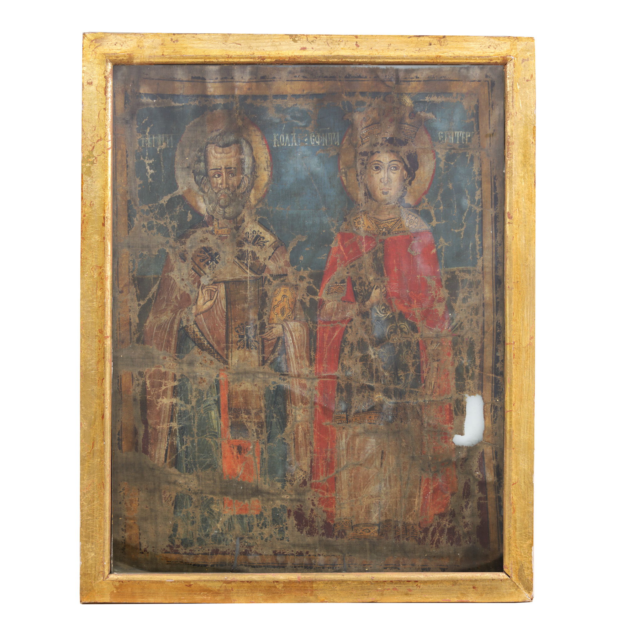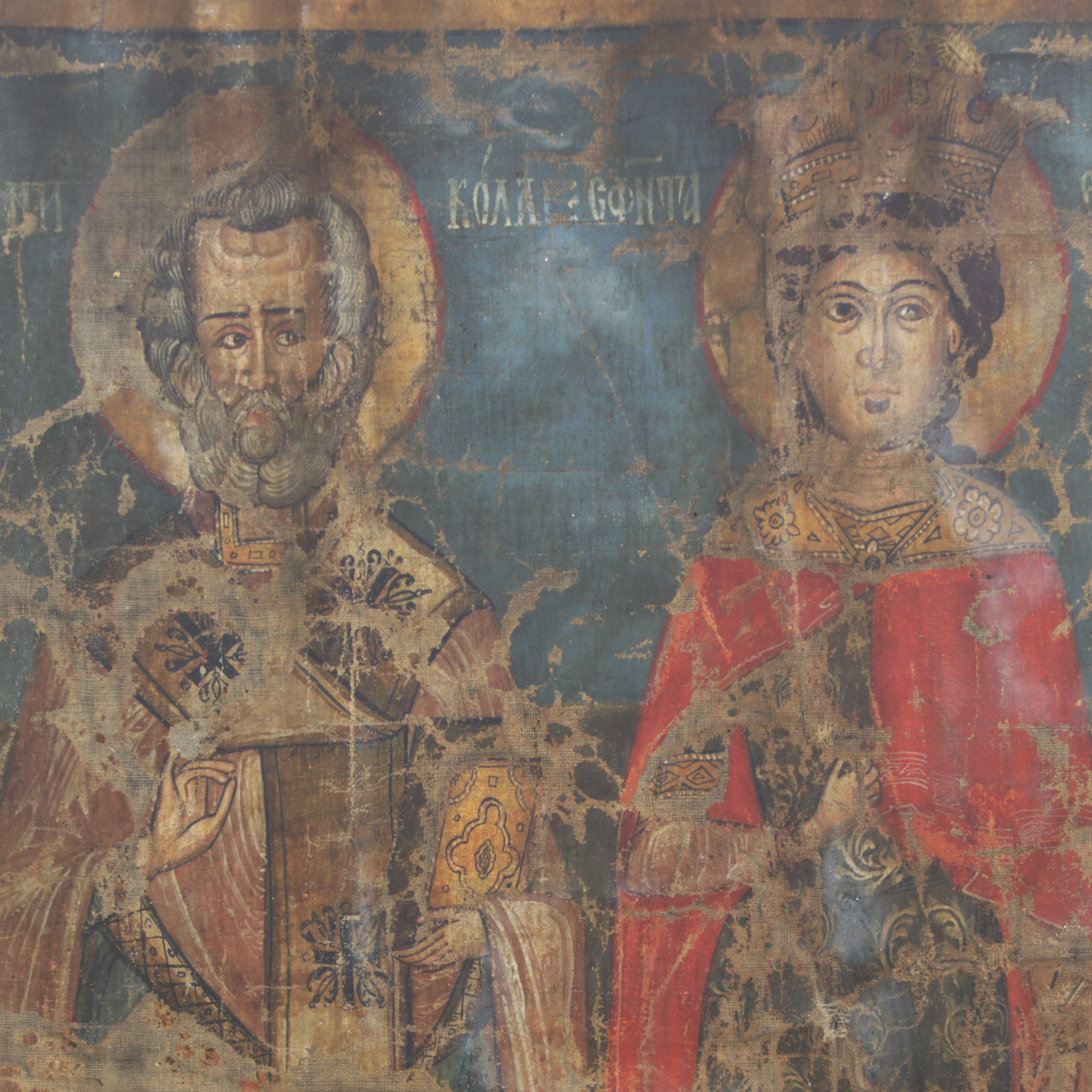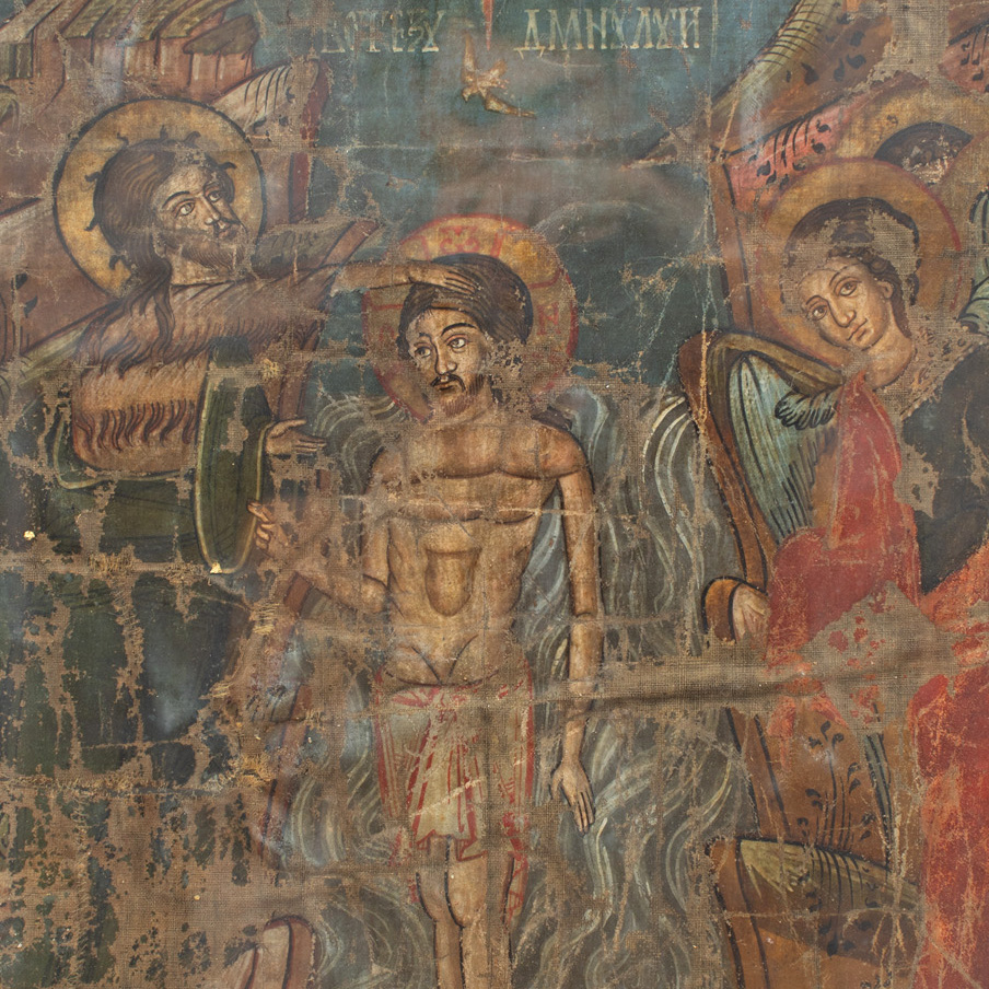 65. Fragment de prapur decorat pe ambele fețe cu scenele, ”Botezul Domnului” și ”Sfântul Nicolae și Sfânta Ecaterina”, școală post-brâncovenească, jumătatea sec. XVIII, piesă rară, de colecție