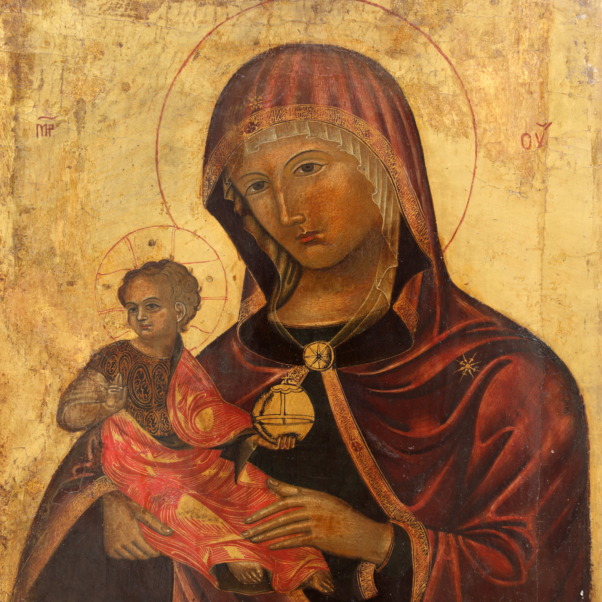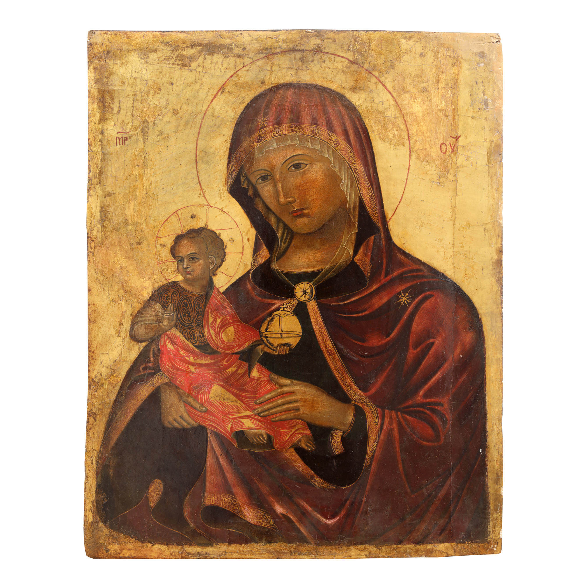 102C. Icoană cretano-venețiană pe lemn, ”Maica Domnului cu Pruncul (Eleusa)”, începutul sec. XVI, piesă foarte rară, de colecție
