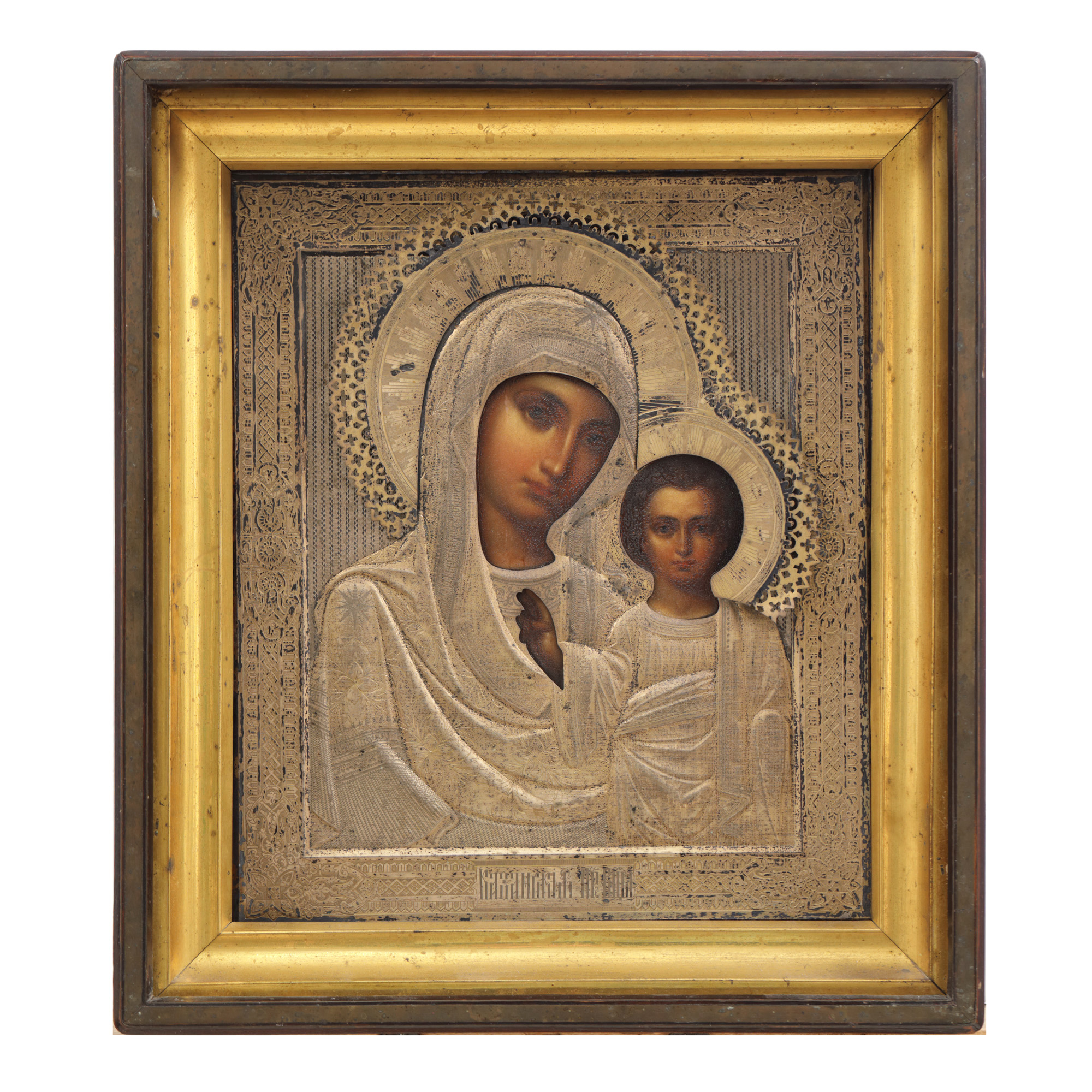 129. Icoană pe lemn, cu ferecătură din argint aurit, ”Maica Domnului cu Pruncul (Kazanskaia)”, școală rusească, a doua jumătate a sec. XIX