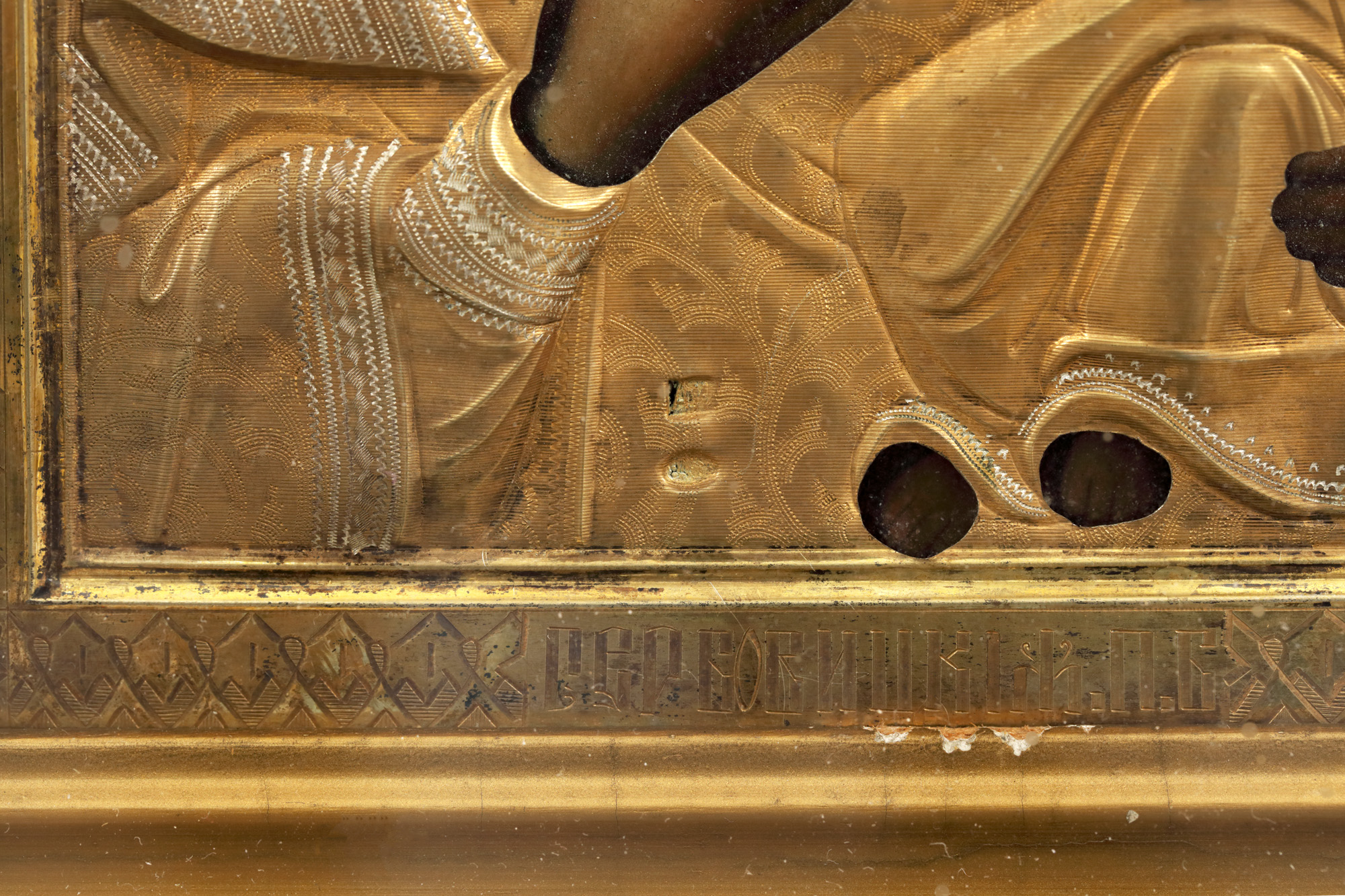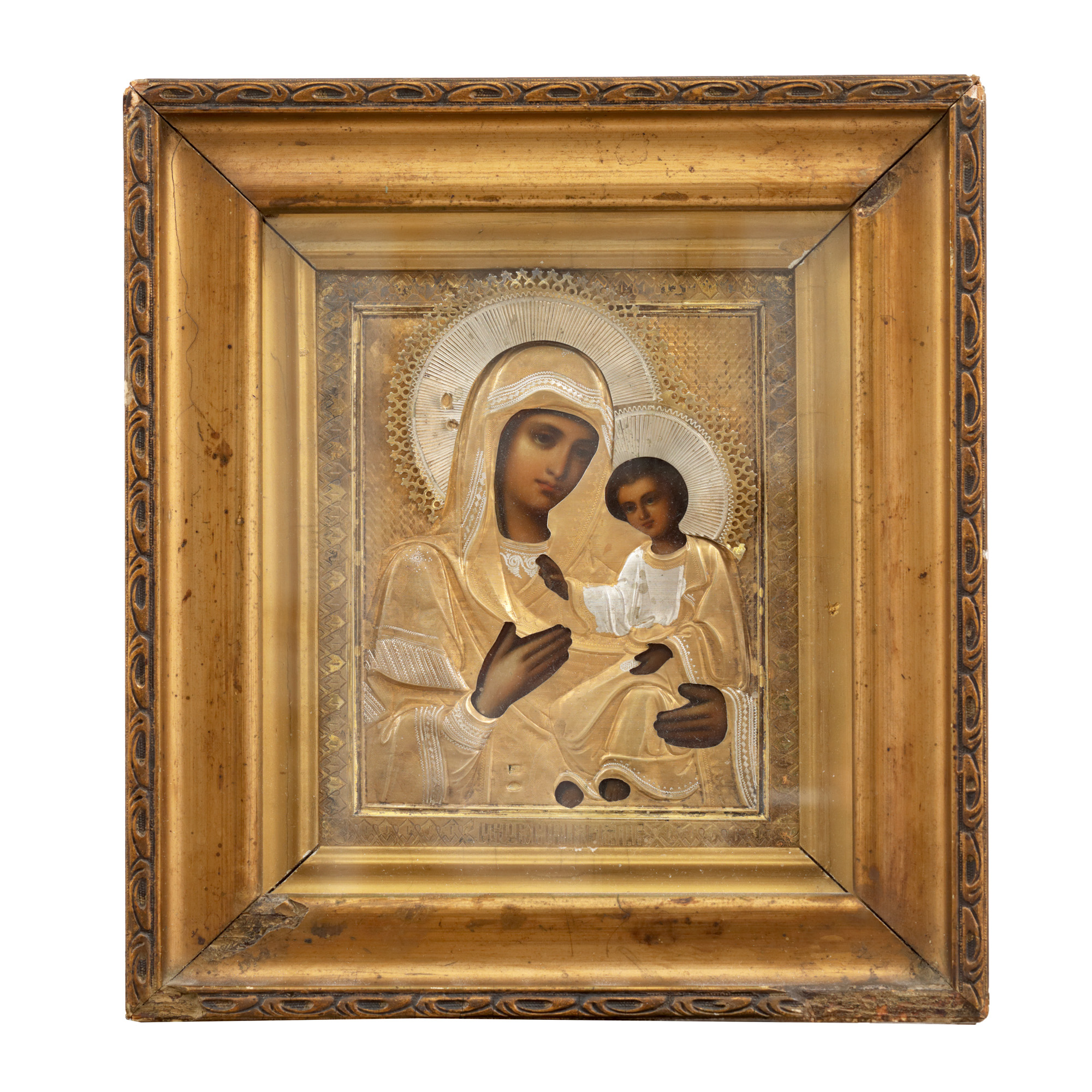 116. Icoană pe lemn, cu ferecătură din argint aurit, ”Maica Domnului cu Pruncul”, școală rusească, 1896