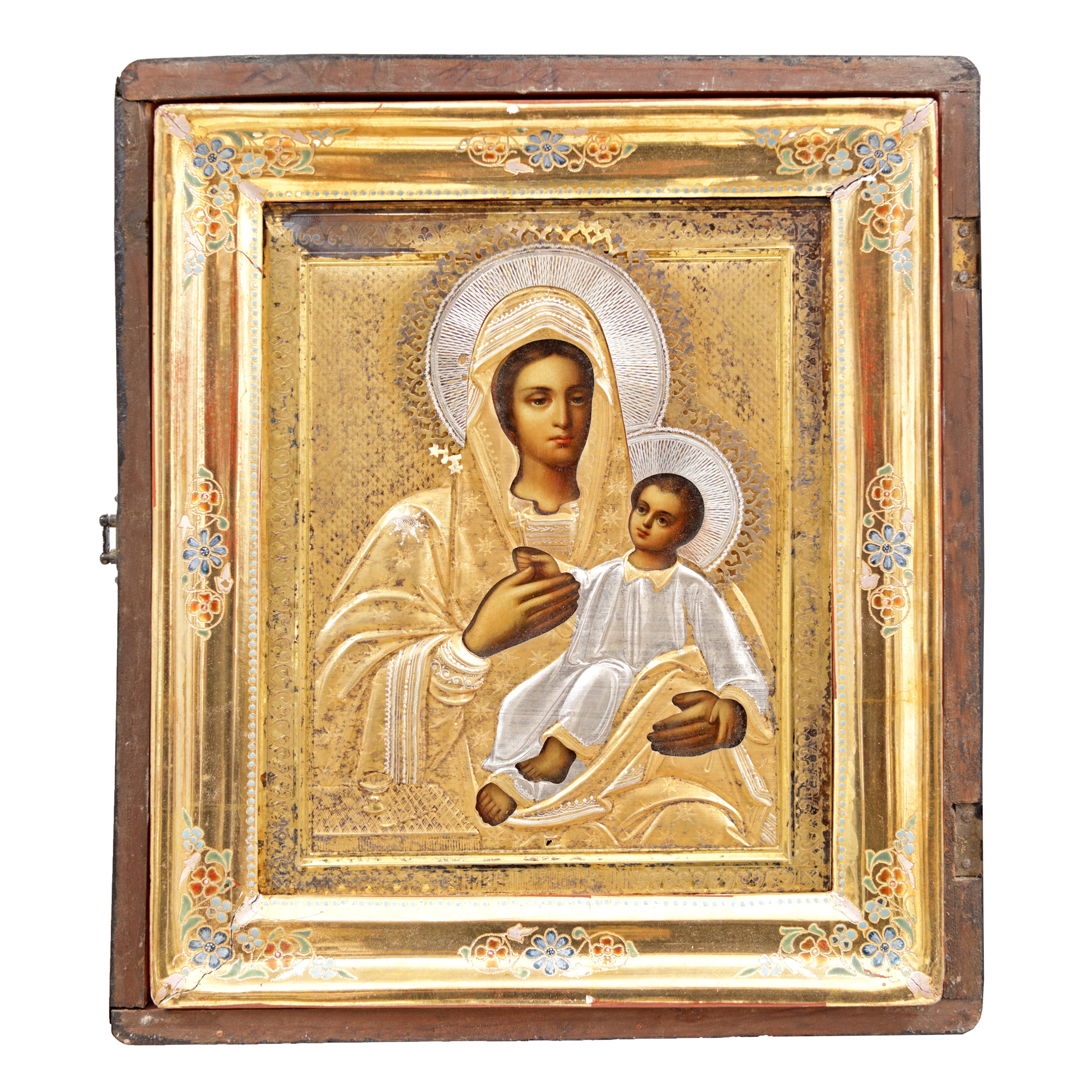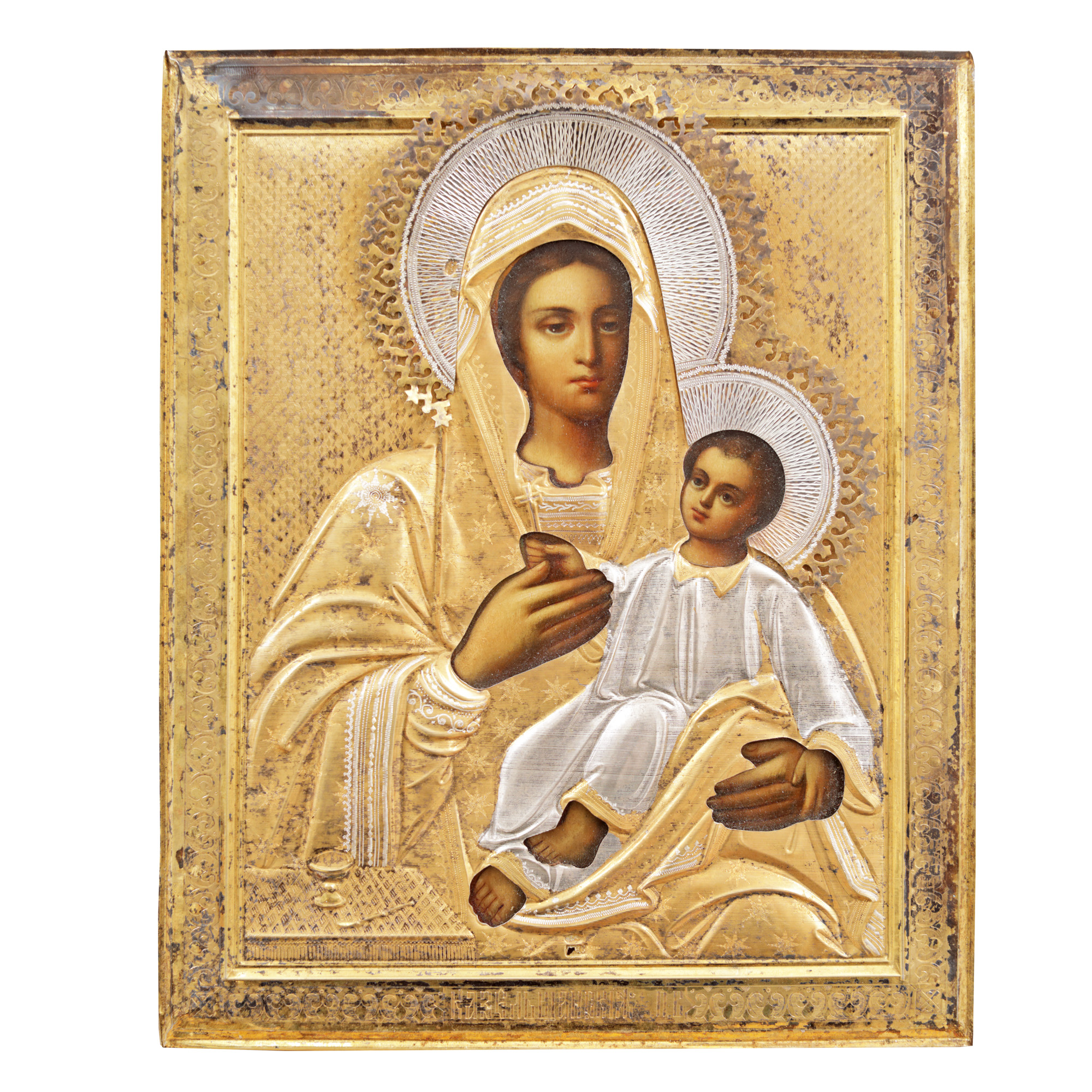 121. Icoană pe lemn, cu ferecătură din argint aurit, ”Maica Domnului cu Pruncul”, școală rusească, cca. 1900, piesă de colecție