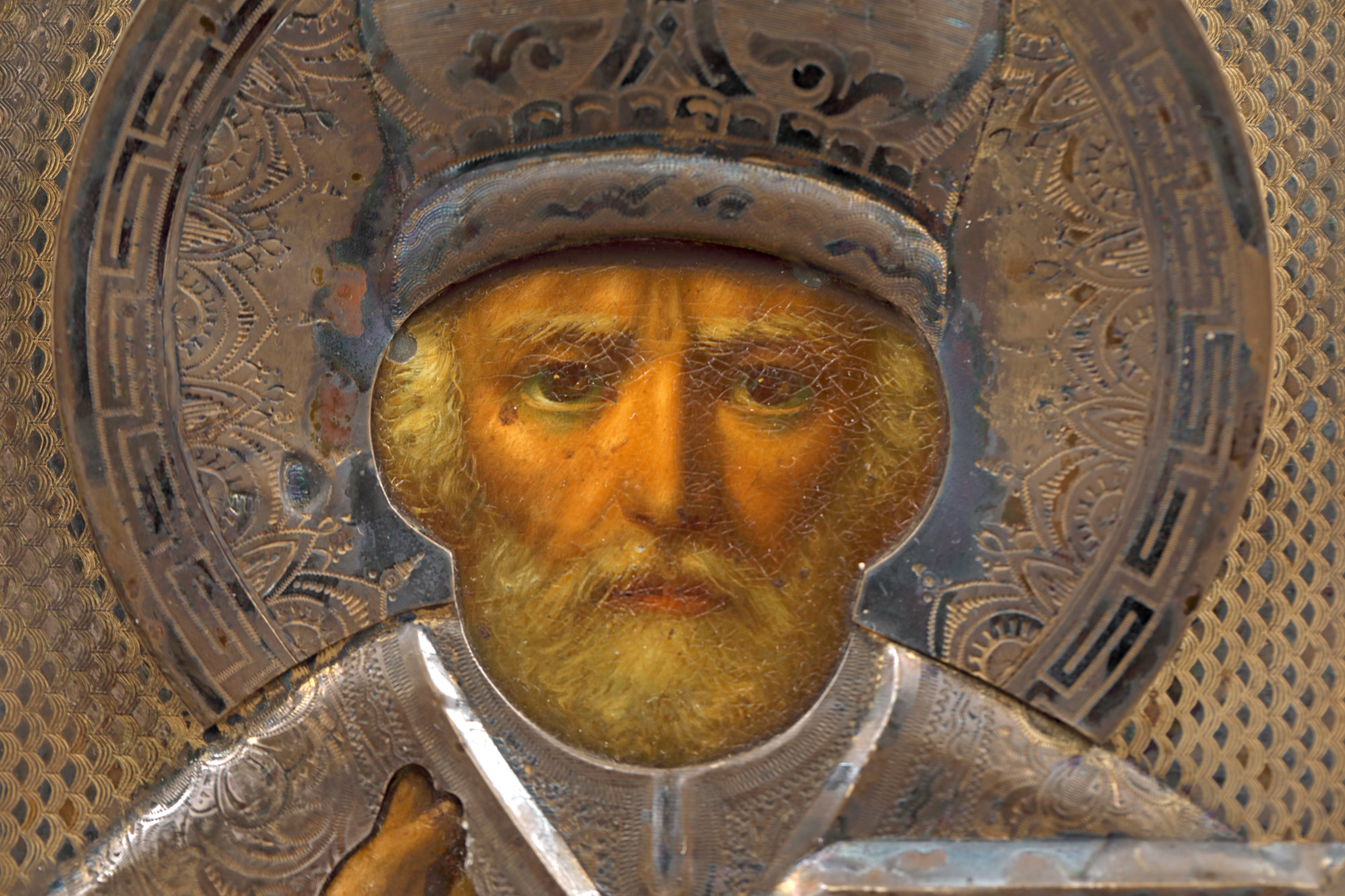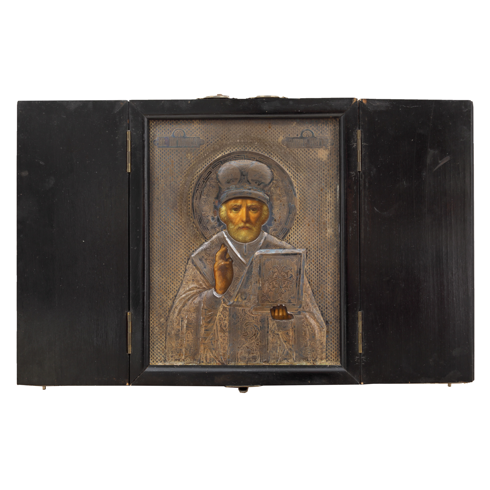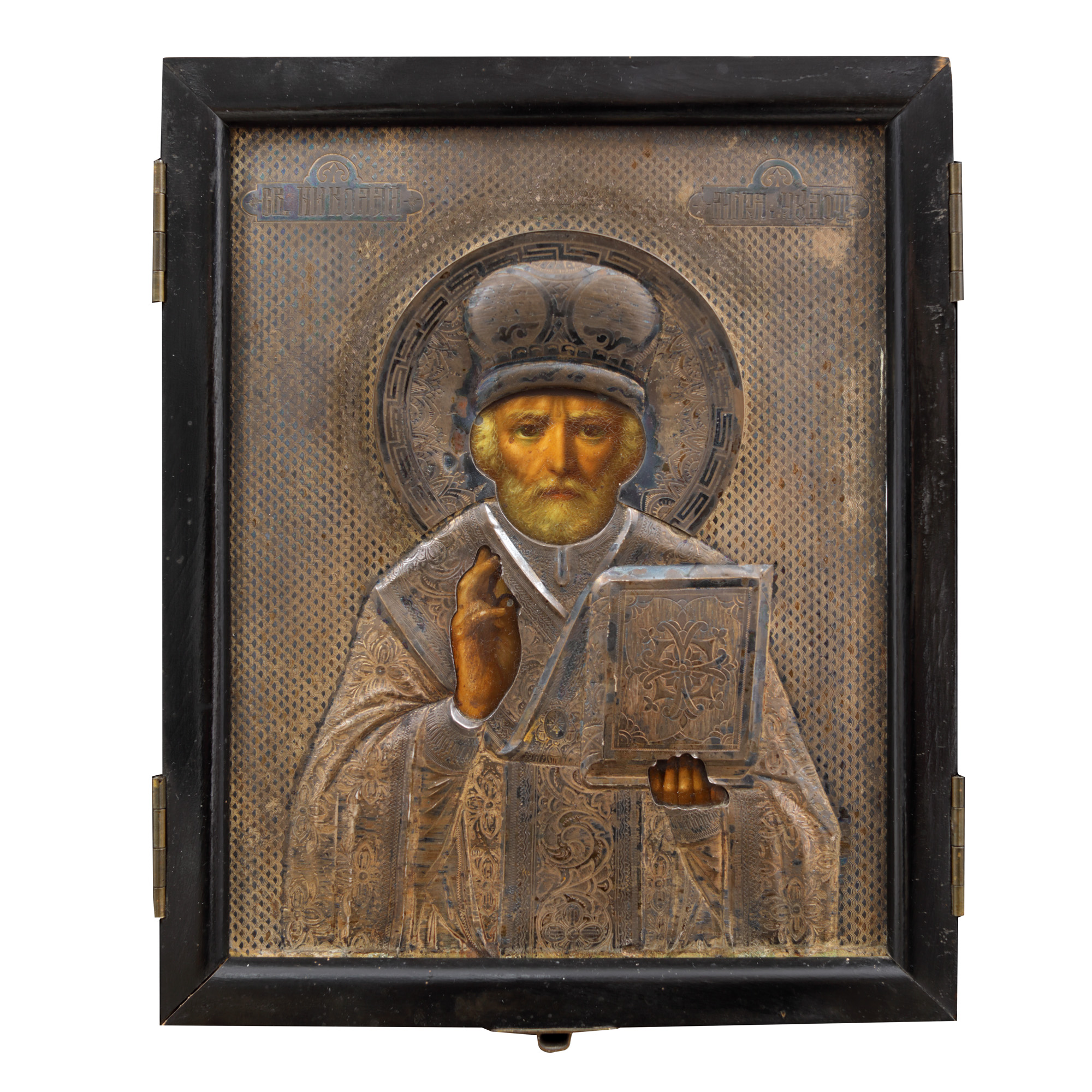 128. Icoană pe lemn, cu ferecătură din argint aurit, ”Sfântul Ierarh Nicolae”, școală rusească, a doua jumătate a sec. XIX, piesă extrem de rară, de colecție