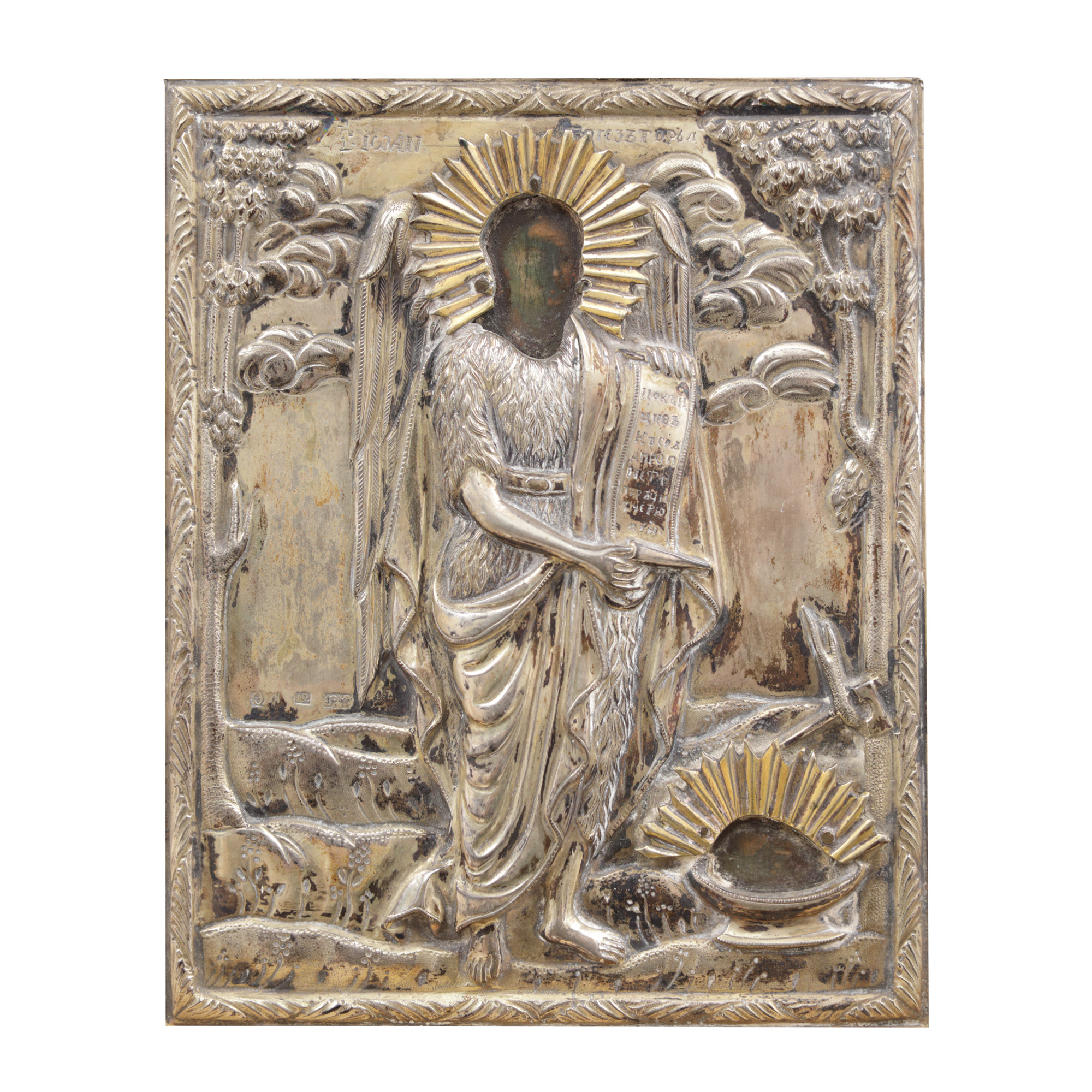 113. Icoană pe lemn, cu ferecătură din argint aurit, ”Sfântul Ioan Botezătorul - Îngerul deșertului”, zugrav K.L., probabil școală de Căldărușani, 1840, piesă rară, de colecție