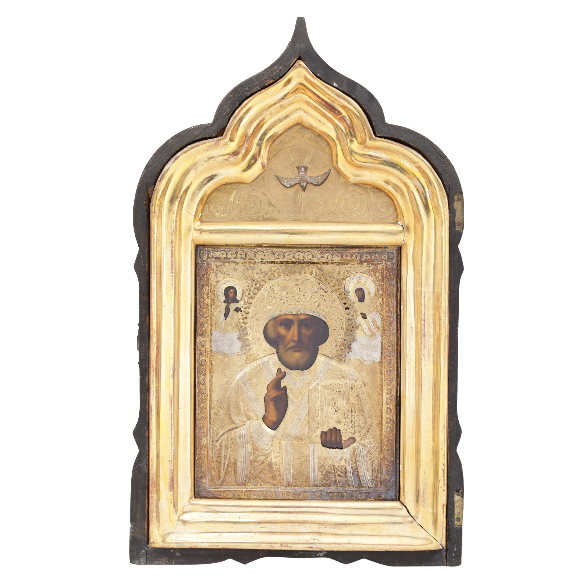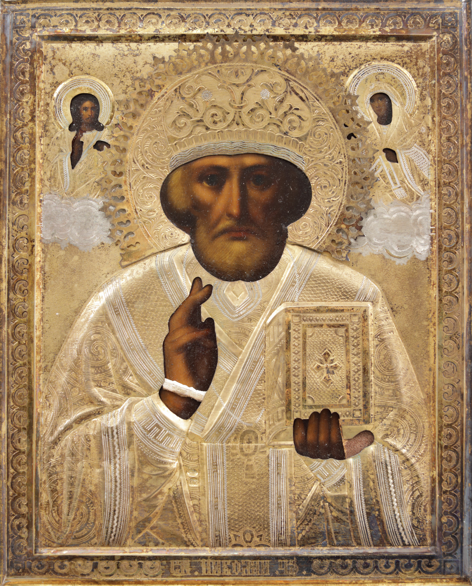 127. Icoană pe lemn, cu ferecătură din argint aurit, ”Sfântul Nicolae”, școală rusească, cca. 1900, de colecție
