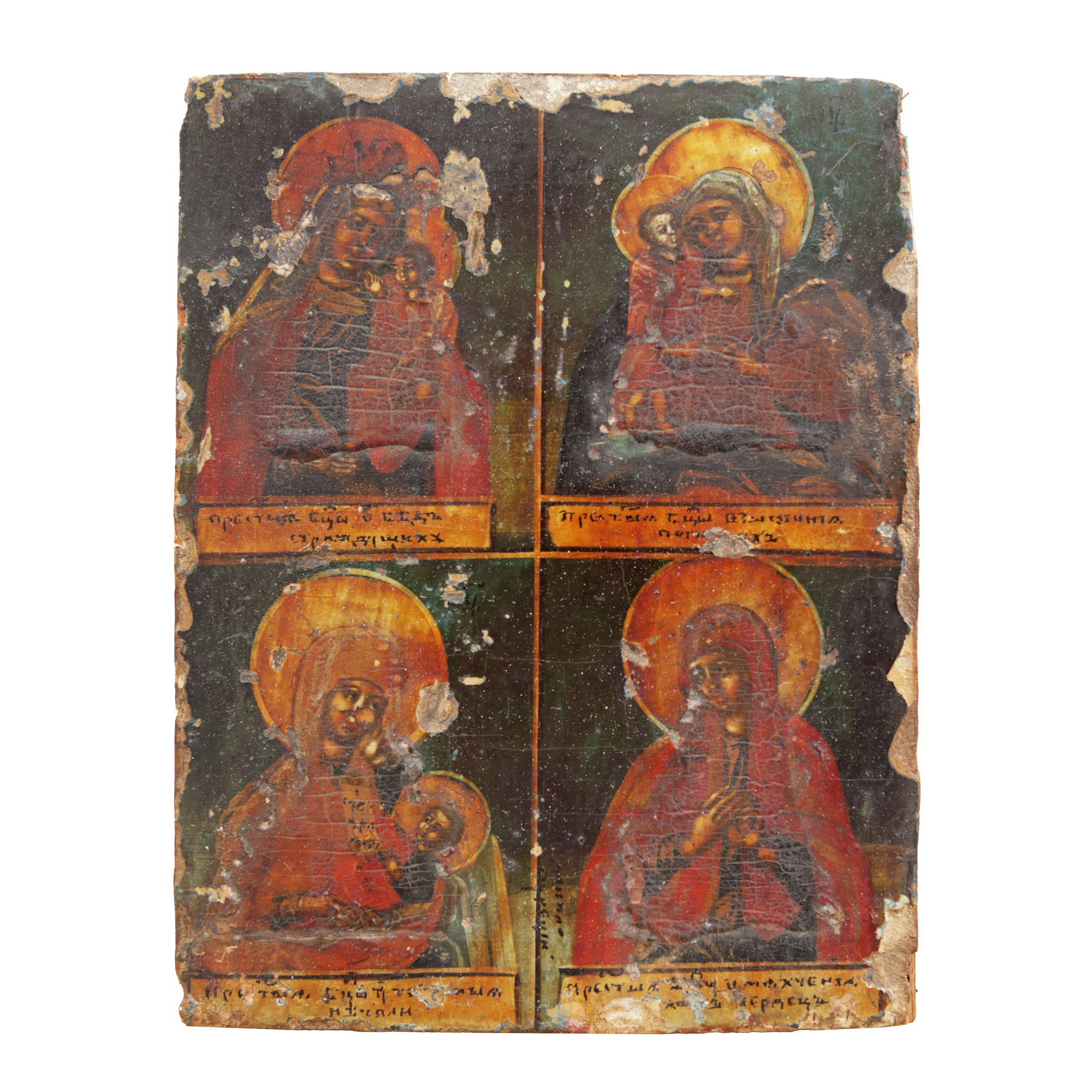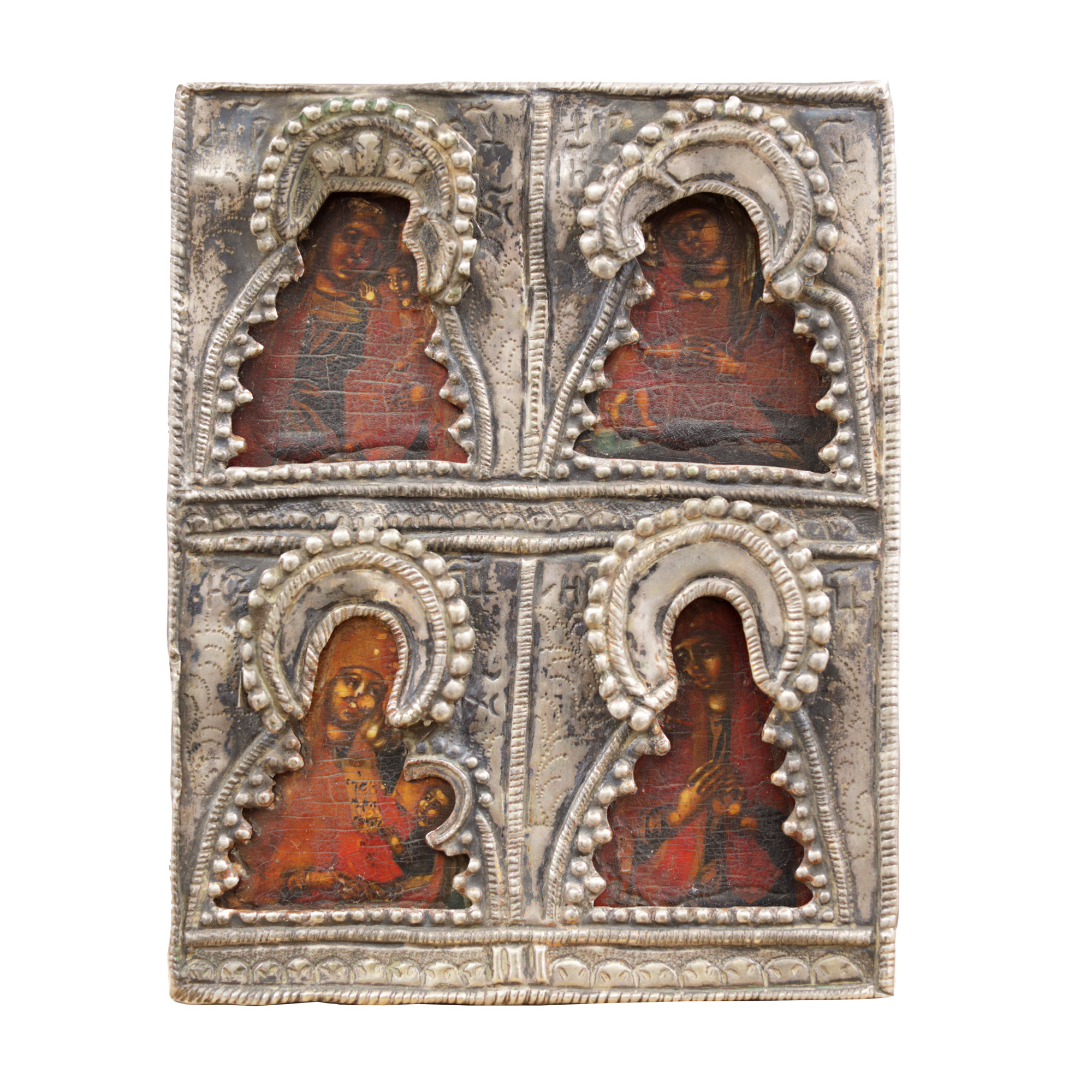 117. Icoană pe lemn, cu ferecătură din argint, în patru registre, ”Maica Domnului cu Pruncul în patru tipuri iconografice”, școală rusească, sfârșitul sec. XVIII - începutul sec. XIX