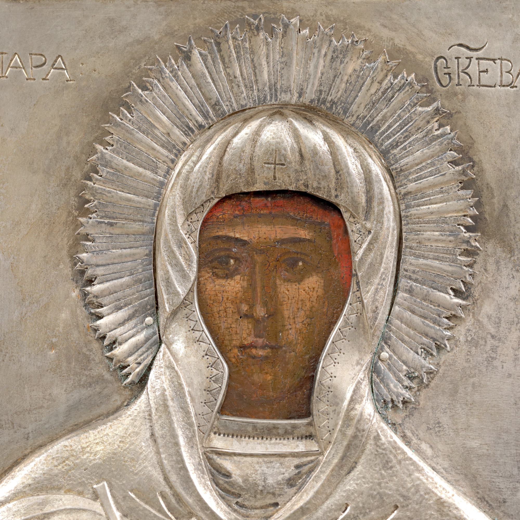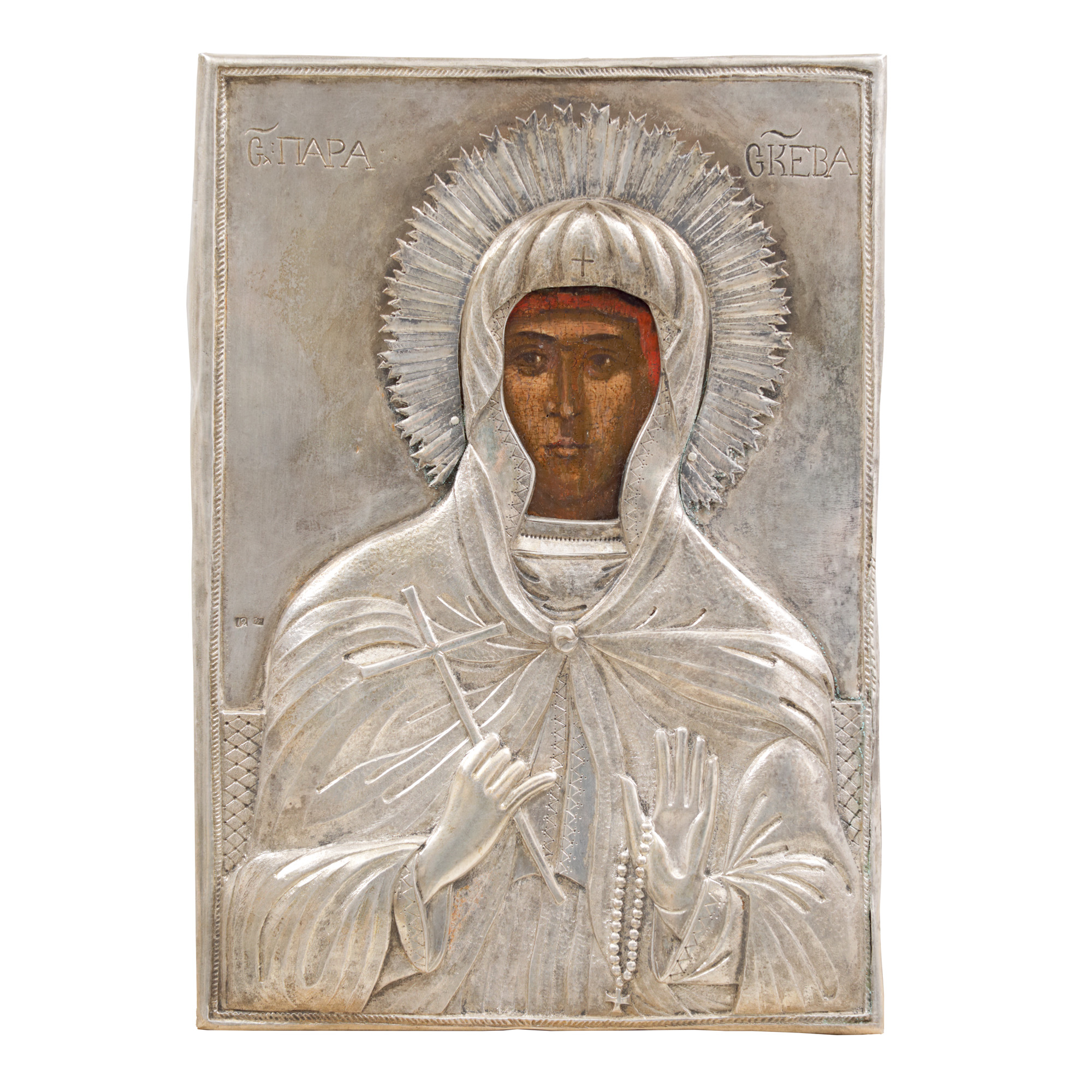 125. Icoană pe lemn, cu ferecătură din argint, ”Sfânta Paraschiva”, școală românească, prima jumătate a sec. XIX