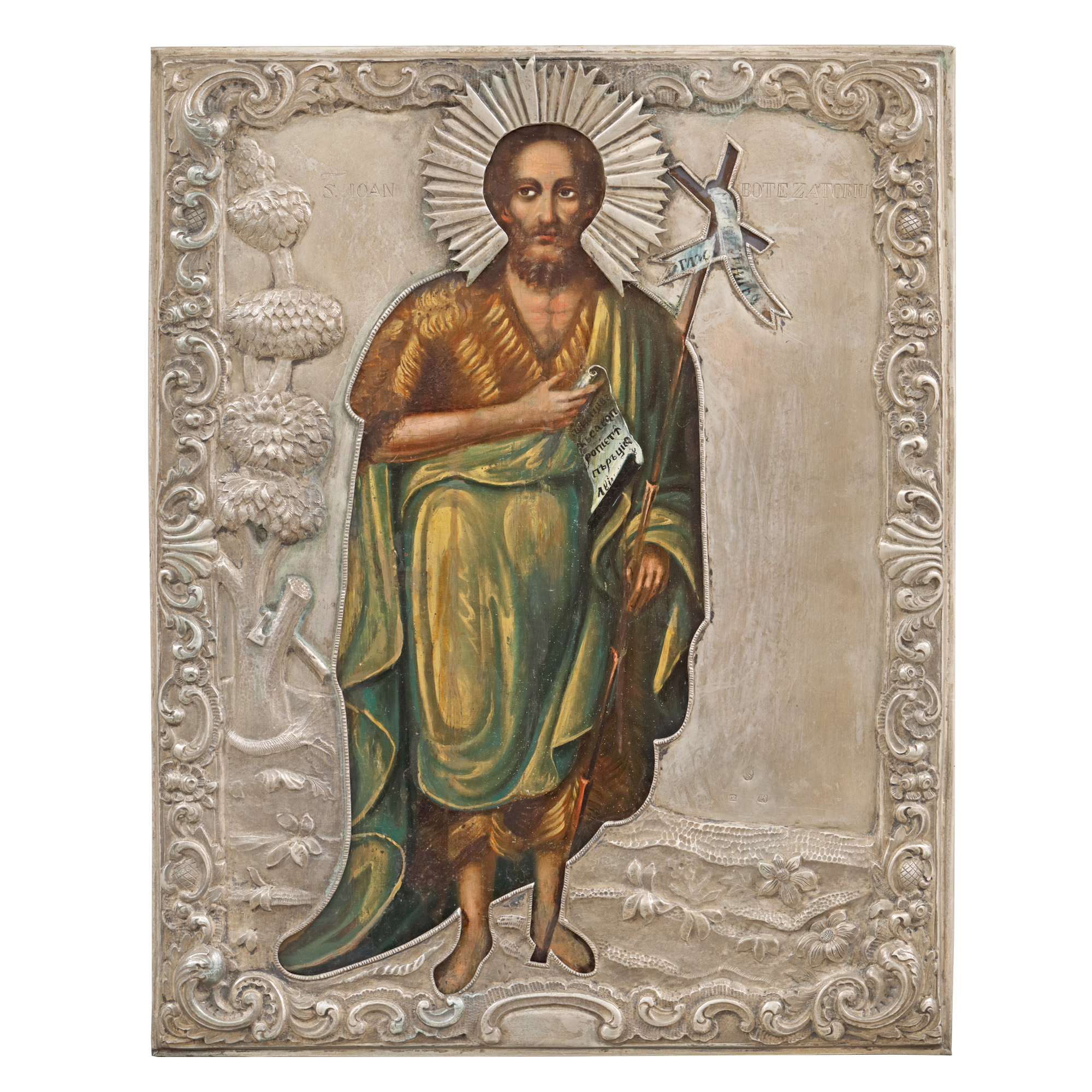 114. Icoană pe lemn, cu ferecătură din argint, ”Sfântul Ioan Botezătorul”, școală românească, probabil Căldărușani, jumătatea sec. XIX, piesă rară, de coleție
